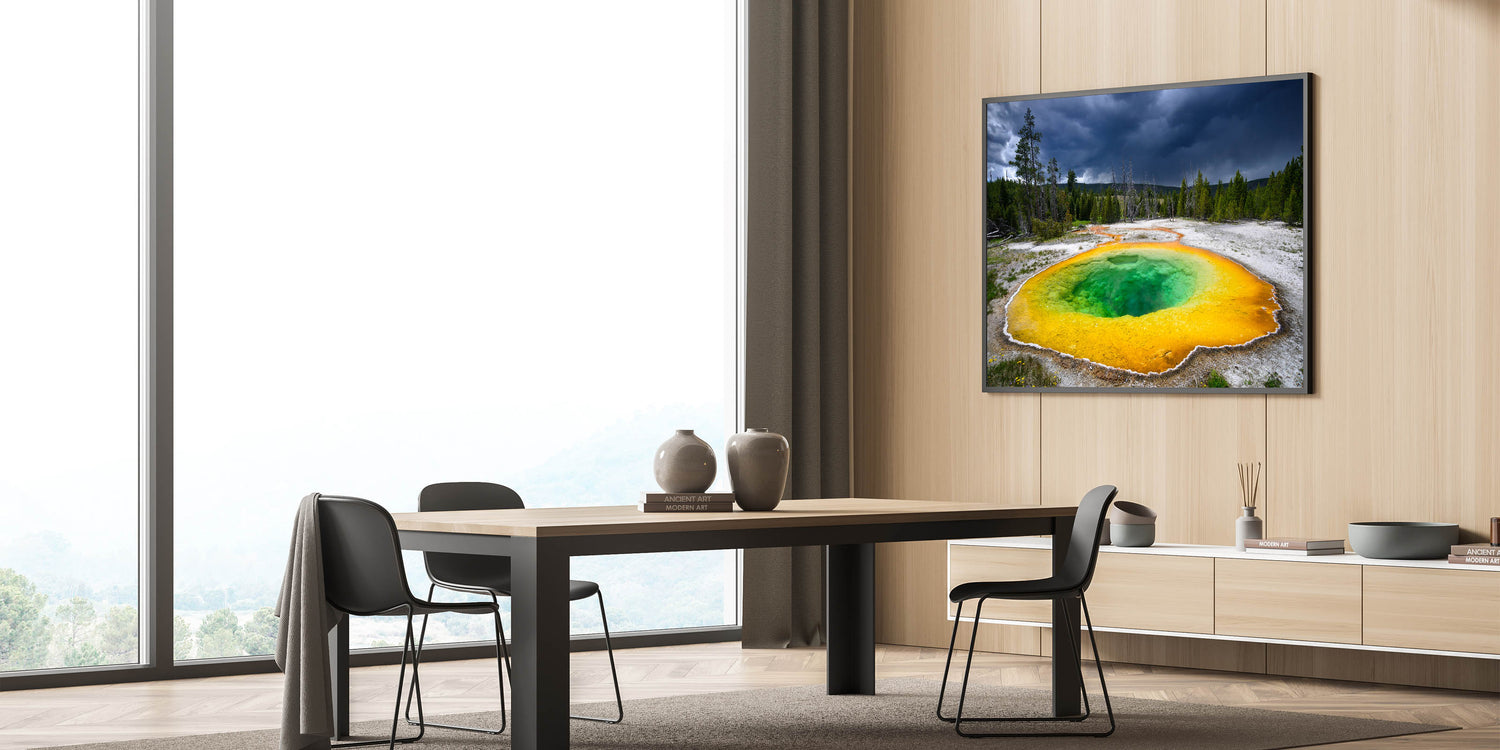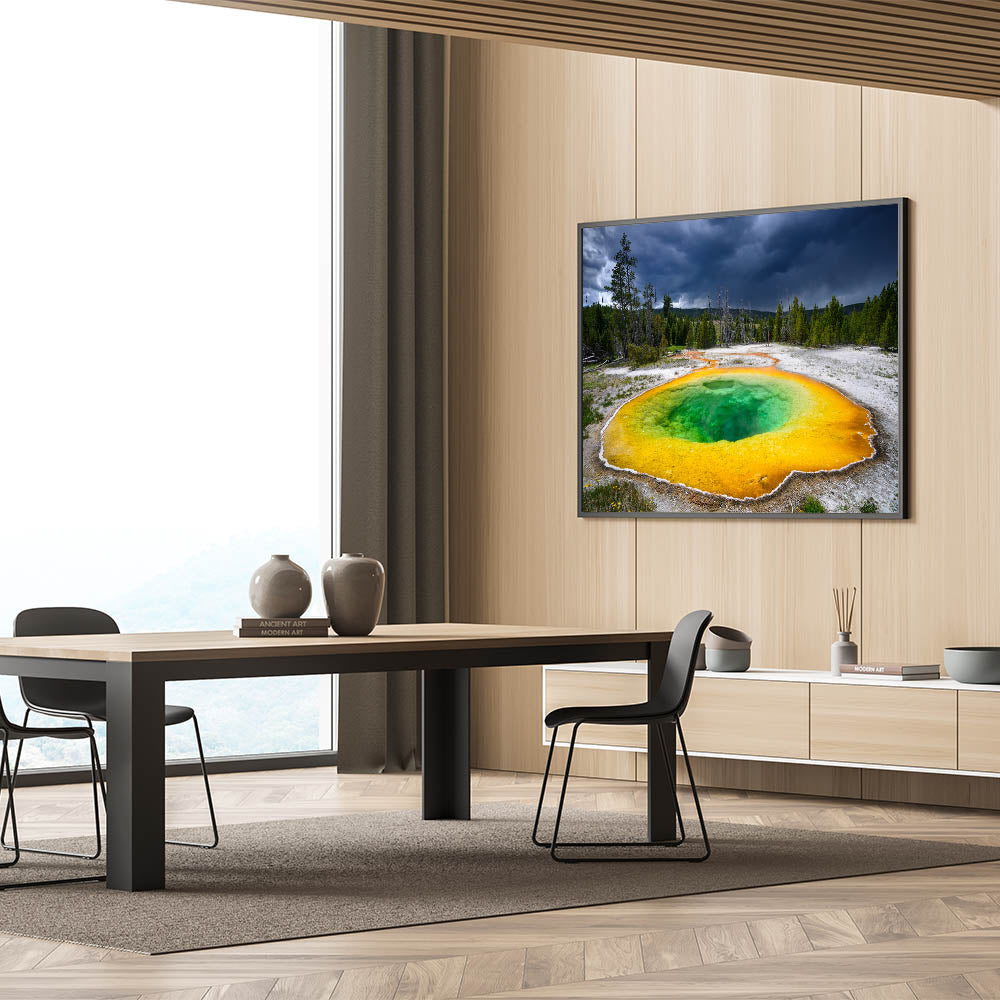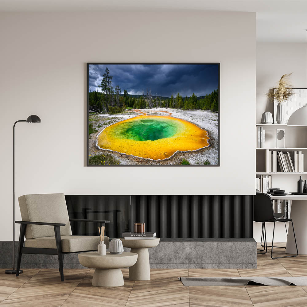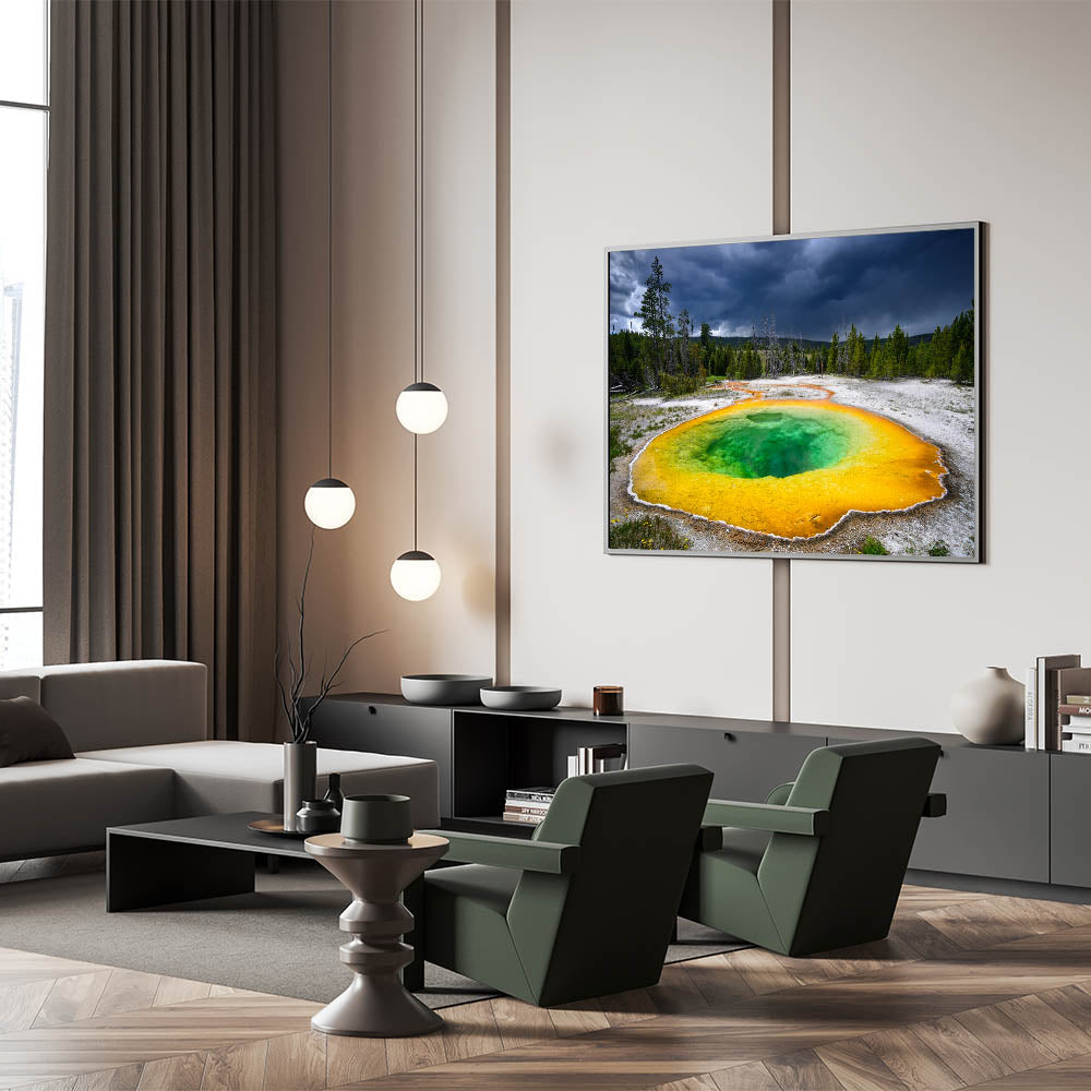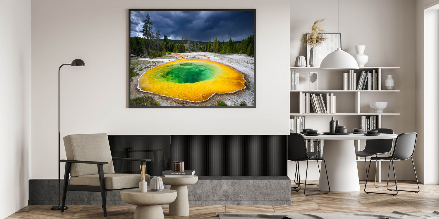 Add a burst of vibrant color to your space with this stunning Yellowstone National Park wall art. Featuring the captivating Morning Glory Pool, this piece of scenic landscape art showcases the vibrant greens and oranges of Yellowstone’s famous hot spring. The intricate details and vivid hues are perfectly captured in this Yellowstone photography, available in Yellowstone giclee prints, canvas, framed, or acrylic glass.