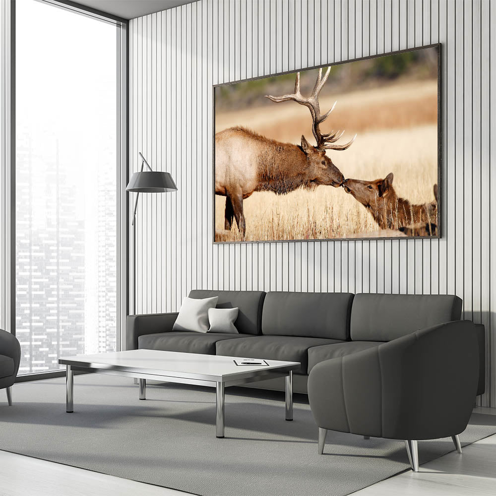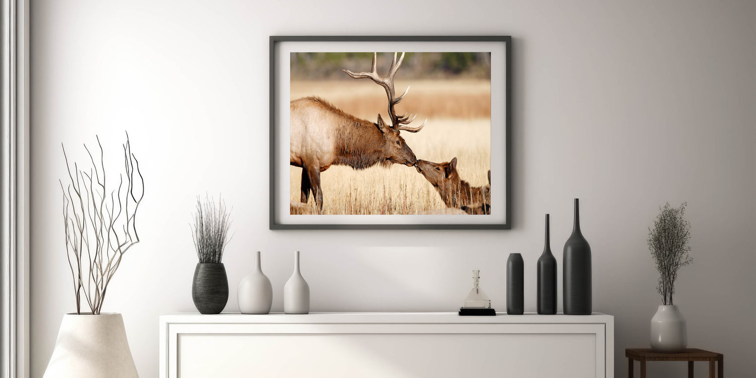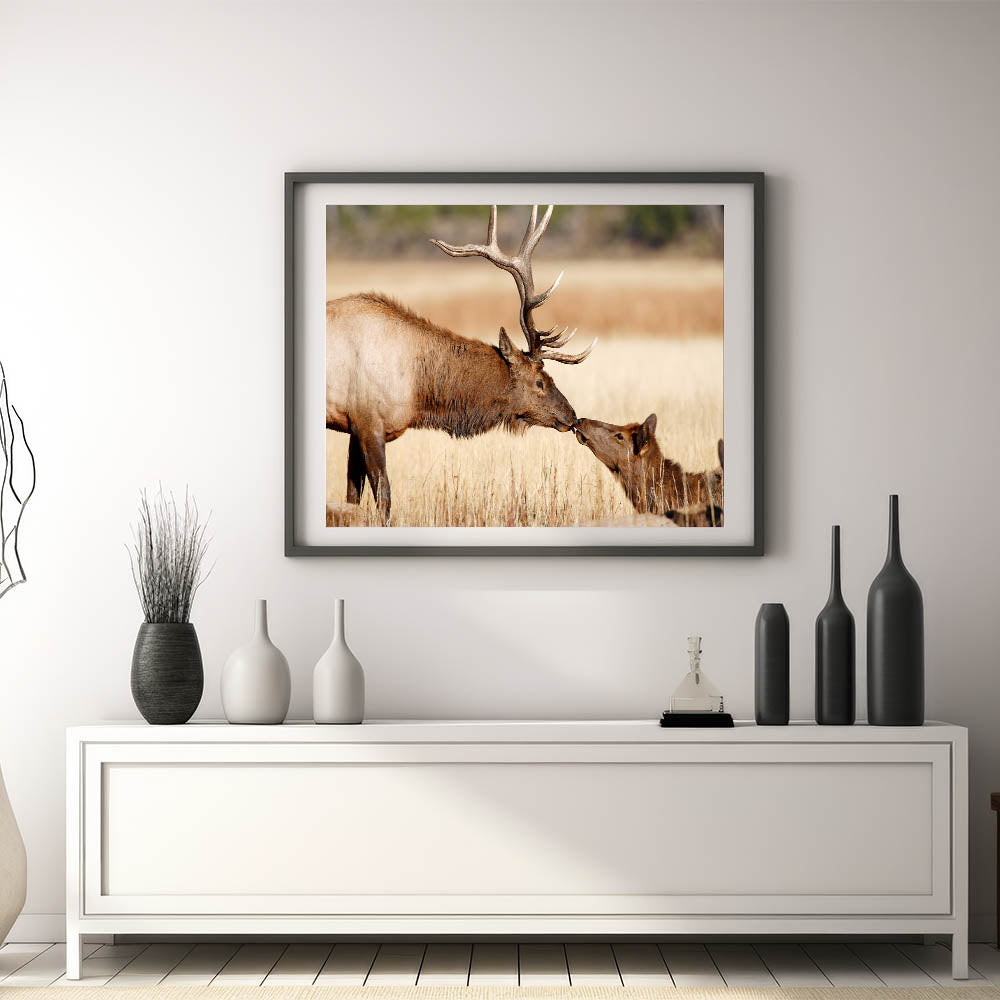 This captivating Yellowstone National Park wall art captures a touching moment between two elk in their natural habitat. The stunning detail of this Yellowstone poster print brings the majestic wildlife of the park into your home, celebrating the grace and beauty of these incredible creatures. Whether you're looking to enhance your home decor or gift it to a nature lover, this piece of wildlife photography of Yellowstone is an ideal choice.