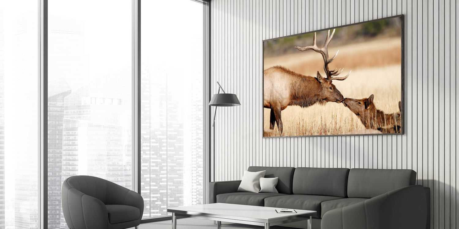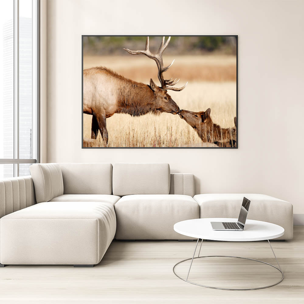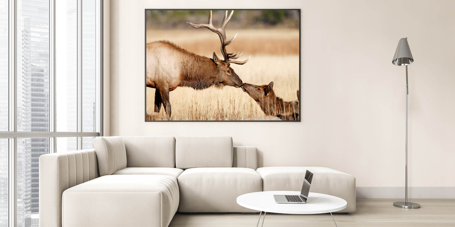 This captivating Yellowstone National Park wall art captures a touching moment between two elk in their natural habitat. The stunning detail of this Yellowstone poster print brings the majestic wildlife of the park into your home, celebrating the grace and beauty of these incredible creatures. Whether you're looking to enhance your home decor or gift it to a nature lover, this piece of wildlife photography of Yellowstone is an ideal choice.