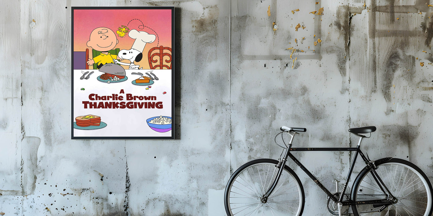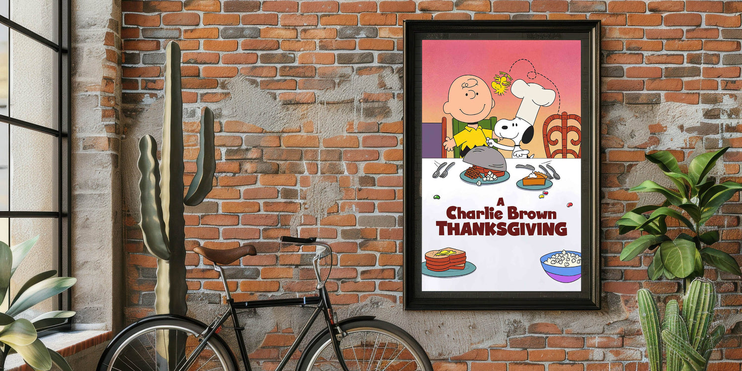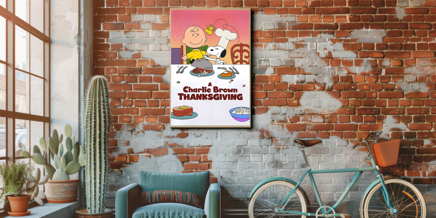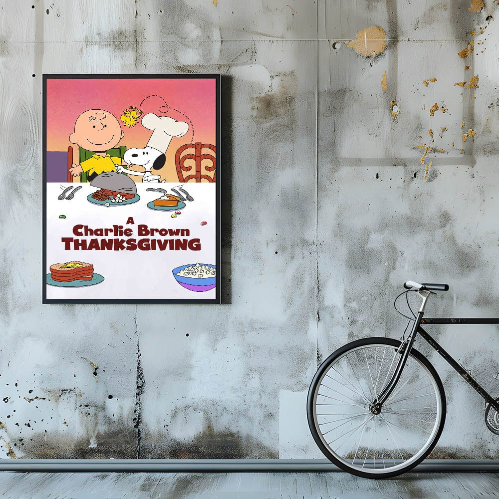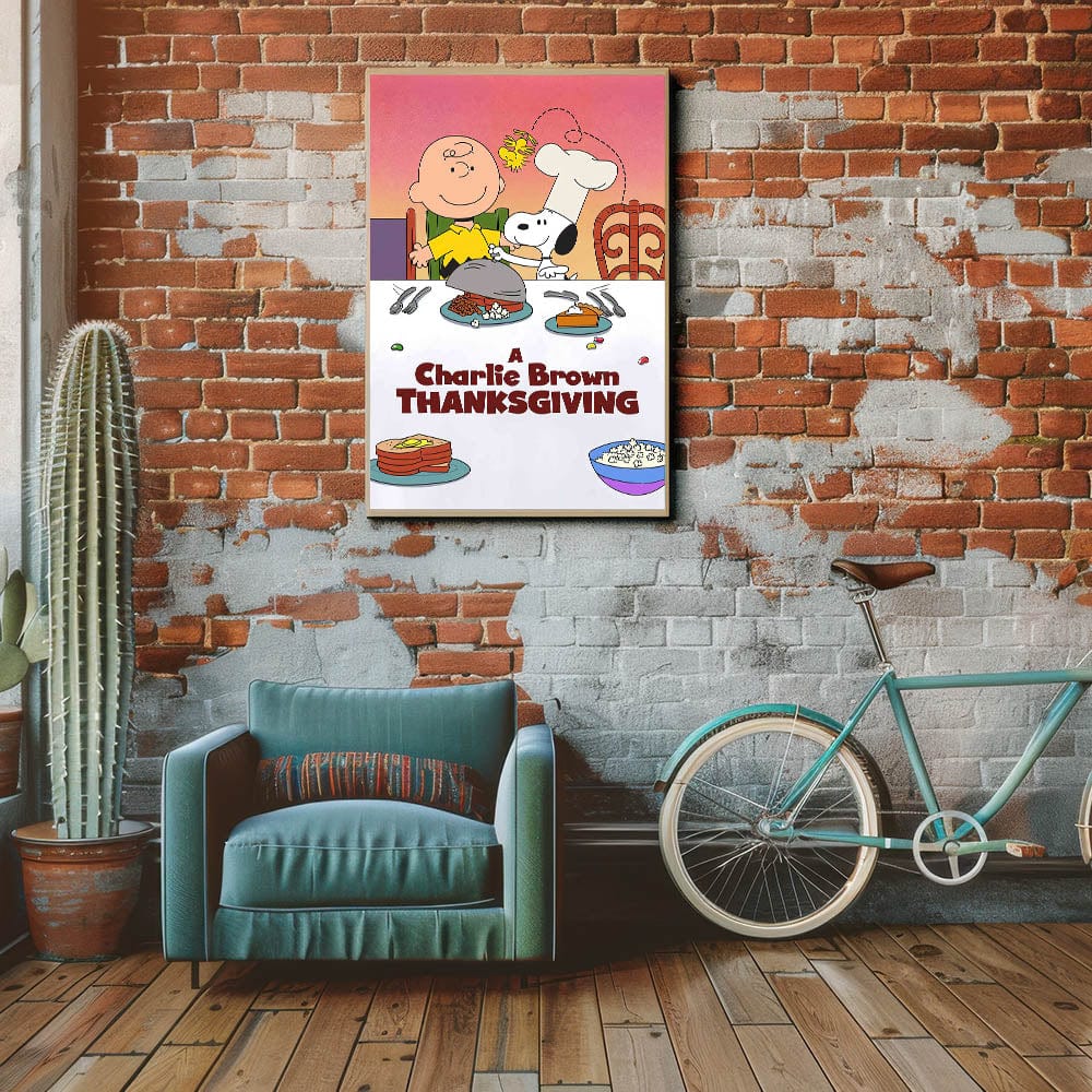 This 1970s movie decor is a delightful way to bring timeless holiday cheer into your home, whether in a child's room, kitchen, or entertainment space. Ideal for Peanuts lovers and those who appreciate retro cinema posters, this artwork captures the spirit of friendship, gratitude, and holiday fun.