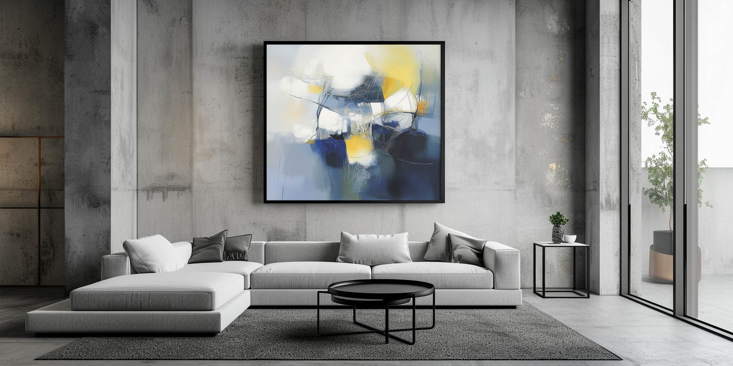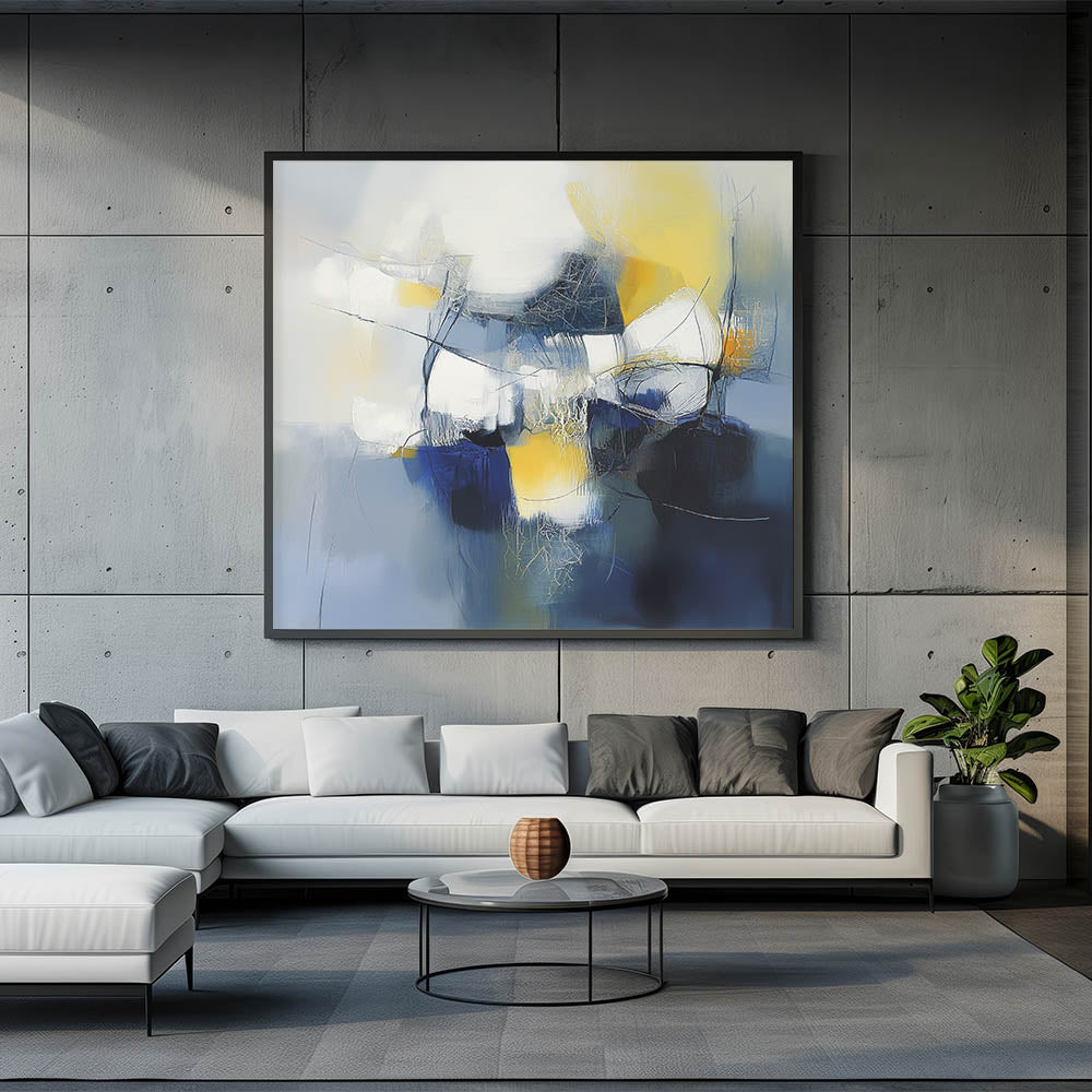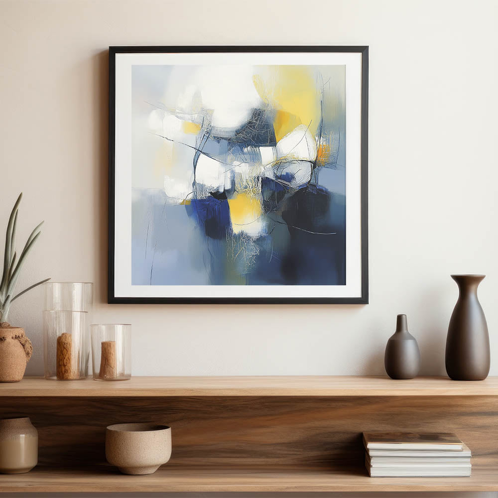 Bring energy and sophistication to your space with these abstract art prints, featuring a stunning interplay of navy blue, golden yellow, white, and gray in a richly textured and layered composition. This piece from the Modern Abstract Collection is full of movement, emotion, and contrast—making it an expressive addition to any modern interior.