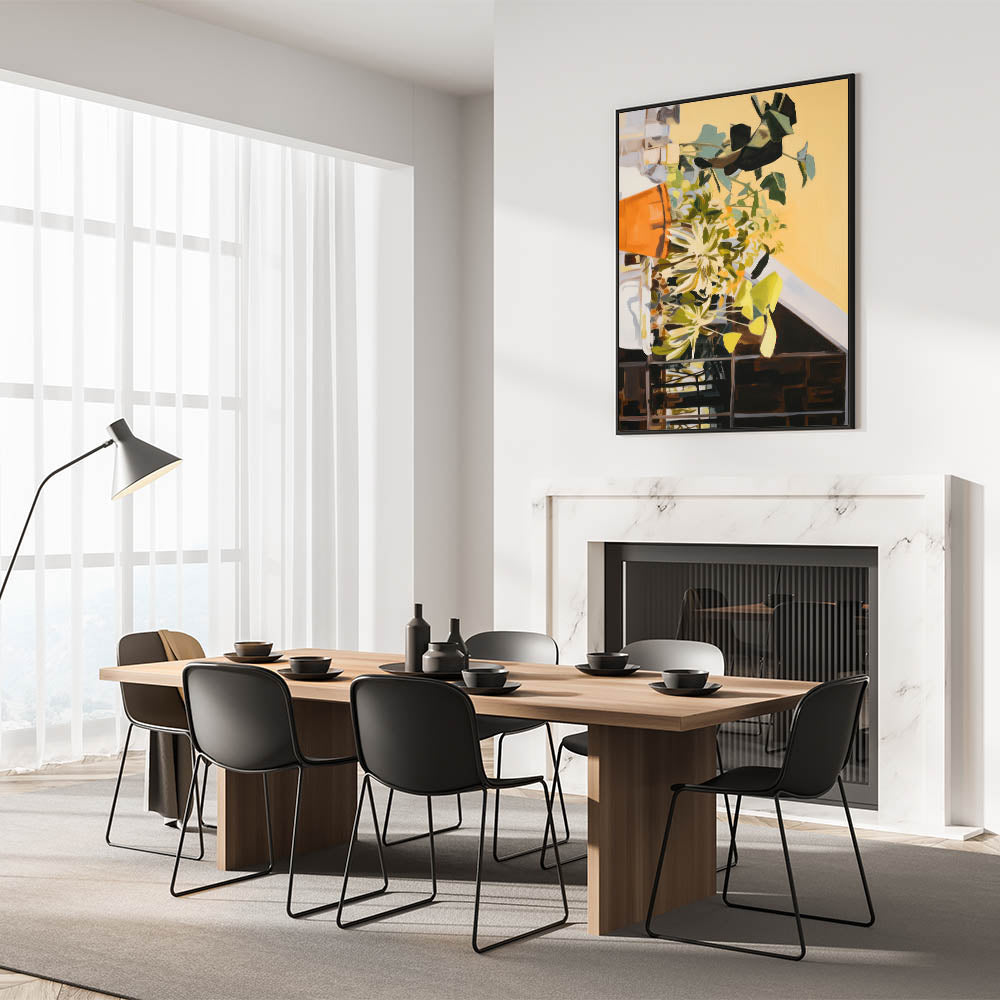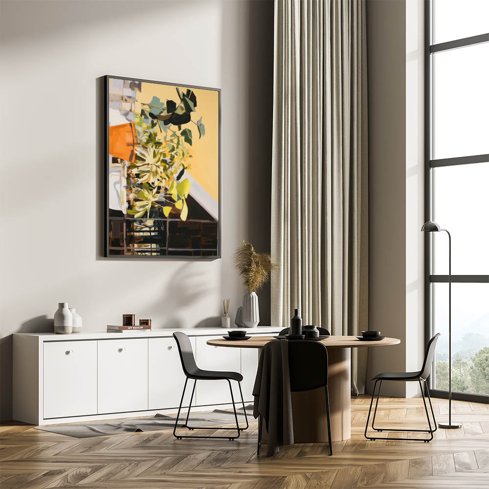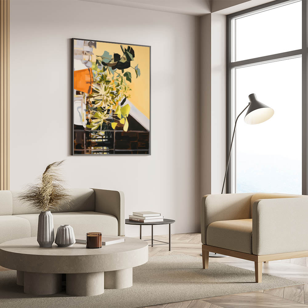 This abstract electric wall art piece presents a lively and dynamic composition, featuring an array of plants and organic shapes in warm hues of yellow, orange, and green. The vibrant arrangement, combined with flowing brushstrokes, creates a sense of movement and energy, making it an ideal choice for modern interiors that seek to enliven their space. The combination of bright colors and abstract forms gives this artwork a playful yet sophisticated aesthetic, perfect for living rooms, dining areas, or offices looking for a bold visual statement. This piece adds an electric touch to any setting, inviting viewers into a world where nature meets abstraction.