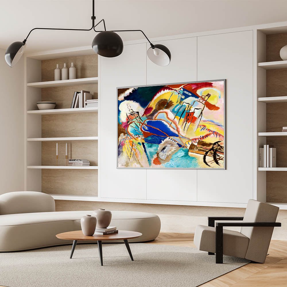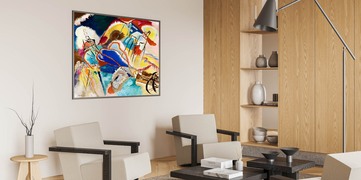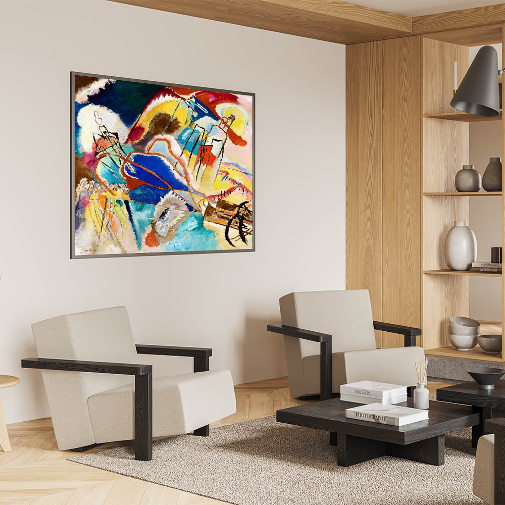 Ignite your space with the bold and dynamic energy of abstract expressionism with this modern wall art inspired by Wassily Kandinsky’s vibrant style. Featuring an explosion of colors in hues of blue, yellow, red, and green, this artwork uses abstract shapes and flowing lines to evoke emotion and movement. Ideal for contemporary decor, this unique modern art piece transforms any room with its spirited composition and expressive forms.