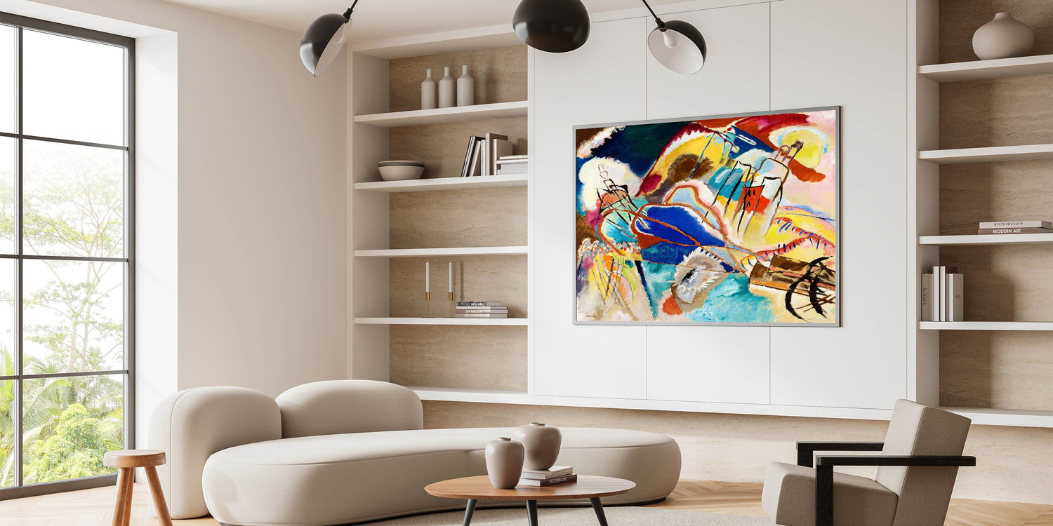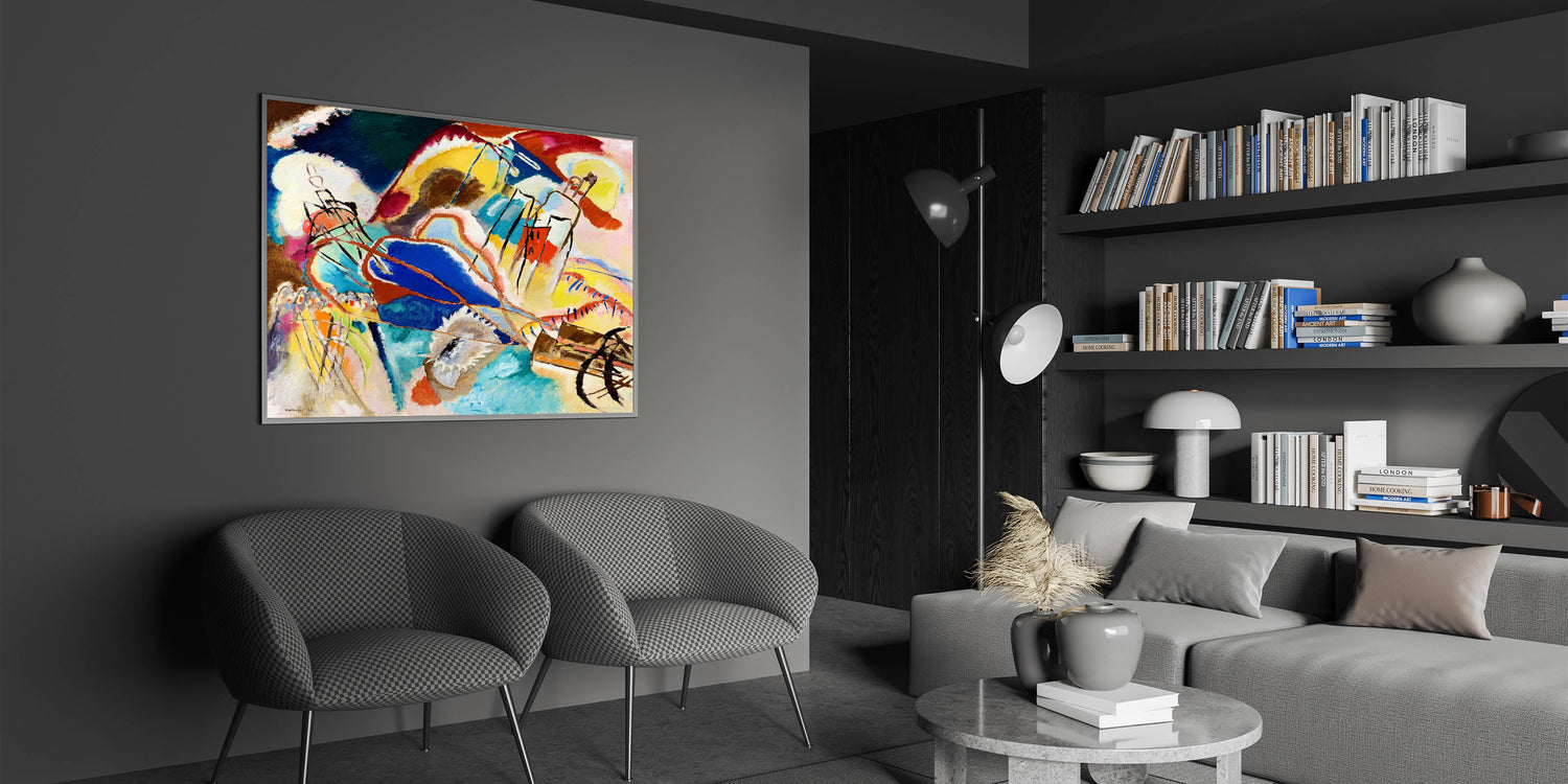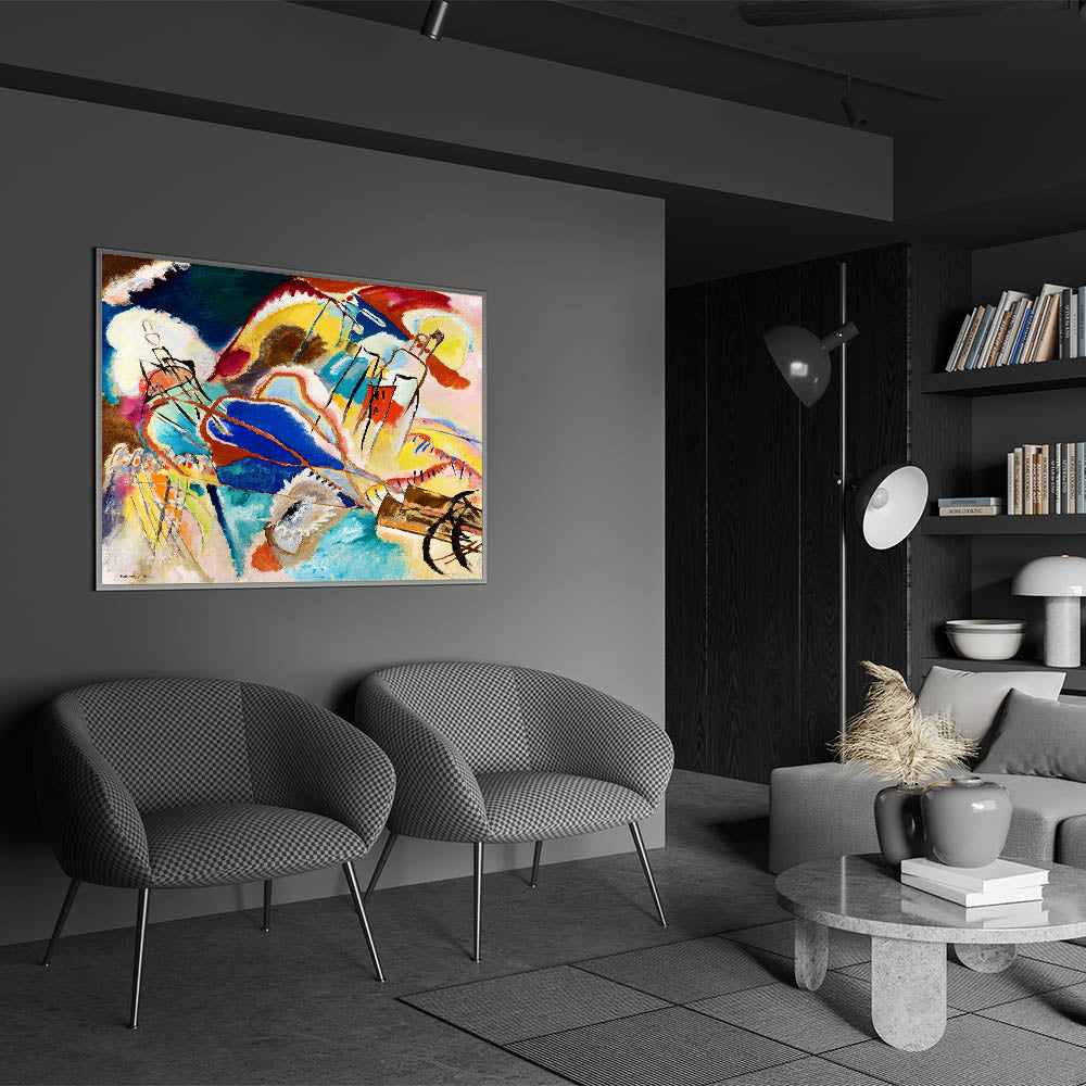 Ignite your space with the bold and dynamic energy of abstract expressionism with this modern wall art inspired by Wassily Kandinsky’s vibrant style. Featuring an explosion of colors in hues of blue, yellow, red, and green, this artwork uses abstract shapes and flowing lines to evoke emotion and movement. Ideal for contemporary decor, this unique modern art piece transforms any room with its spirited composition and expressive forms.