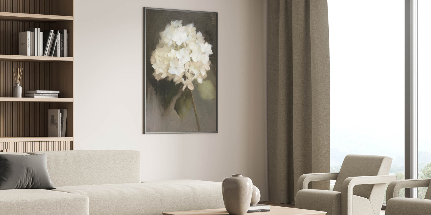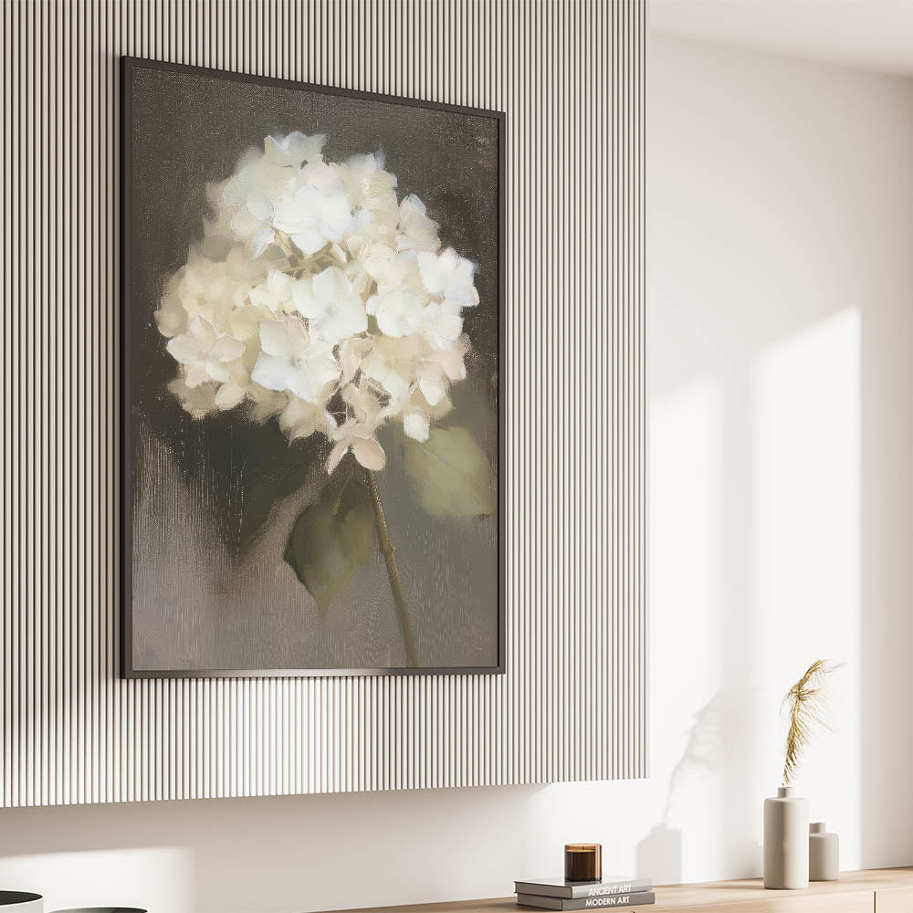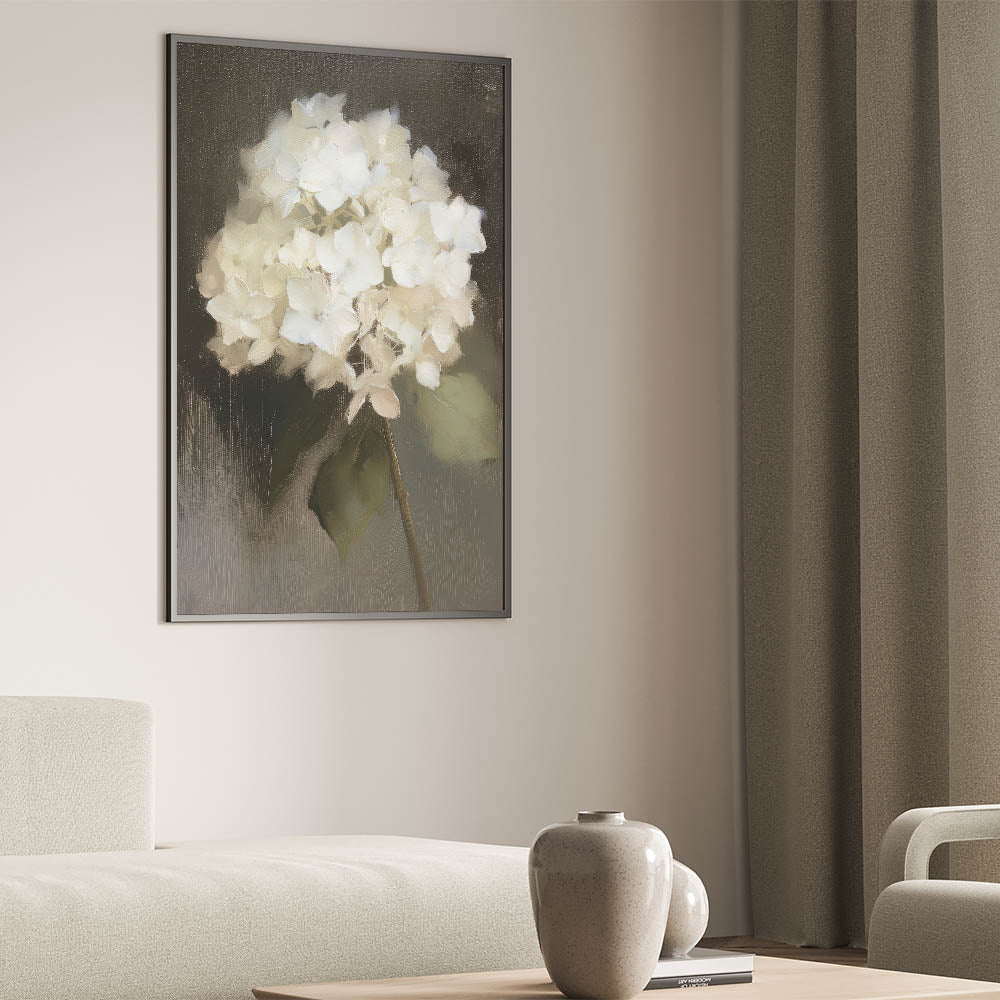 Transform your space with this exquisite Abstract Floral Canvas, showcasing a delicate arrangement of white hydrangeas set against a rich olive-toned background. The intricate brushstrokes capture the subtle interplay of light and texture, making this artwork a sophisticated and serene addition to any room.