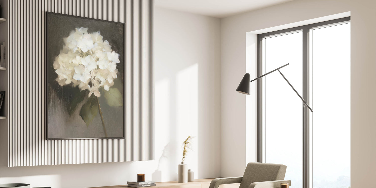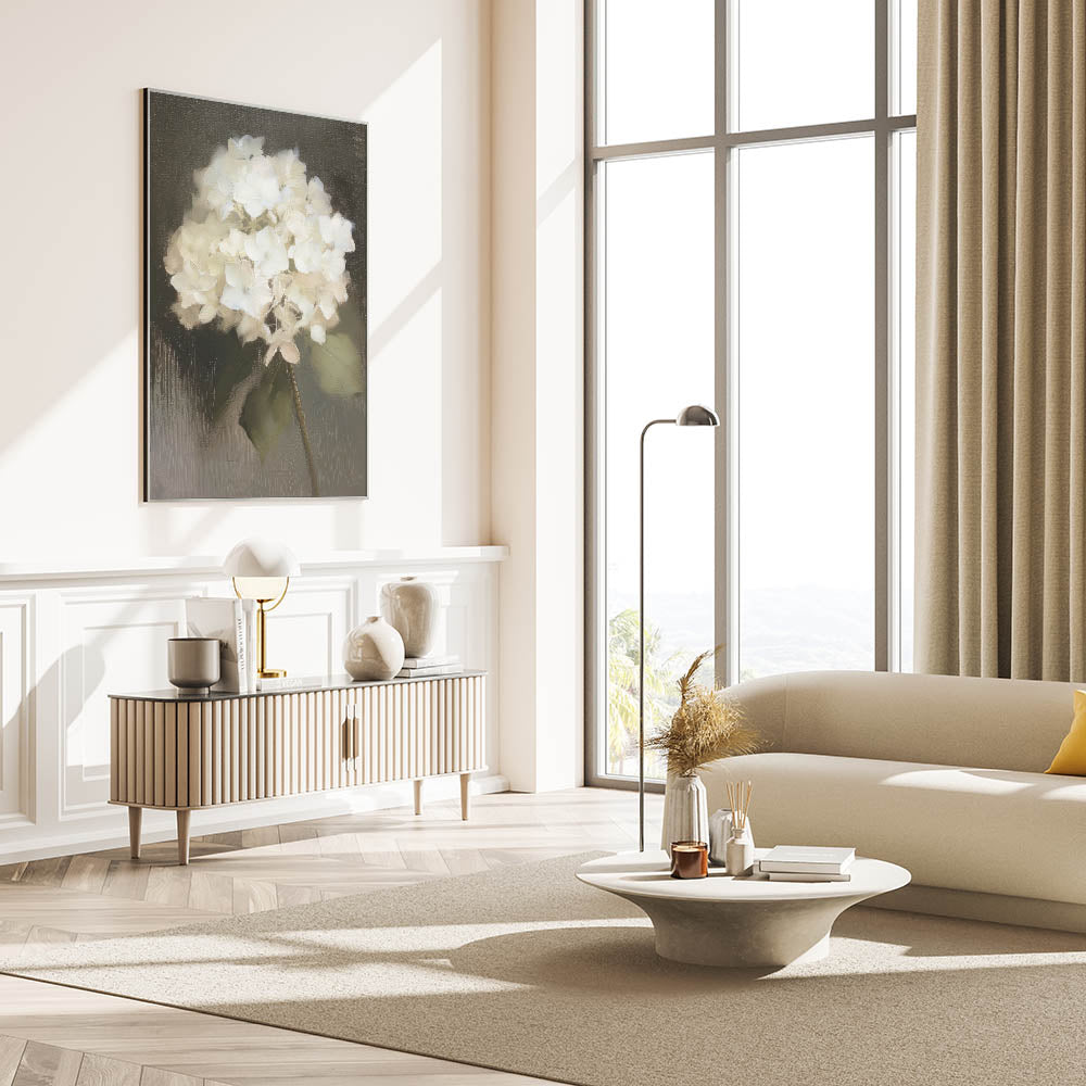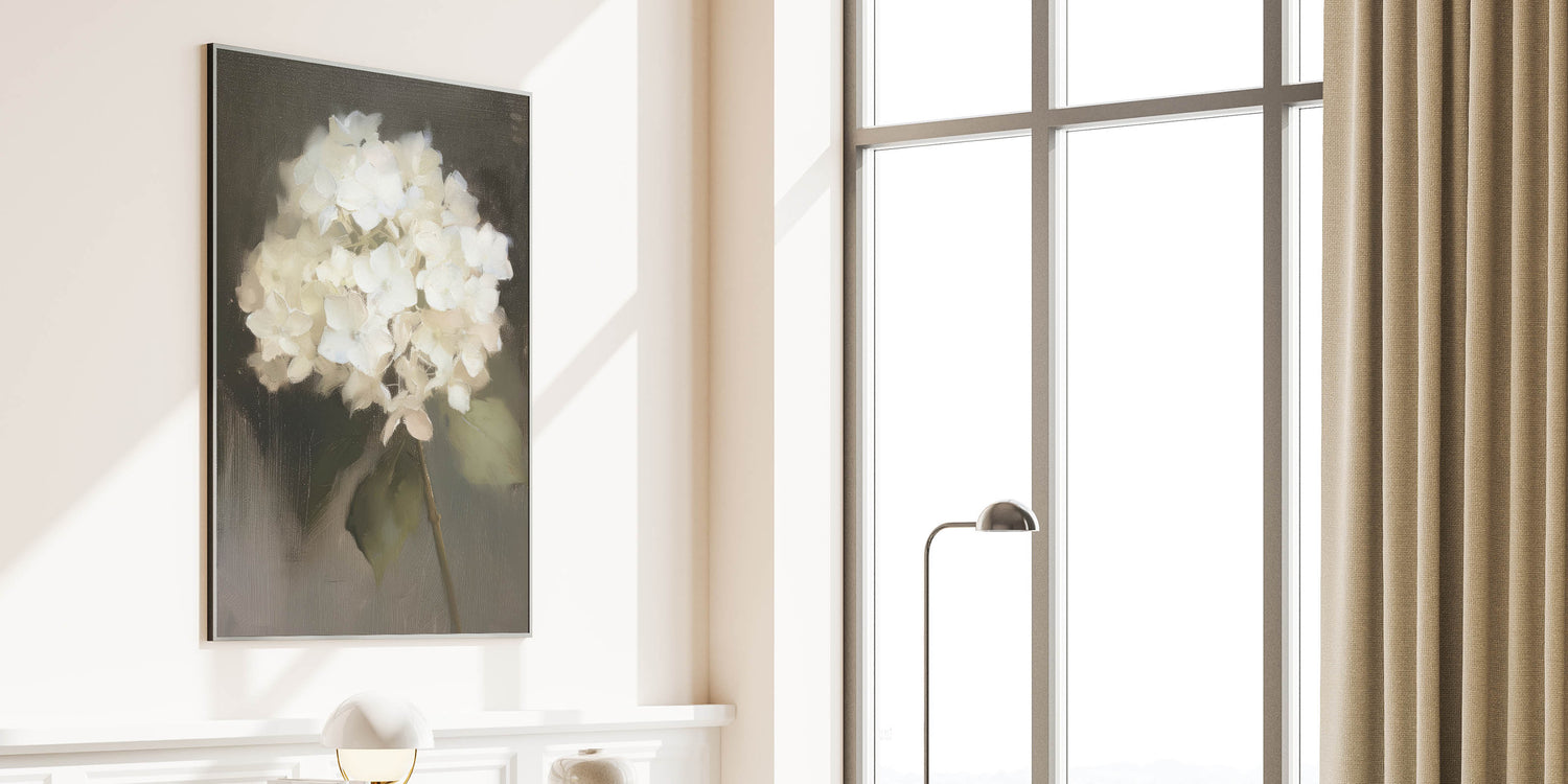 Transform your space with this exquisite Abstract Floral Canvas, showcasing a delicate arrangement of white hydrangeas set against a rich olive-toned background. The intricate brushstrokes capture the subtle interplay of light and texture, making this artwork a sophisticated and serene addition to any room.