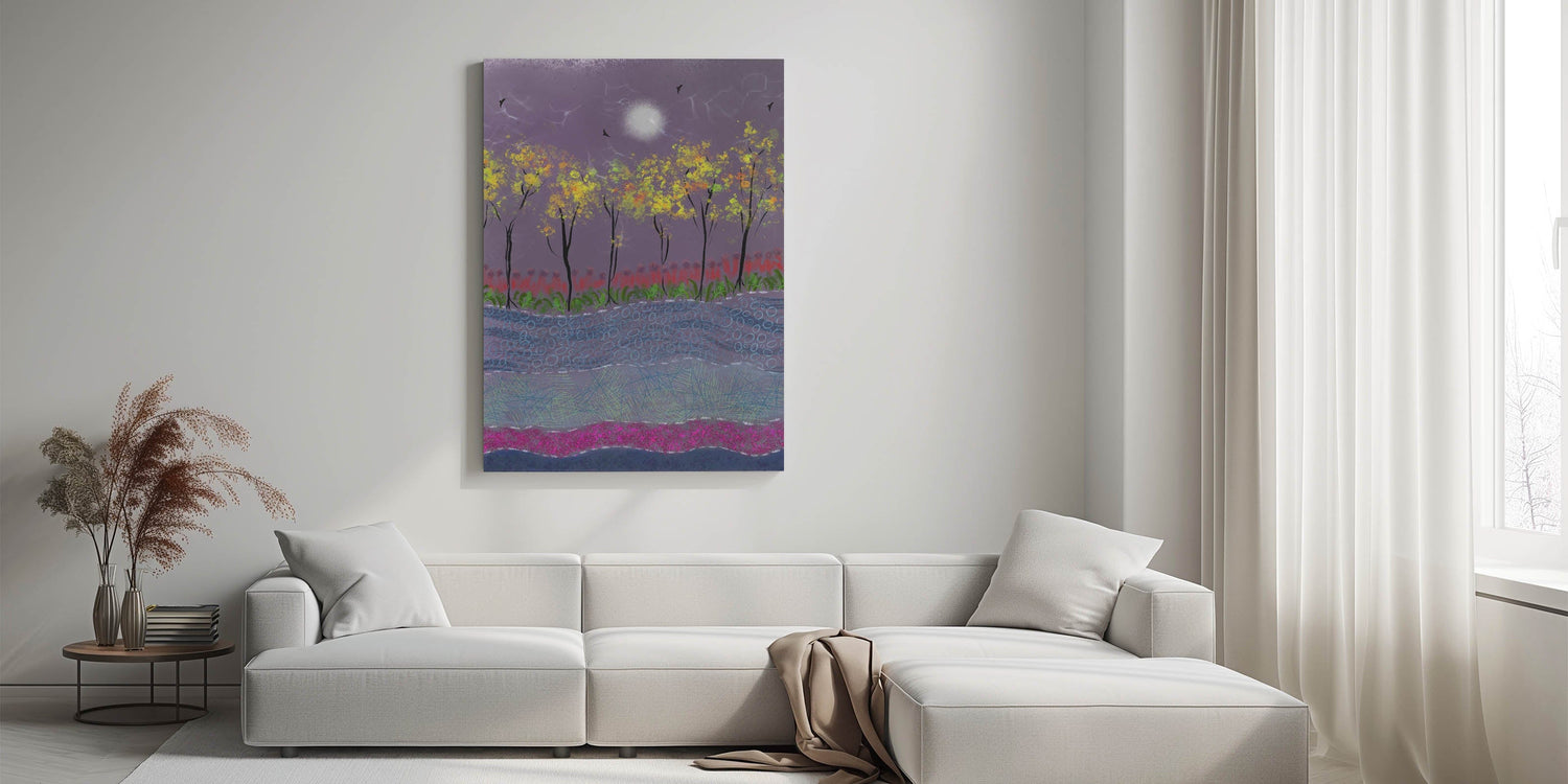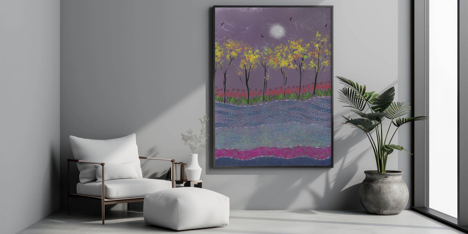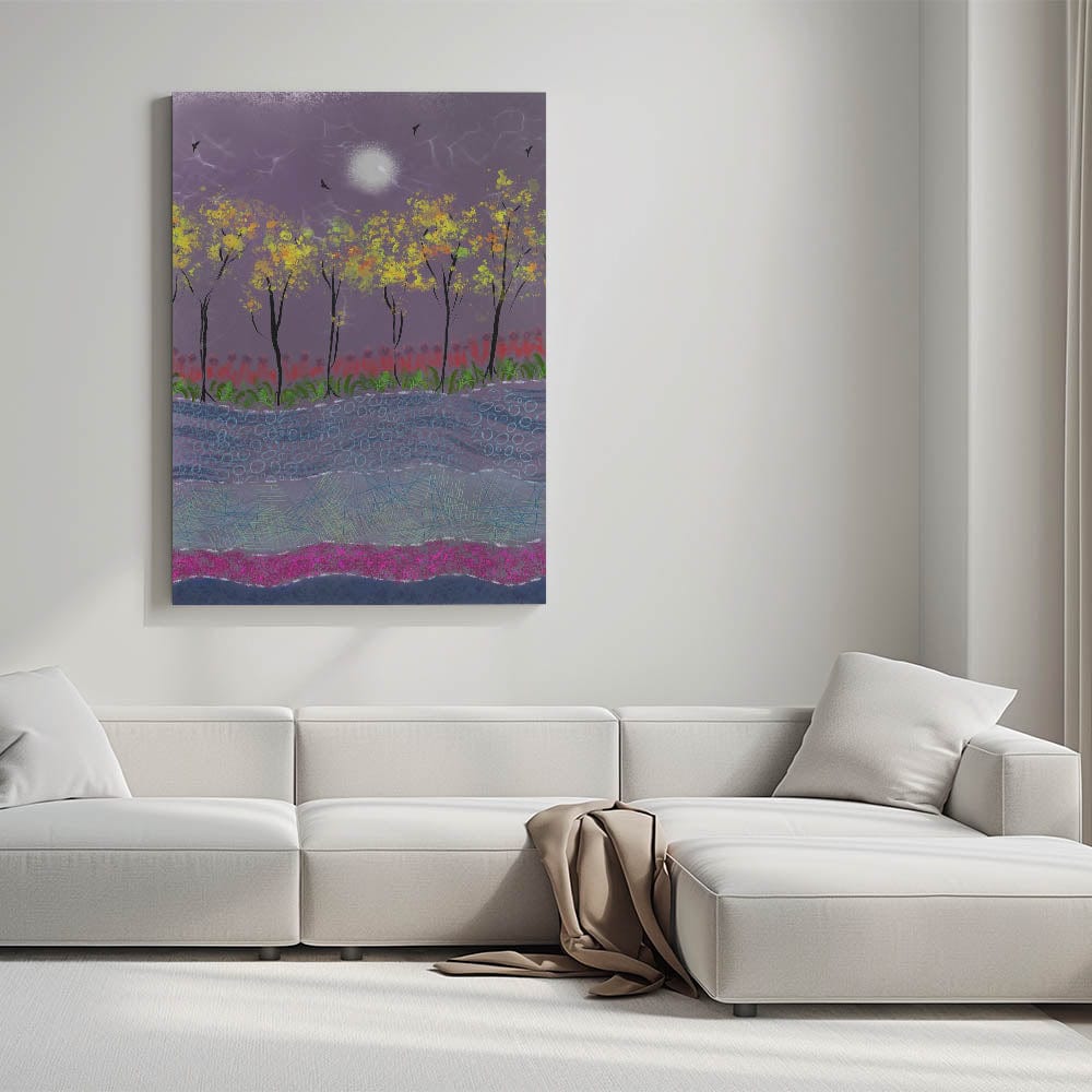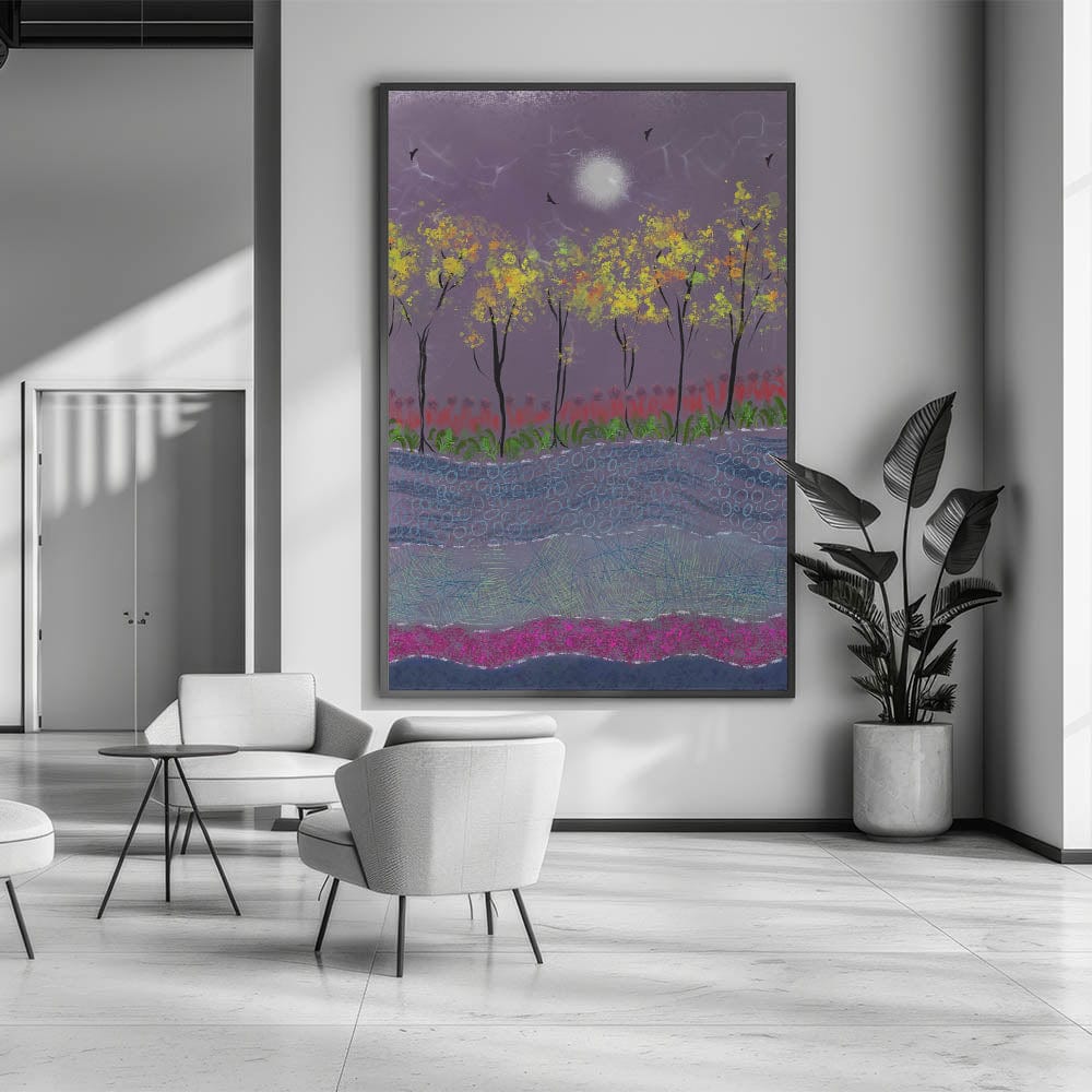 Bring depth and imagination to your space with this Abstract Minimalist Landscape Painting – a vivid scene where nature’s calm meets vibrant artistic expression. Under a glowing moon, abstract trees bloom in shades of yellow, orange, and green, set against a deep violet sky and textured ground layers. This piece captures the spirit of minimalist wilderness while embracing a playful color palette that feels both modern and timeless.