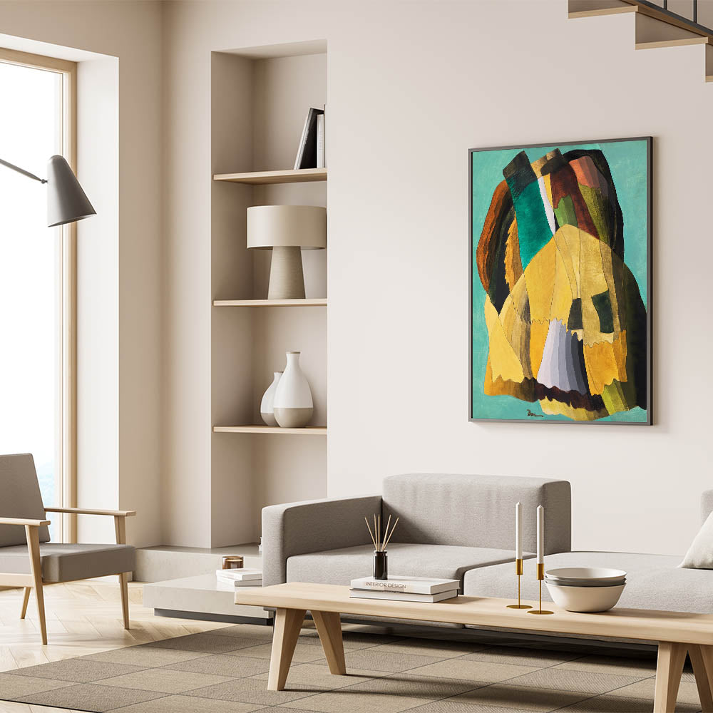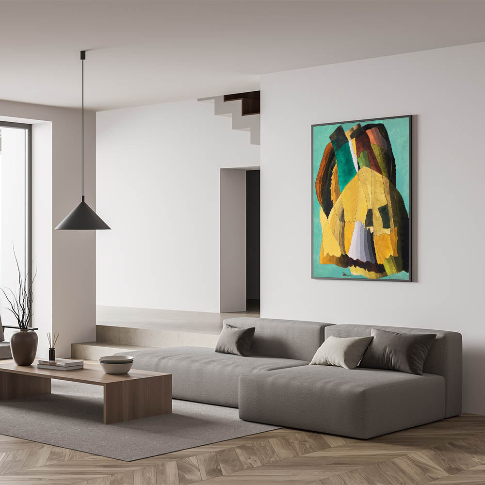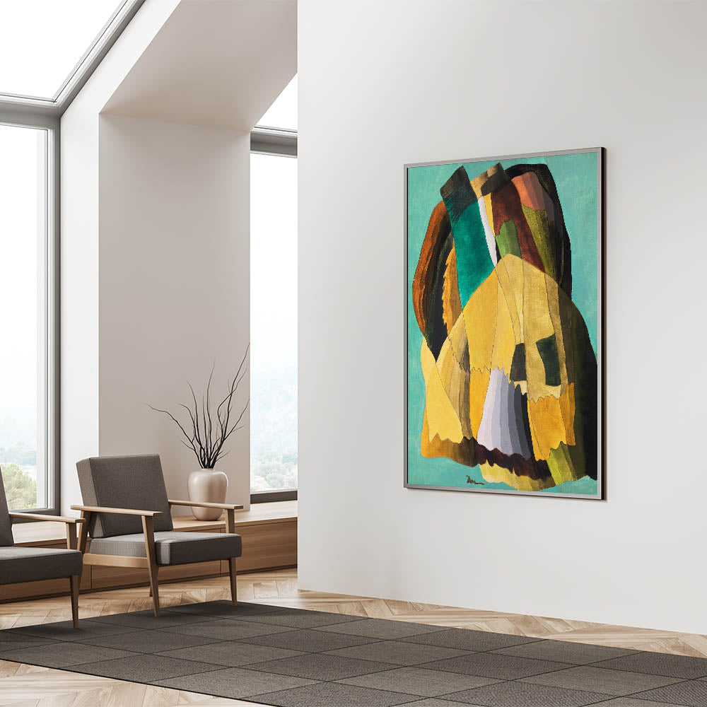 Elevate your home decor with this captivating abstract artwork featuring a dynamic mix of earthy tones, teal, and vibrant yellow. The bold composition showcases layered shapes and textures, creating a mesmerizing blend of color and form. Perfectly embodying Modern Wall Art and Contemporary Art, this piece adds a touch of sophistication to any space.