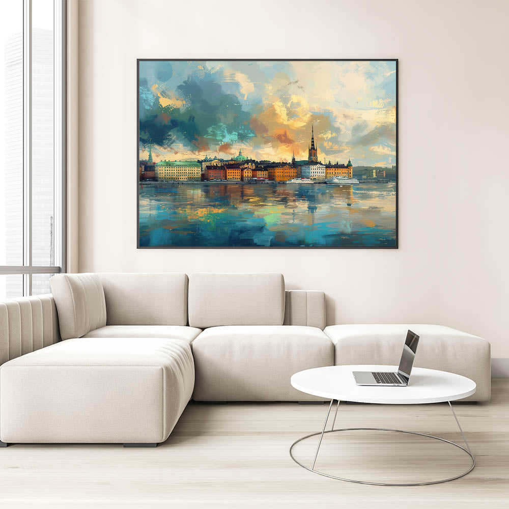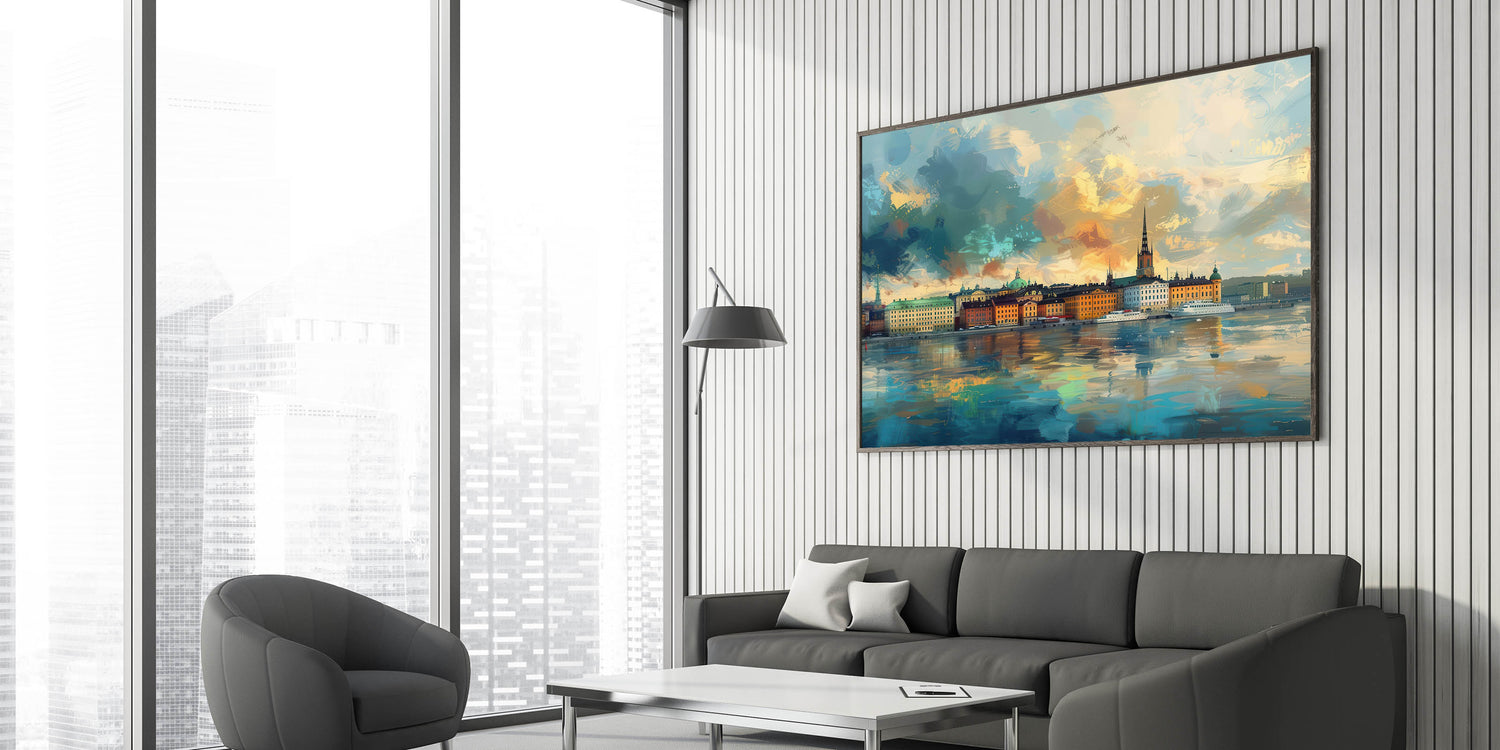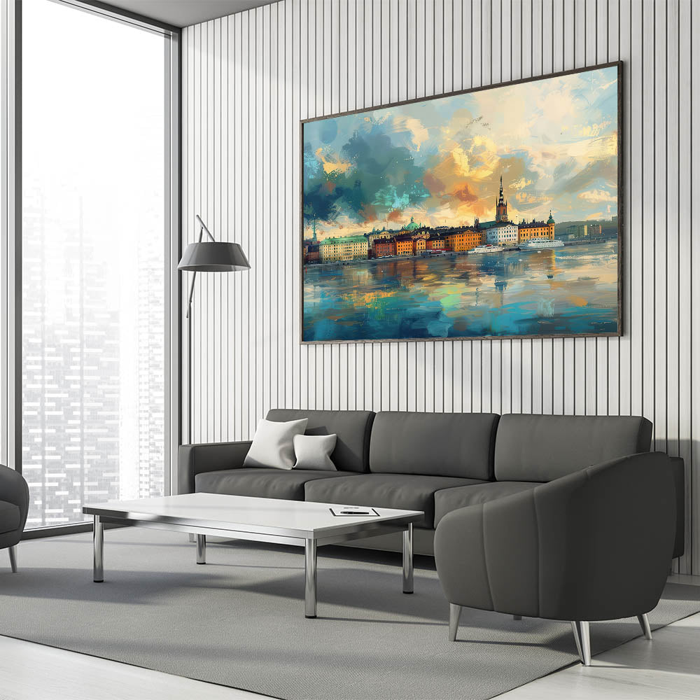 Immerse yourself in the vivid colors and dynamic brushstrokes of this stunning abstract Stockholm cityscape art. This artistic interpretation of Stockholm’s skyline captures the city’s iconic buildings reflected on the water, framed by a sky alive with texture and color. Perfect for those who love abstract art and scenic city views, this unique Stockholm landscape artwork is available as high-quality canvas and framed prints, bringing energy and artistic flair to any space.
