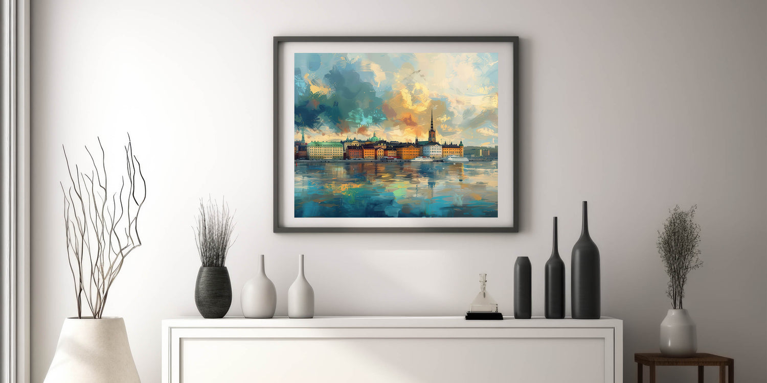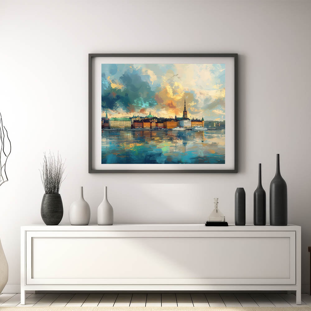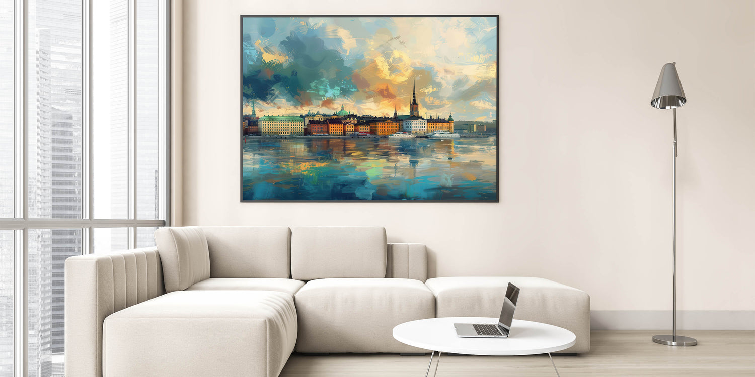 Immerse yourself in the vivid colors and dynamic brushstrokes of this stunning abstract Stockholm cityscape art. This artistic interpretation of Stockholm’s skyline captures the city’s iconic buildings reflected on the water, framed by a sky alive with texture and color. Perfect for those who love abstract art and scenic city views, this unique Stockholm landscape artwork is available as high-quality canvas and framed prints, bringing energy and artistic flair to any space.