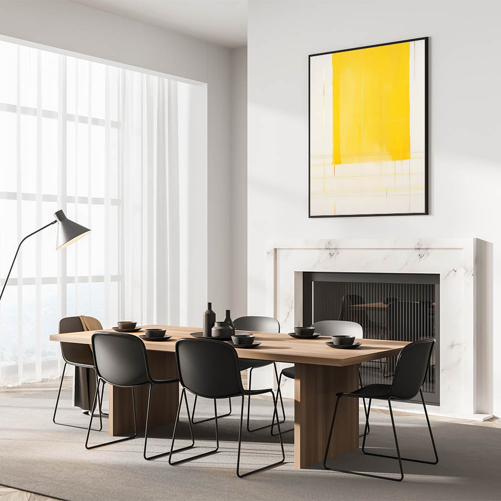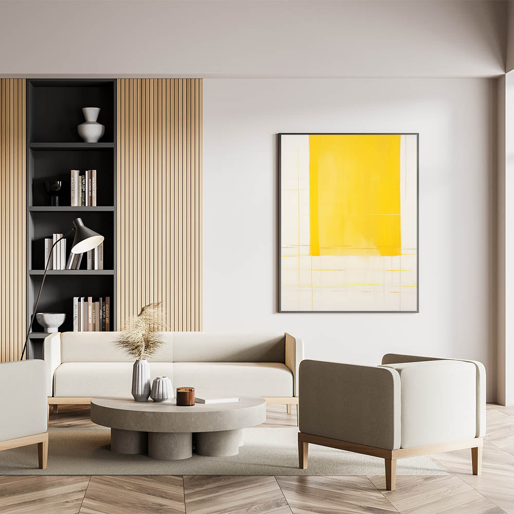 This abstract electric art piece features a minimalist geometric design in vibrant yellow tones, contrasted against a clean white backdrop. The bold vertical block of yellow, combined with subtle linear elements, creates a sense of balance and modernity. Perfect for contemporary spaces, this artwork adds a burst of energy and light, enhancing interiors with its bright and electric presence.