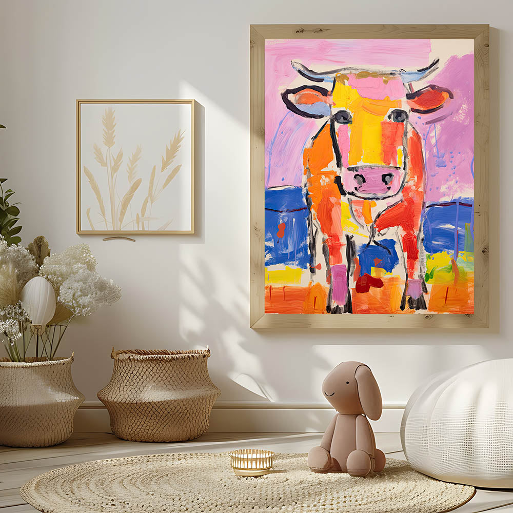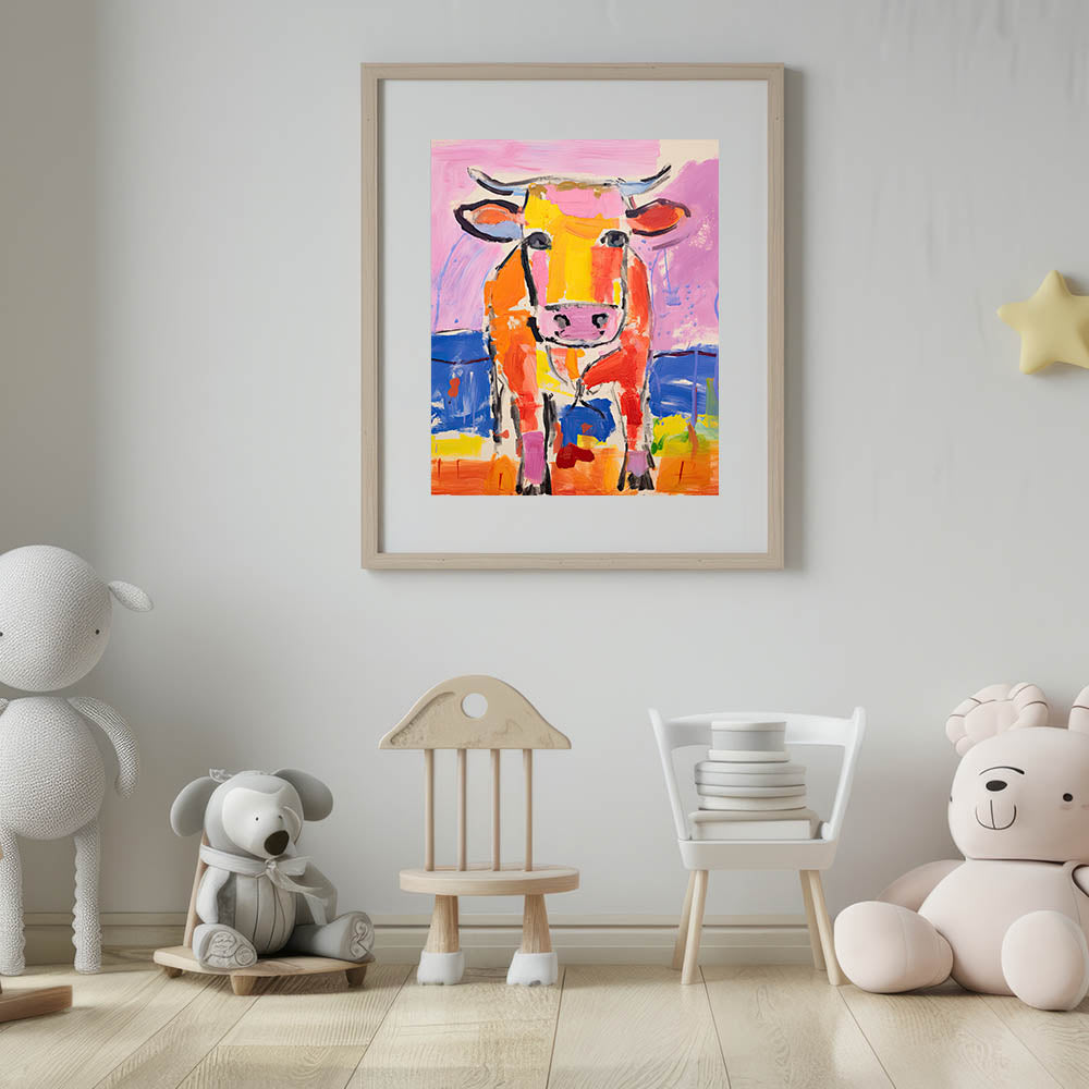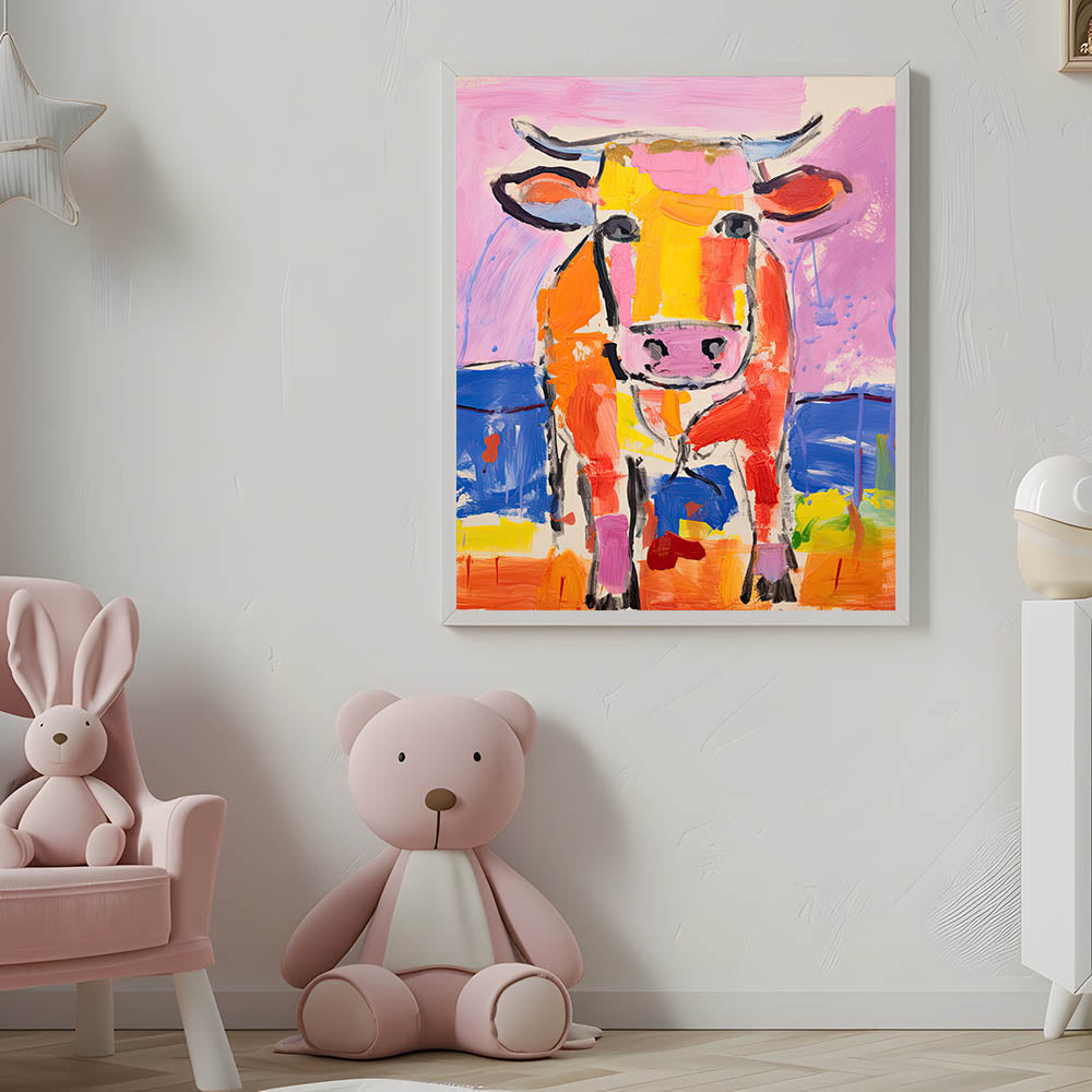 Brighten up your child's space with this Acrylic Glass Art for Kids Rooms, featuring a playful and vibrant cow in a bold mix of colors. This Kids Room Wall Art adds a fun and artistic touch to nurseries, playrooms, and children's bedrooms, making it a standout piece in any animal-themed décor.