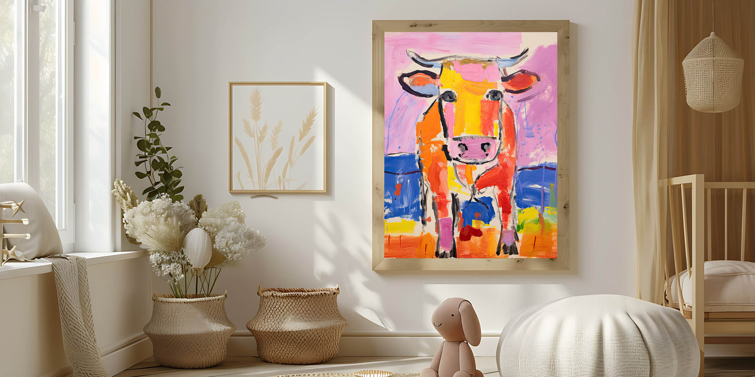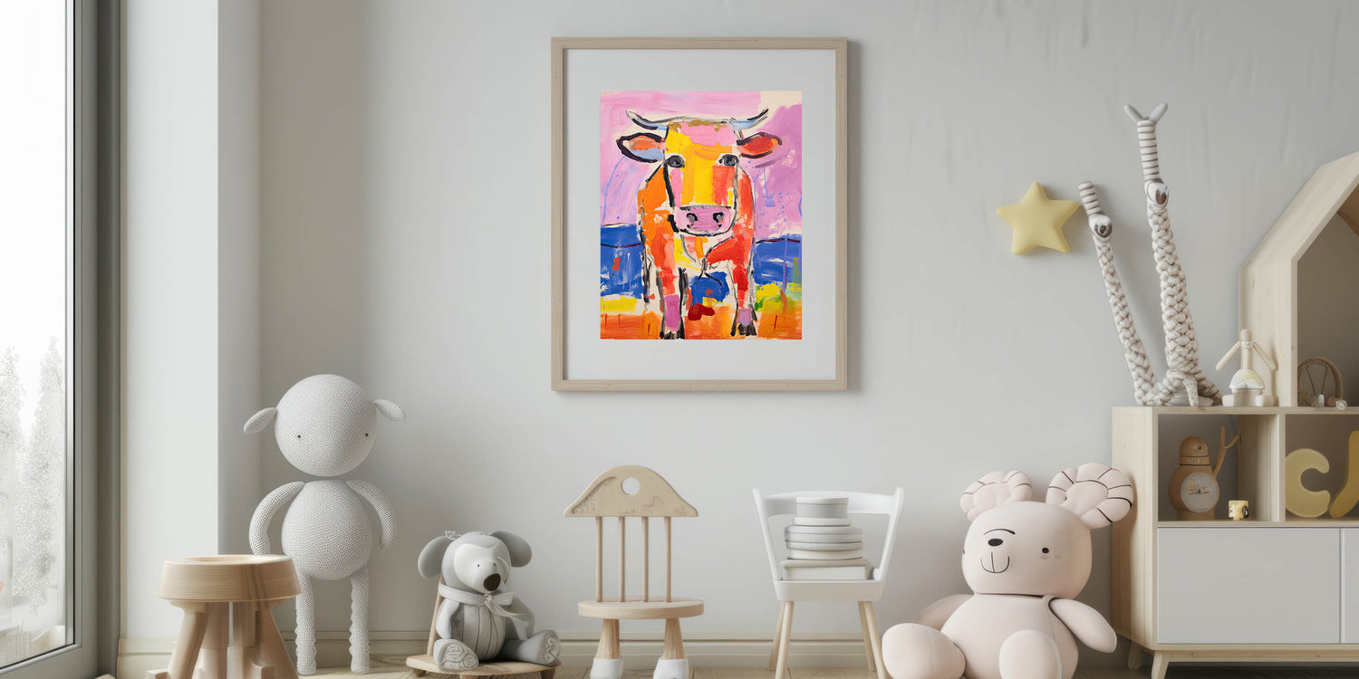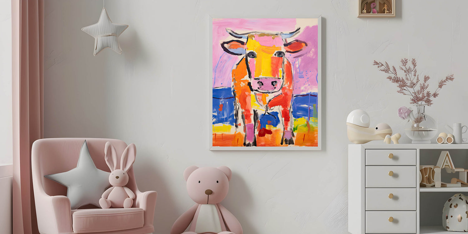 Brighten up your child's space with this Acrylic Glass Art for Kids Rooms, featuring a playful and vibrant cow in a bold mix of colors. This Kids Room Wall Art adds a fun and artistic touch to nurseries, playrooms, and children's bedrooms, making it a standout piece in any animal-themed décor.