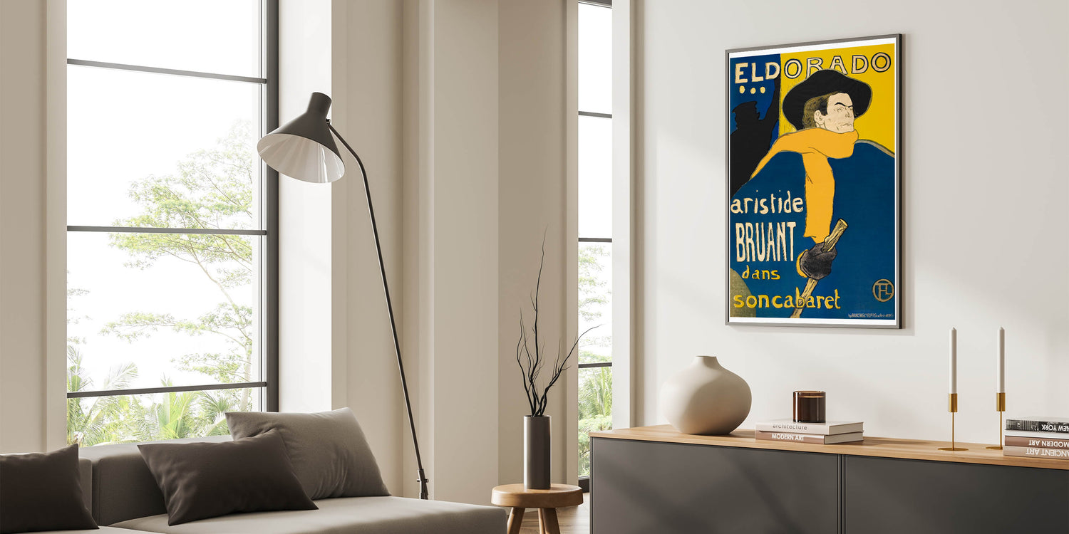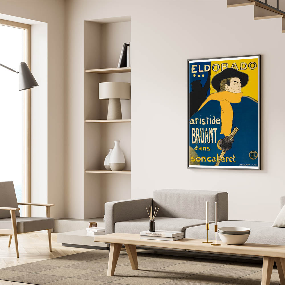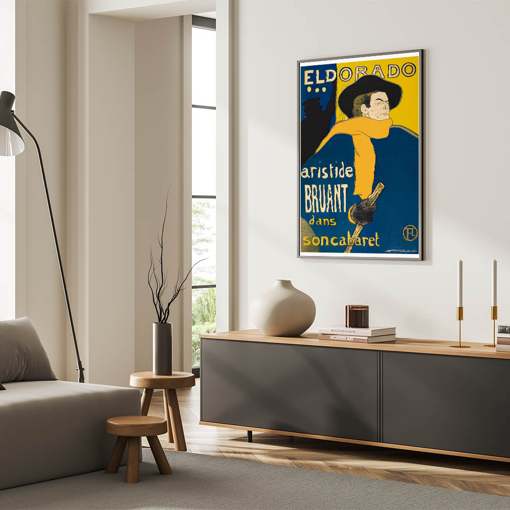 Add a touch of vintage charm to your space with the "Aristide Bruant Modern Wall Art" by Henri de Toulouse-Lautrec. This iconic cabaret poster features bold shades of blue, yellow, and black, capturing the charismatic essence of the Parisian nightlife scene. The striking illustration and bold typography make it a perfect choice for modern decor enthusiasts who love unique and historical designs.