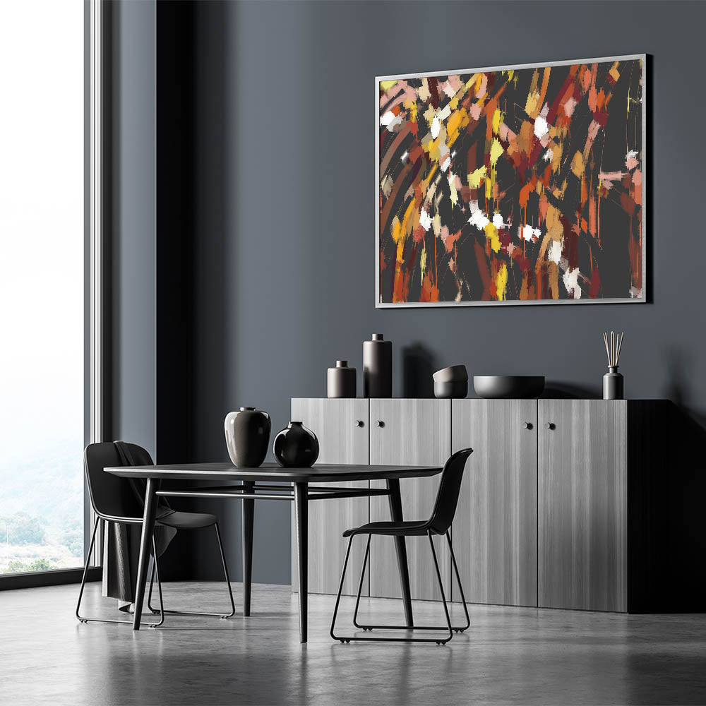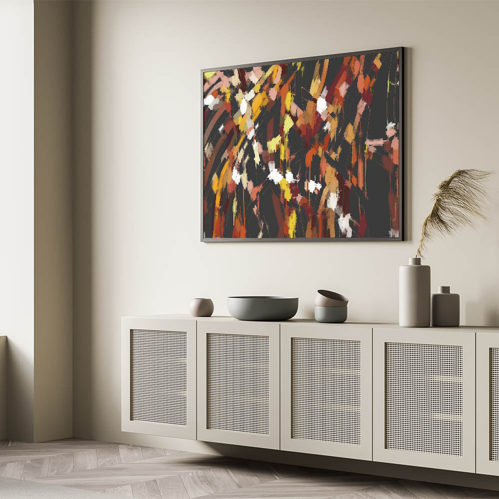 Set your space ablaze with the expressive energy of this colorful abstract wall hanging. Explosive brushstrokes in shades of red, orange, gold, blush, and ivory ignite across a jet-black background, mimicking the fiery beauty of falling leaves and autumn skies. The high-contrast design, rendered in a bold digital illustration style, creates a striking visual rhythm that draws the eye and invigorates the room.