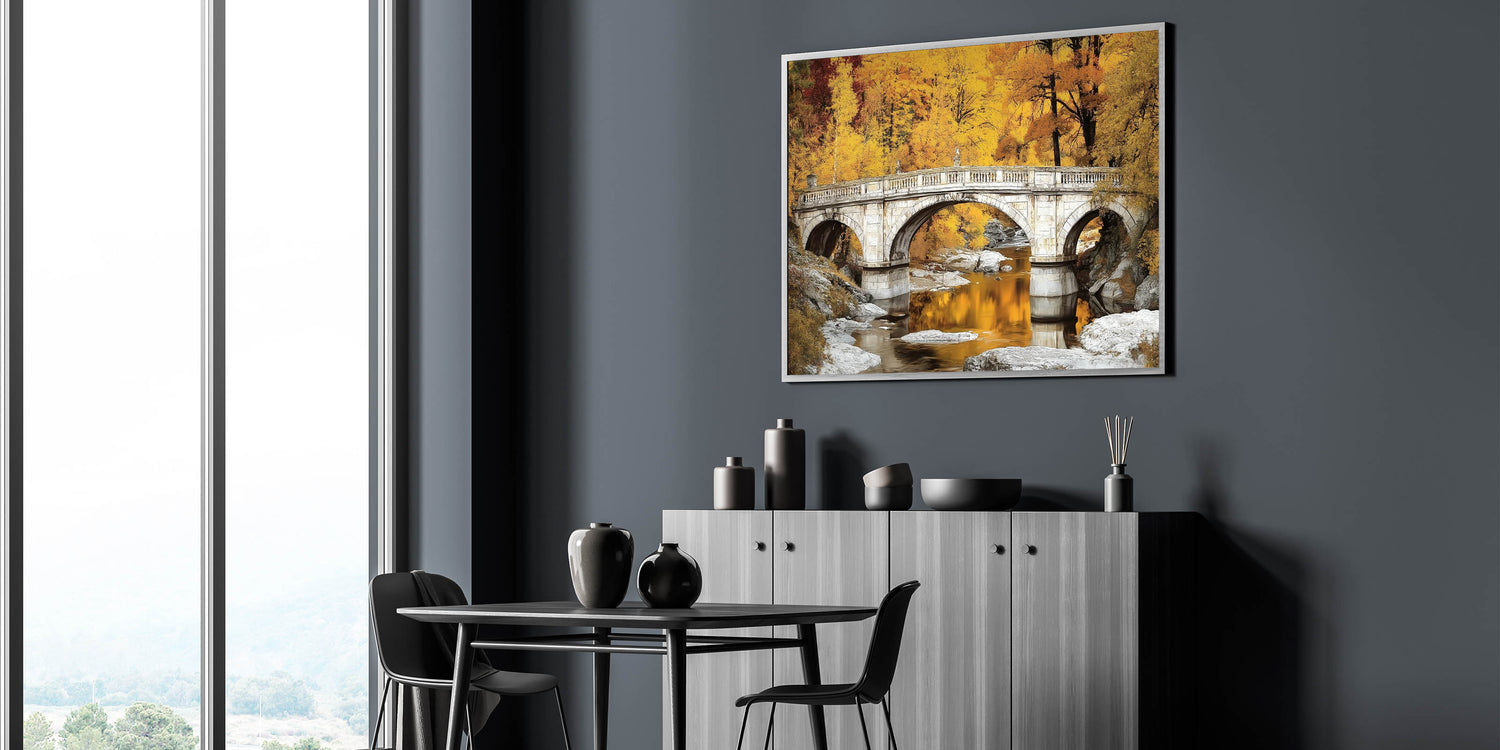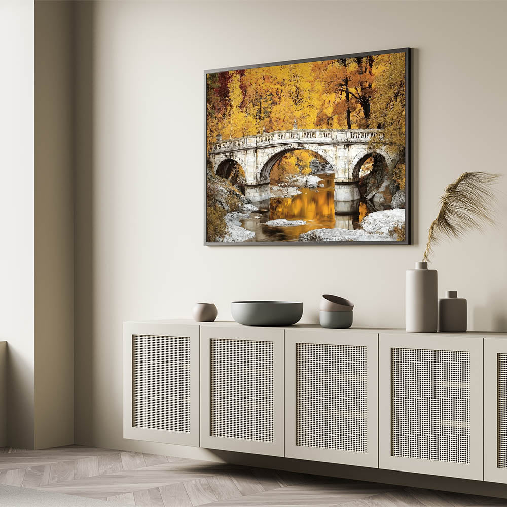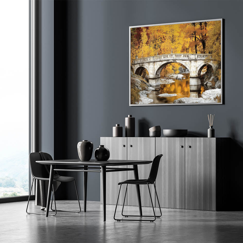 Transform your home or office with this exquisite autumn-inspired bridge painting. Its warm colors and serene composition bring a cozy and inviting ambiance to any room. Perfect for art and nature lovers, this unique bridge art print celebrates the elegance of both human craftsmanship and the beauty of fall.