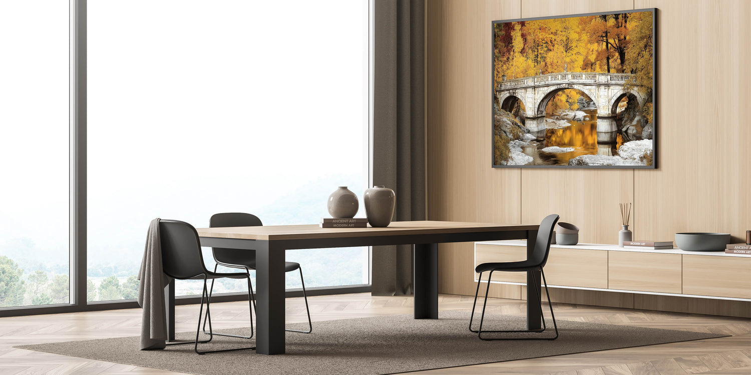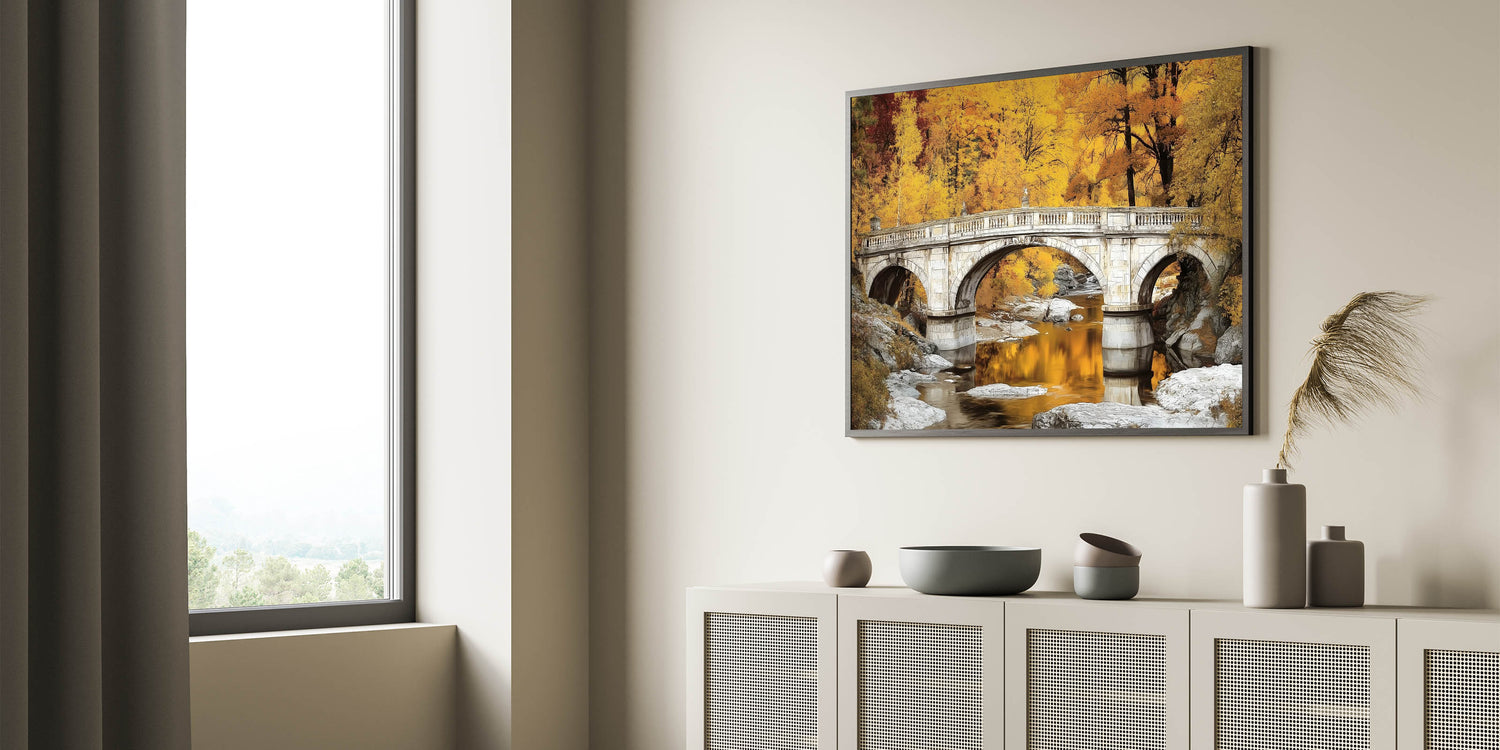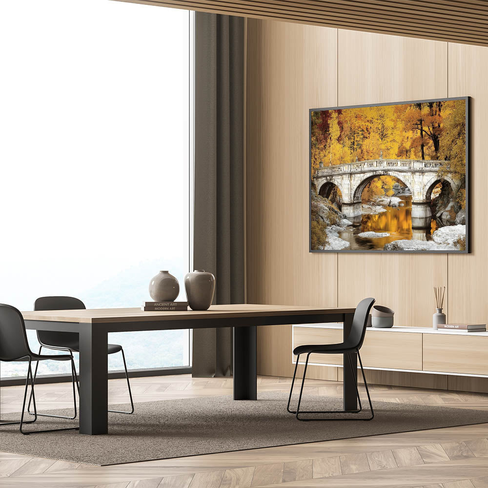 Transform your home or office with this exquisite autumn-inspired bridge painting. Its warm colors and serene composition bring a cozy and inviting ambiance to any room. Perfect for art and nature lovers, this unique bridge art print celebrates the elegance of both human craftsmanship and the beauty of fall.
