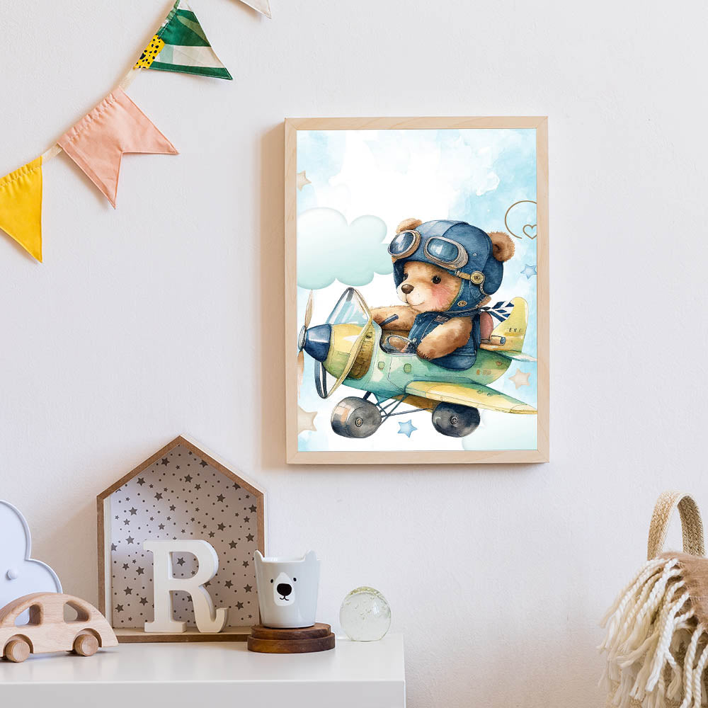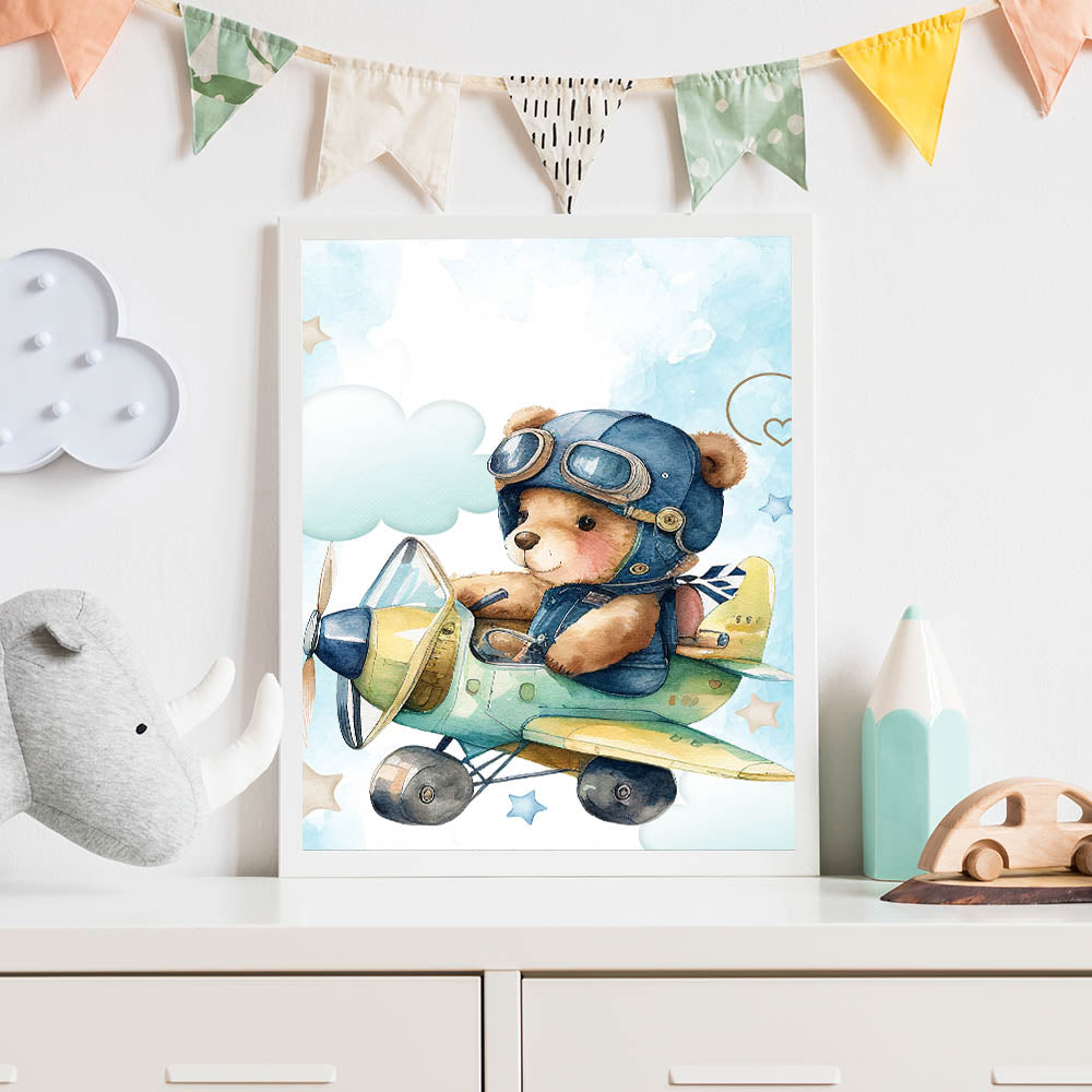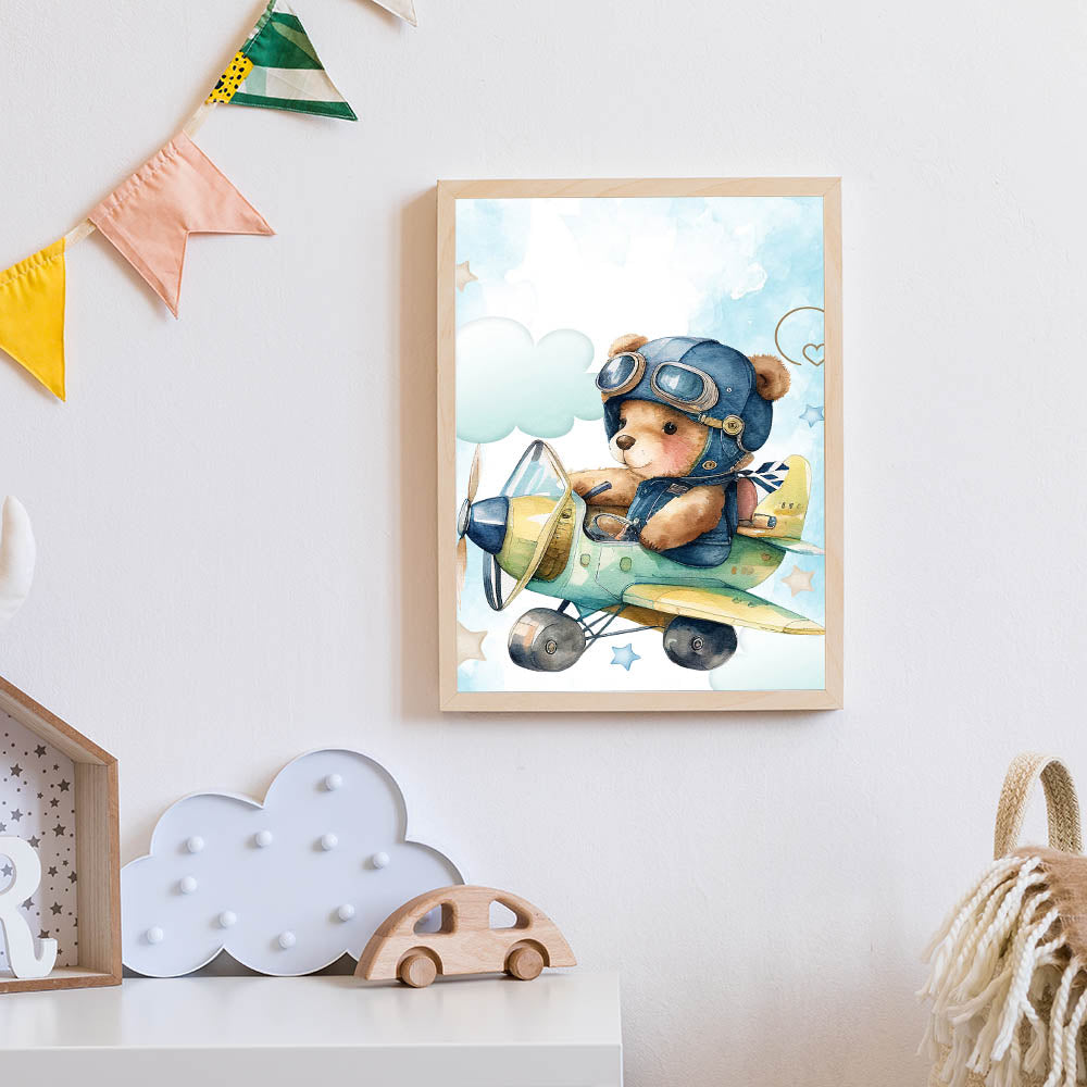 Let your little one’s imagination take flight with this Aviator Teddy Boys Wall Art. Featuring an adorable teddy bear soaring through the sky in a vintage airplane, this watercolor-style artwork is a dreamy addition to any boys' bedroom, nursery, or playroom. The soft blue sky, fluffy clouds, and playful stars create a calming and adventurous scene, inspiring dreams of high-flying adventures.
