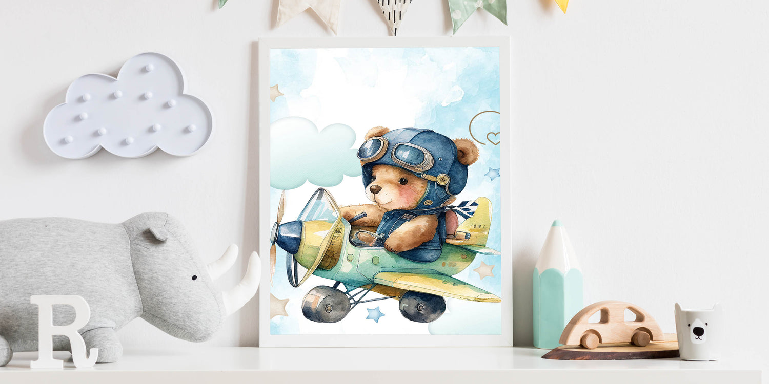 Transform your child’s space into a world of adventure with this adorable aviator teddy wall art!