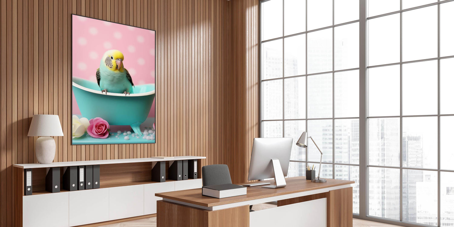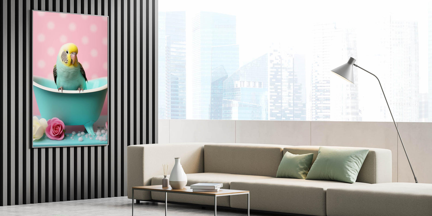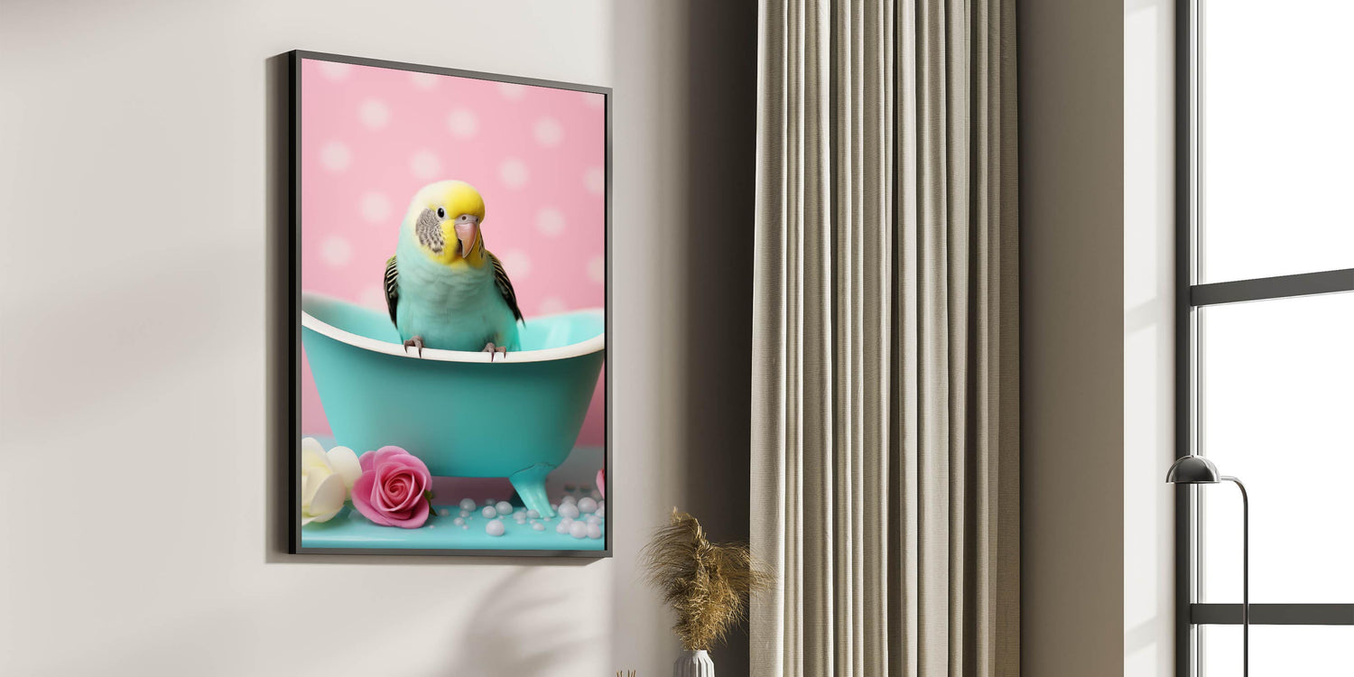 Brighten your bathroom with this delightful wall art featuring a cheerful yellow and turquoise bird perched in a mini tub, surrounded by soft pink polka dots and floral accents. This artwork is perfect for creating a charming and playful atmosphere, ideal for modern or whimsical bathroom spaces.