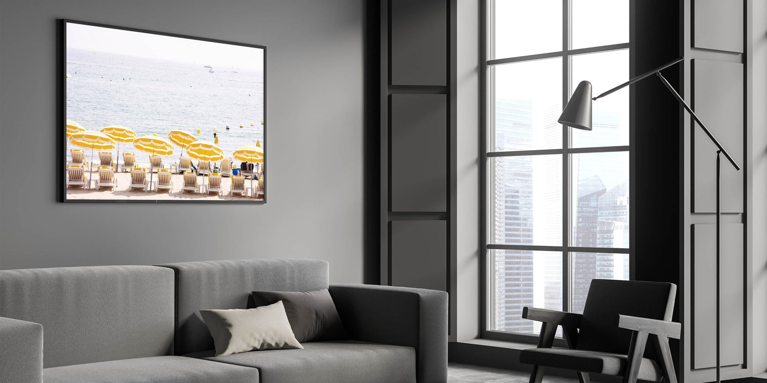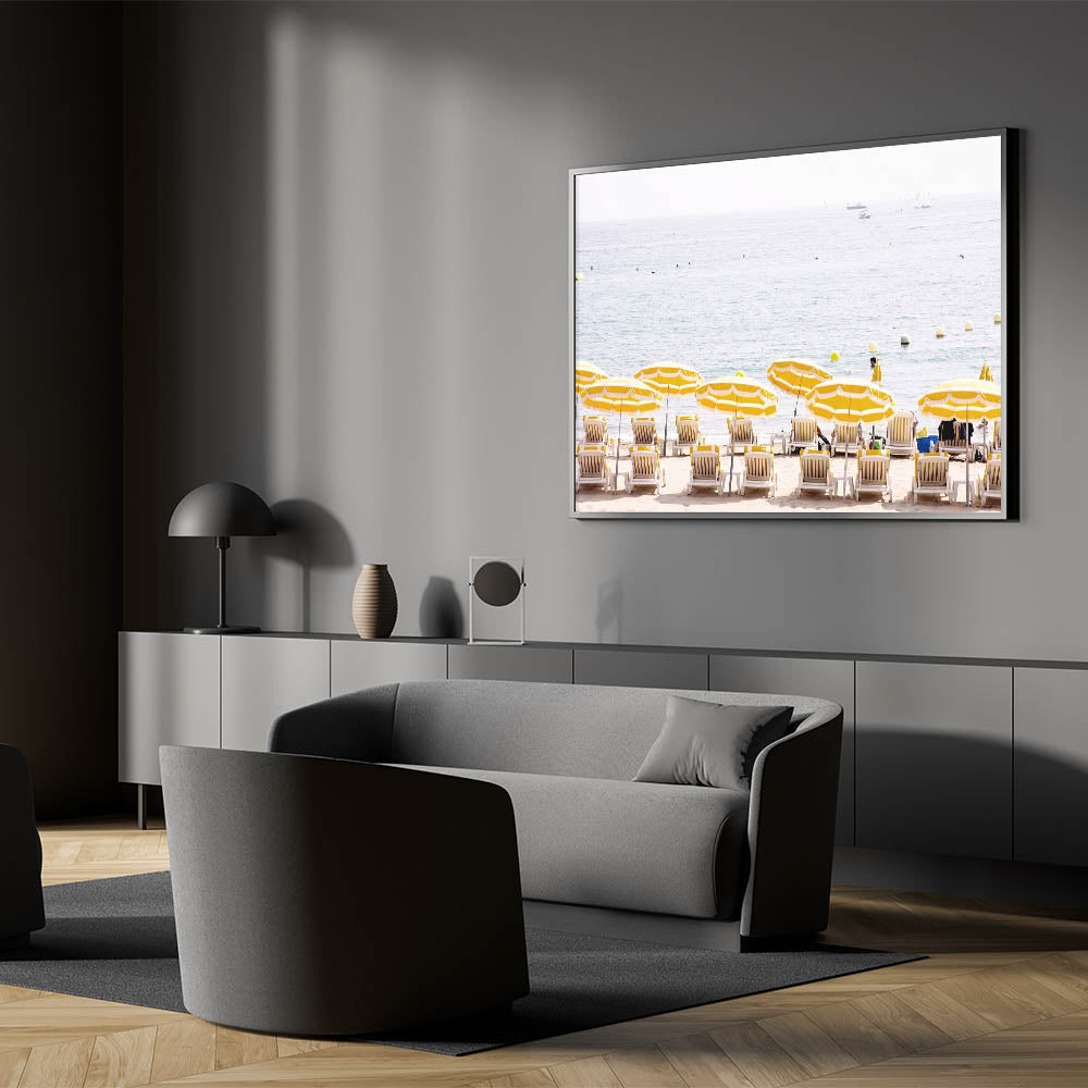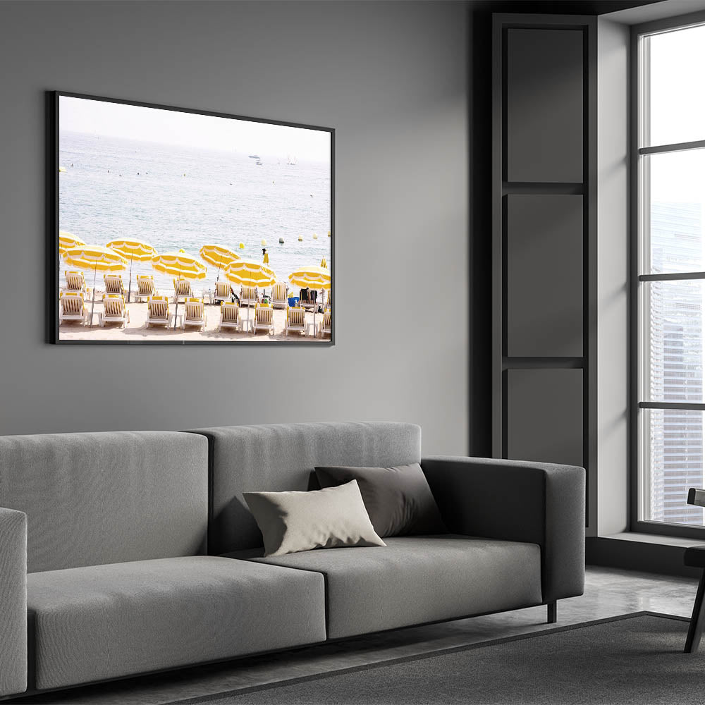 Infuse your space with the warmth and vibrancy of summer using this Yellow Umbrella Canvas Art. Featuring a row of cheerful yellow beach umbrellas set against a tranquil blue ocean, this artwork perfectly embodies summer vibes, beach relaxation, and vacation-inspired charm.