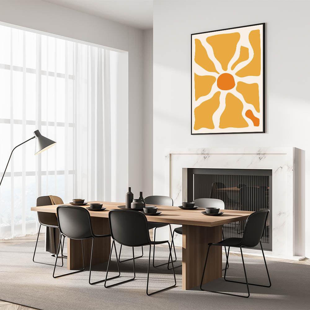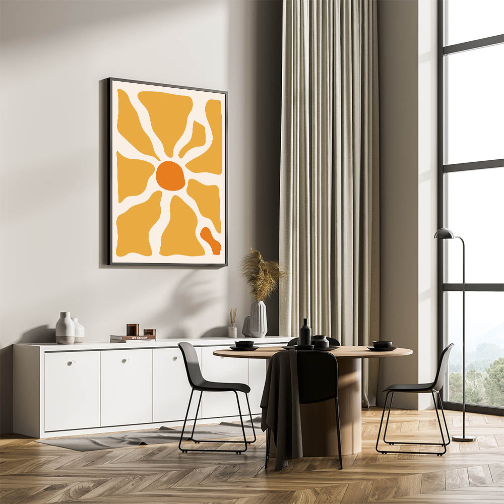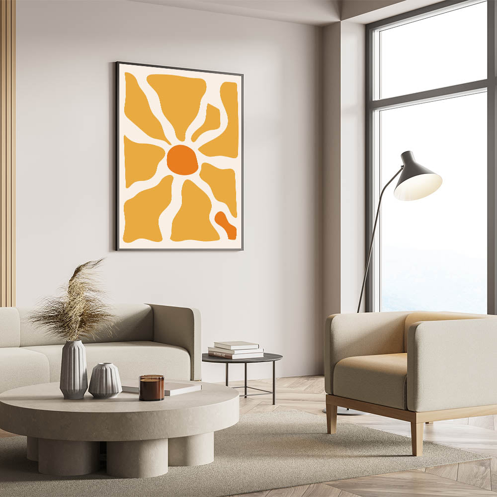 The combination of vibrant yellow and orange in this artwork creates a joyful, uplifting atmosphere, making it an ideal choice for any room that needs a splash of color. Whether displayed in a living room or office, this abstract boho wall art will bring warmth and artistic flair to your space. Available in multiple formats, this canvas suits a variety of decor styles.