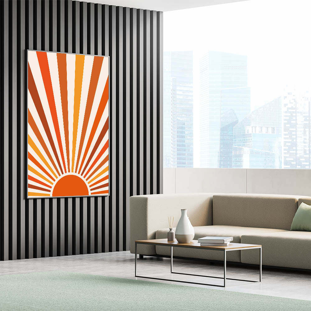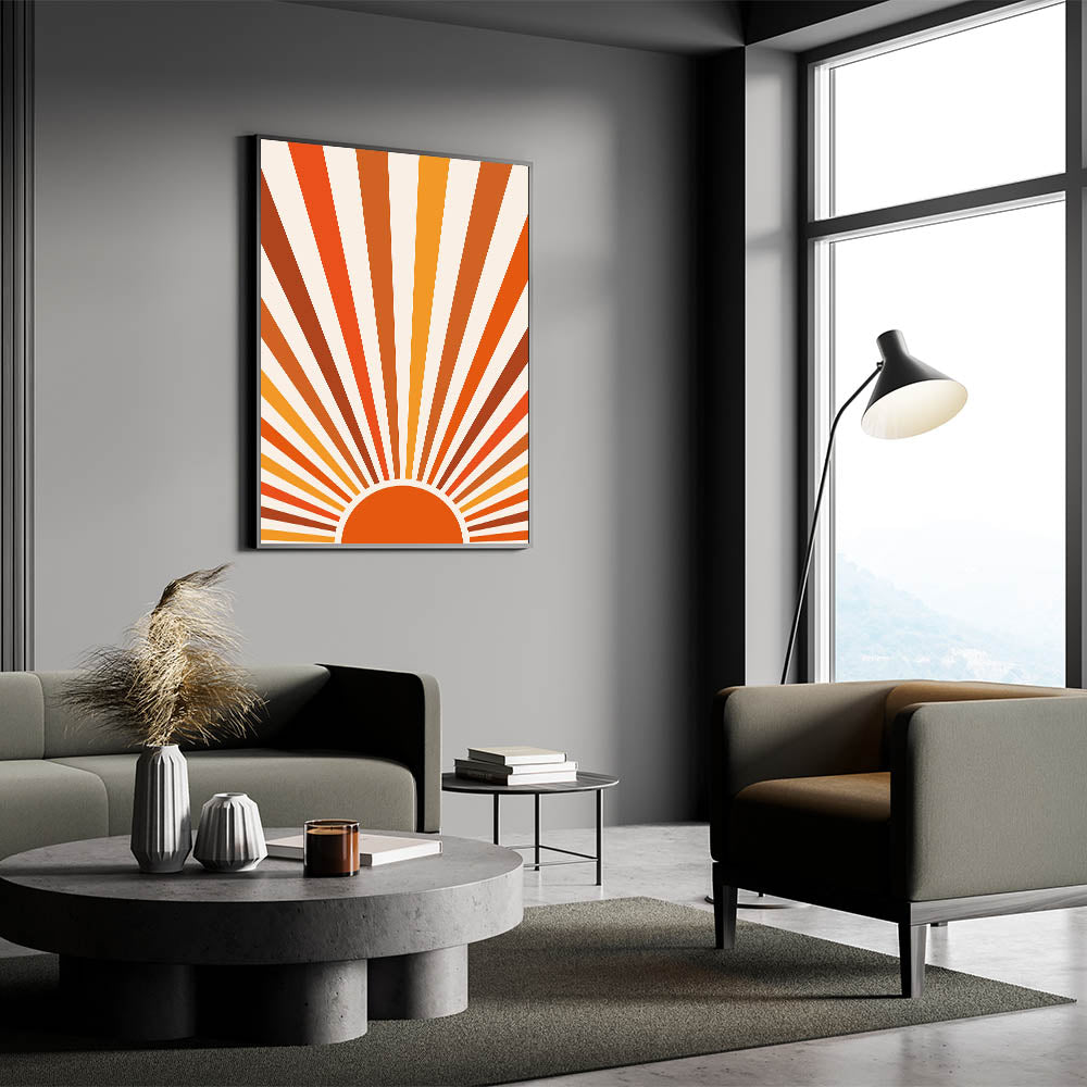 Brighten your space with this eye-catching retro sunburst design, inspired by the warm tones of nature. The bold rays of orange, rust, and yellow radiate outward from the center, creating a sense of energy and vibrancy. Perfect for adding a touch of retro bohemian flair to any space, this artwork brings a positive and uplifting atmosphere into your home.