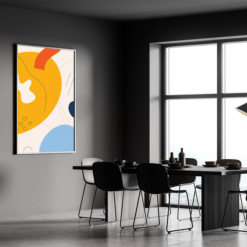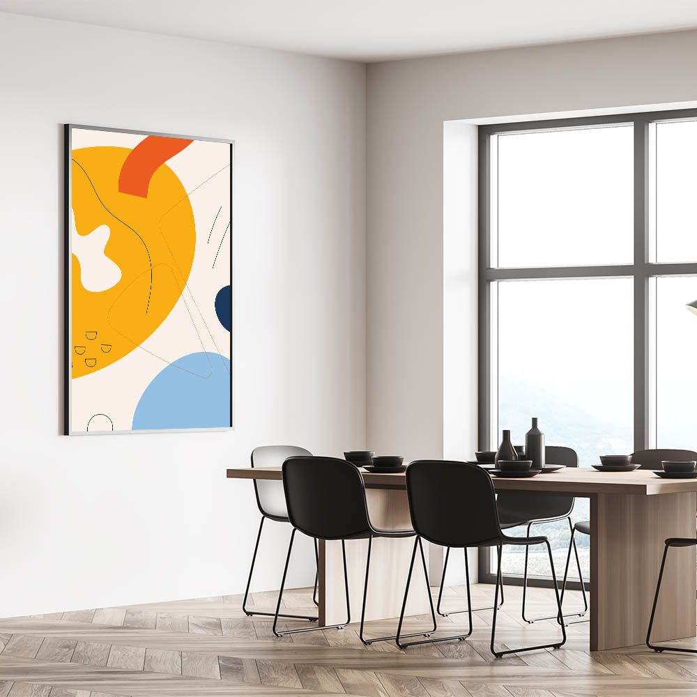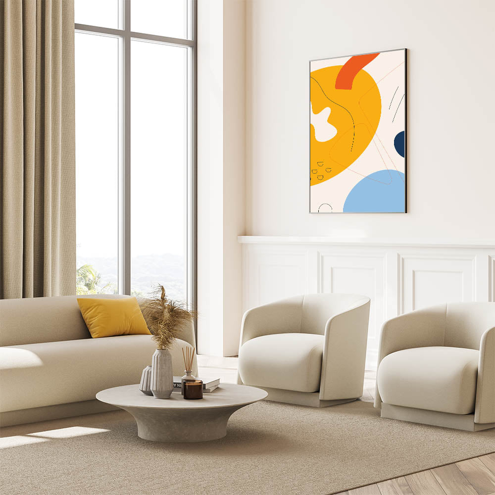 Brighten up your space with this vibrant bohemian wall art. Featuring an eclectic mix of bold, abstract shapes in yellow, orange, and soft blue, this boho decor canvas is perfect for adding a lively and energetic feel to any room. Its playful, modern design brings a fresh and artistic flair, ideal for living rooms, creative spaces, or even kids' rooms. The harmonious blend of vivid colors captures the essence of artistic bohemian style, offering an eye-catching piece that stands out in any interior.