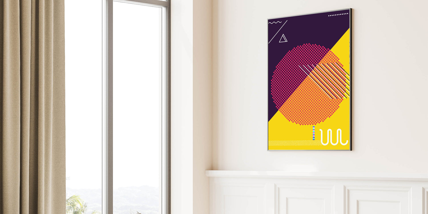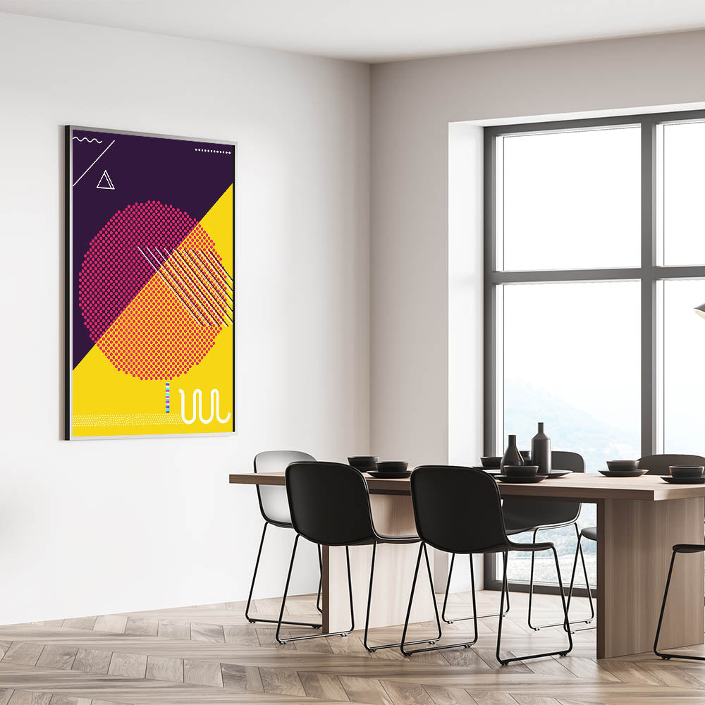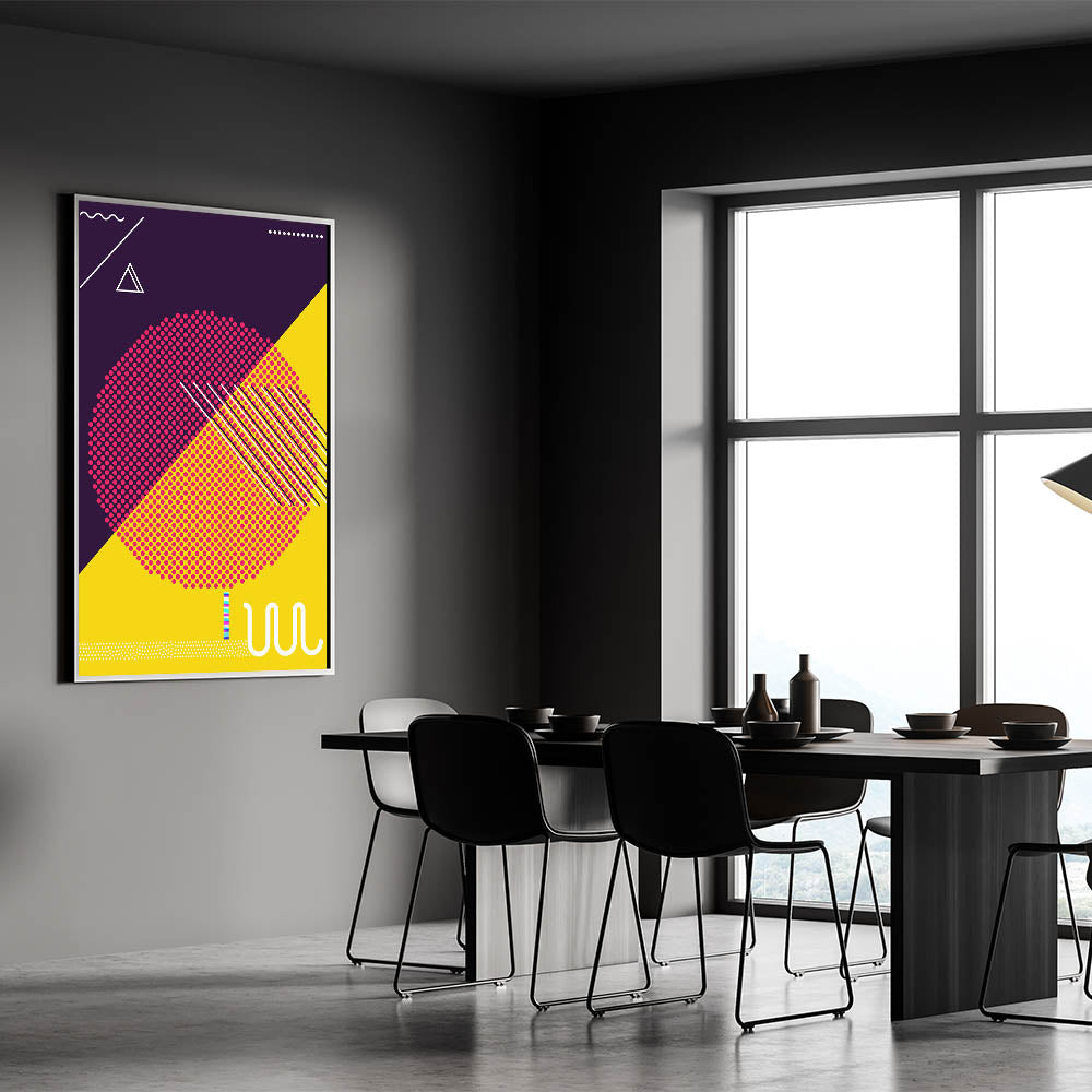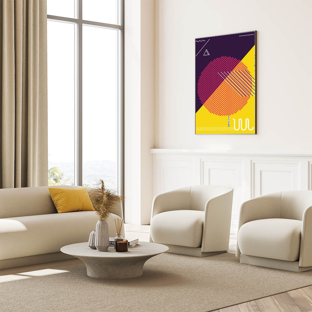 Add a bold pop of color and retro charm to your space with this geometric pop art design. Featuring a dynamic combination of bright yellow, magenta, and purple, this artwork uses playful circles, sharp lines, and abstract shapes to create a visually striking piece that embodies the essence of pop art and retro aesthetics. Perfect for adding a funky, modern touch to your living space, office, or studio, this piece is a must-have for lovers of bold design and unique decor.