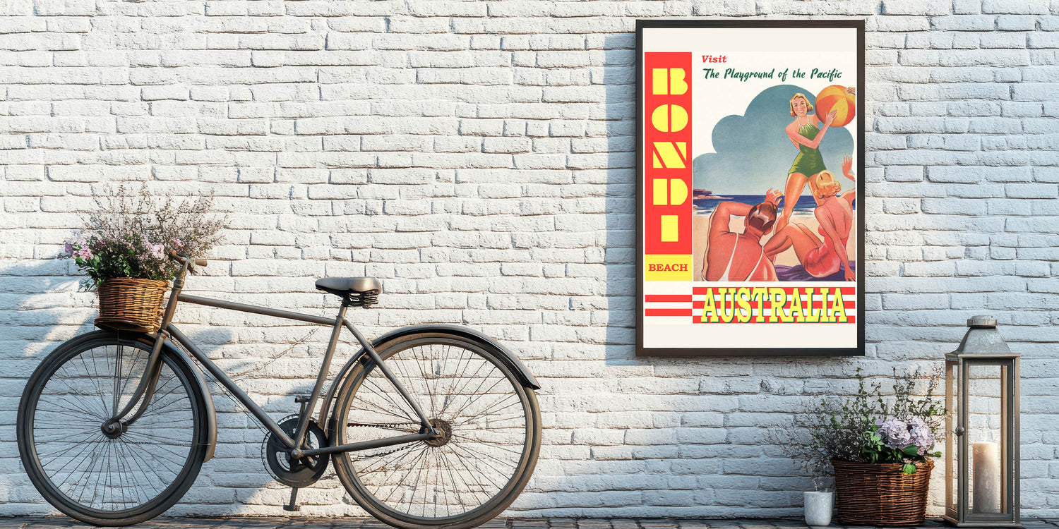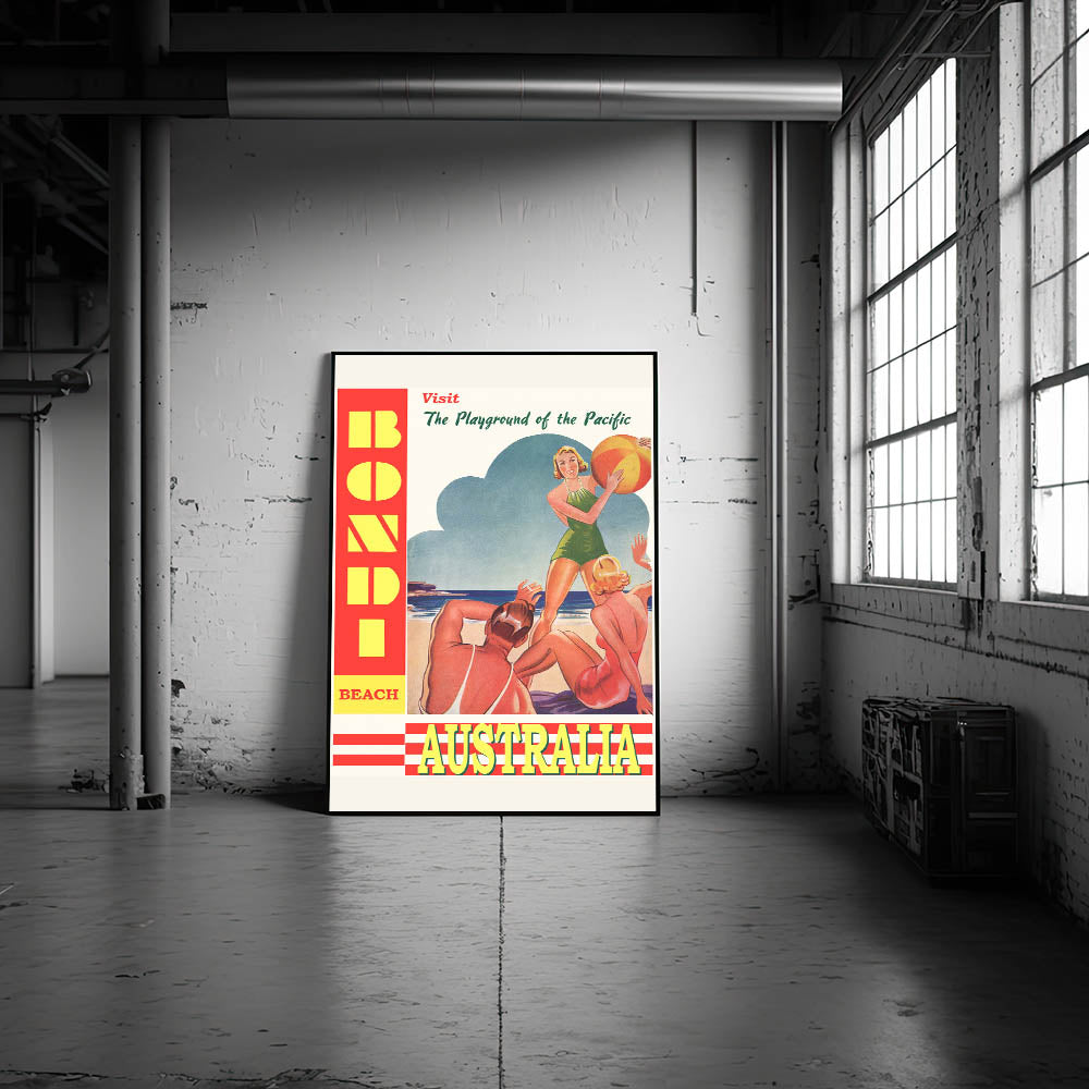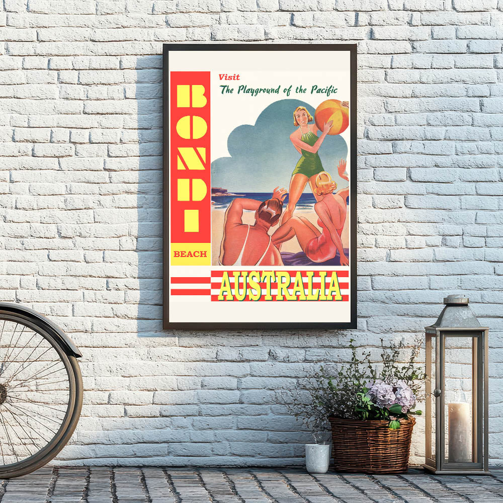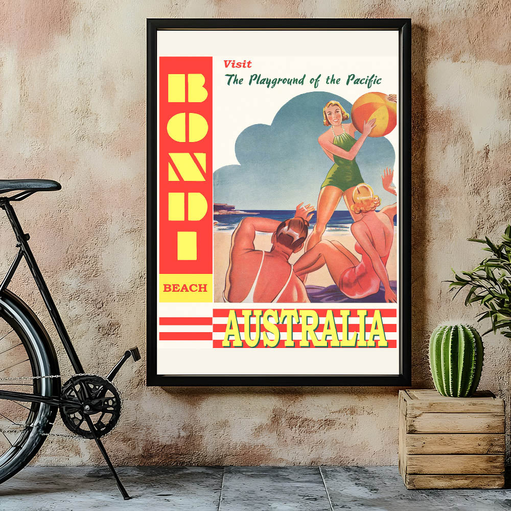 Capture the sunny, vibrant spirit of Australia with this retro Bondi Beach travel poster. Featuring sunbathers enjoying the iconic beach with the famous Bondi Beach atmosphere, this vintage-inspired design brings the relaxed yet lively energy of Australia's east coast to your home. The bold red and yellow accents, along with the playful beach ball, make this a fun and timeless piece that adds a touch of coastal charm to any room.
