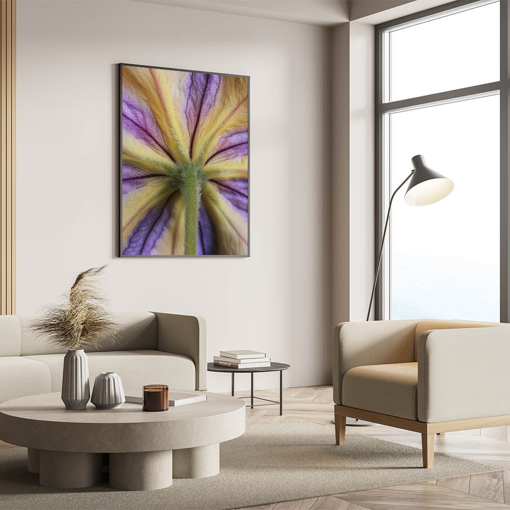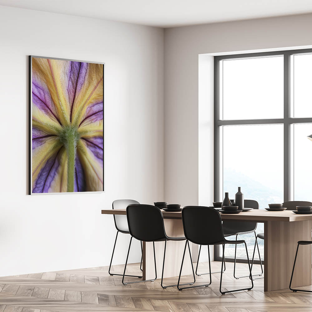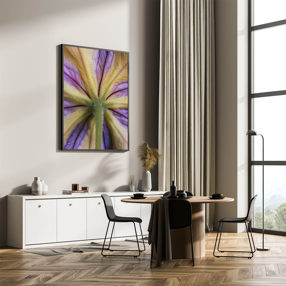 Infuse your home with the elegance of nature through this exquisite botanical wall decor. Featuring a close-up view of a vibrant flower's underside, this artwork highlights soft lavender petals, golden yellow hues, and lush green stems. Its intricate details and captivating colors evoke a sense of tranquility and sophistication.