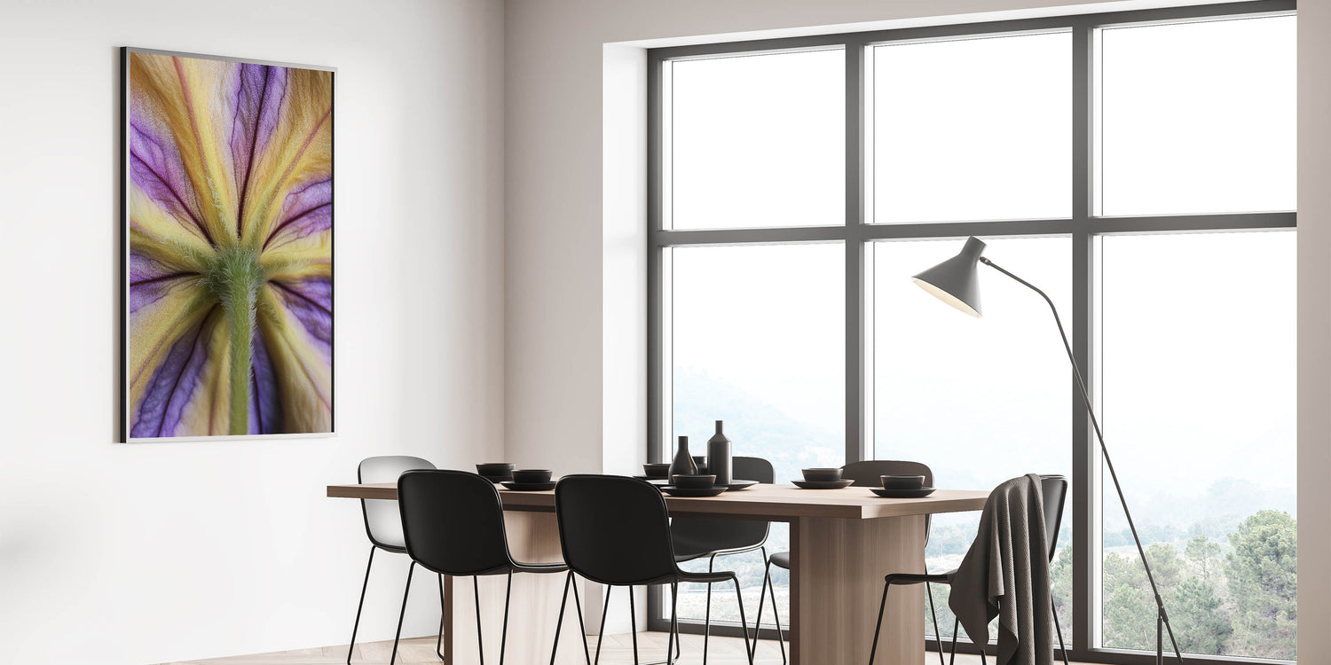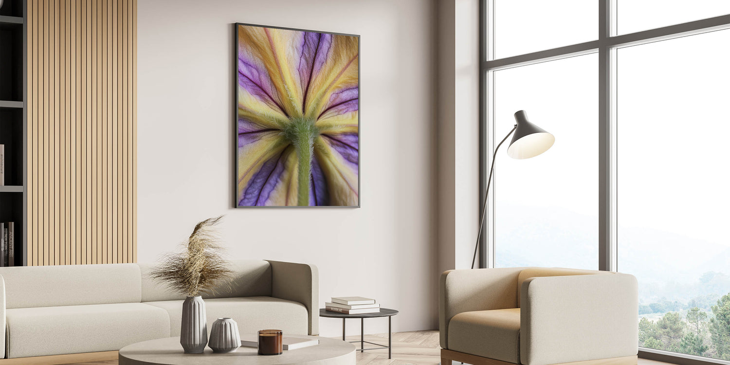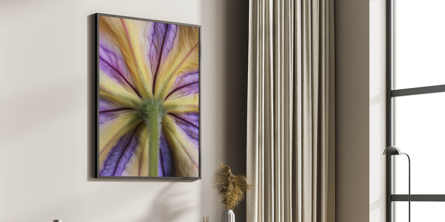 Infuse your home with the elegance of nature through this exquisite botanical wall decor. Featuring a close-up view of a vibrant flower's underside, this artwork highlights soft lavender petals, golden yellow hues, and lush green stems. Its intricate details and captivating colors evoke a sense of tranquility and sophistication.