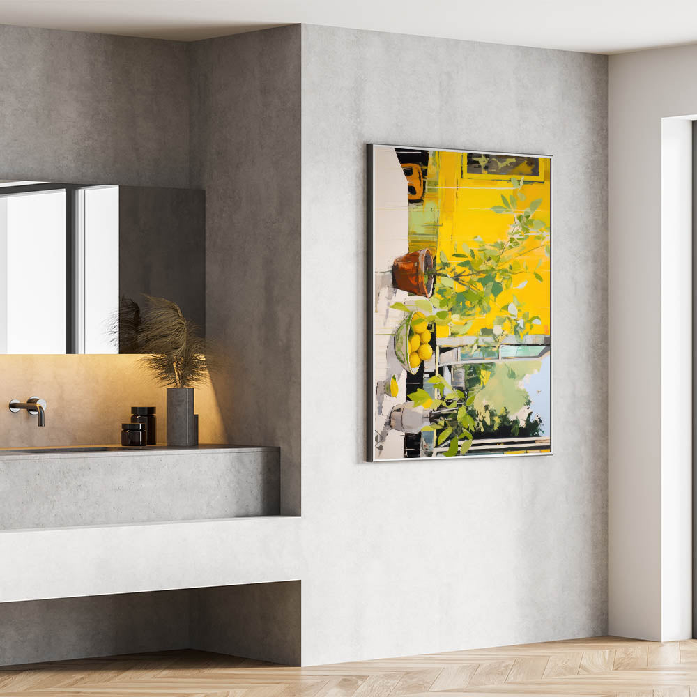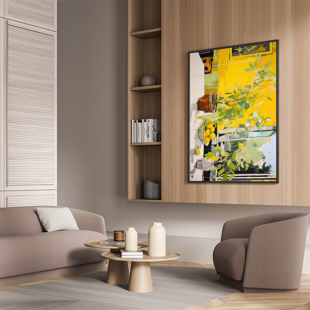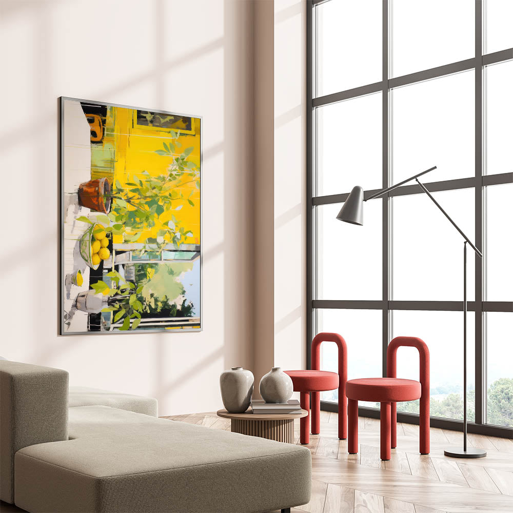 Infuse your space with fresh, vibrant energy through this electric-themed artwork. Featuring lively lemons and lush green foliage against a bold yellow background, this piece brings a burst of brightness to any room. Perfect for kitchens, dining rooms, or sunrooms, this electric art canvas captures the essence of a sunny, refreshing day with its dynamic color palette and modern design.
