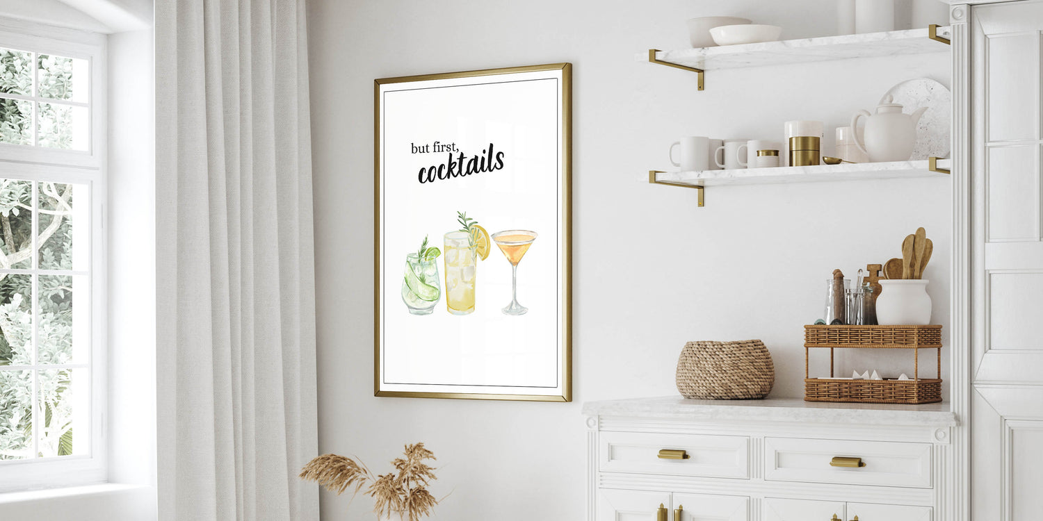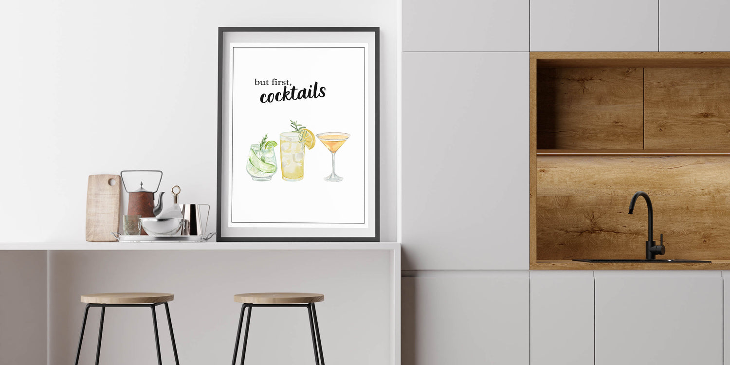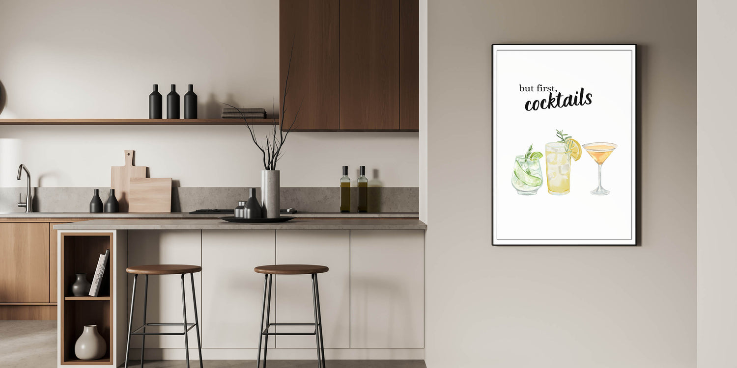Start your evening in style with this But First, Cocktails wall art, a charming and modern piece for cocktail lovers. This drinks wall art features an elegant watercolor illustration of three classic cocktails, making it a perfect addition to kitchen wall art, dining spaces, and home bars. With a clean and minimalistic design, this piece brings a refreshing and fun atmosphere to any setting.