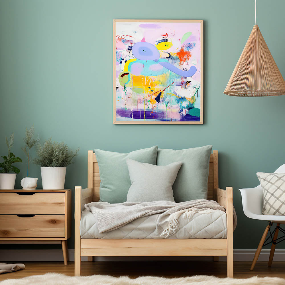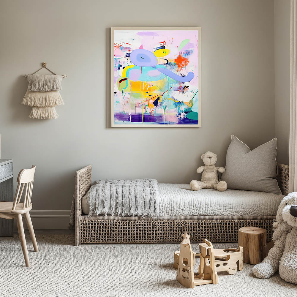 Add a splash of creativity to your child’s space with this abstract elephant wall art, featuring a playful mix of lavender, yellow, teal, and pink hues. This children’s wall art print blends artistic expression with whimsical charm, making it a unique piece for nurseries, playrooms, and kids' bedrooms. The vibrant color palette and fluid brushstrokes create a modern yet fun look that will captivate little imaginations.