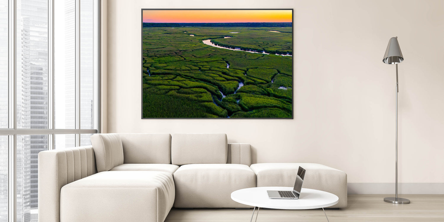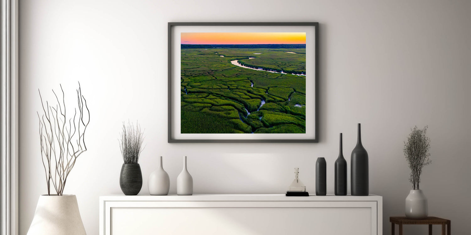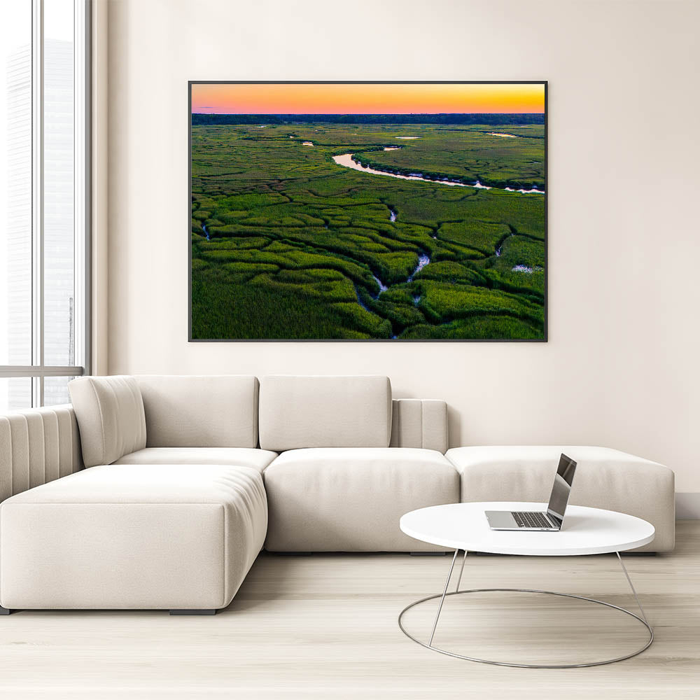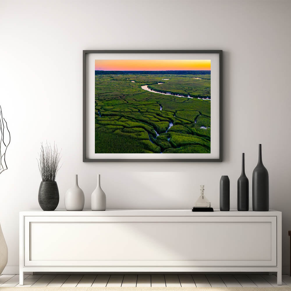 Celebrate the serene beauty of Charleston’s Lowcountry marshlands with this captivating scenic art print. Captured at sunset, the lush green marshes are bathed in the soft, warm hues of the setting sun. The winding waterways create a mesmerizing pattern, offering a peaceful view of Charleston’s natural landscape. This South Carolina print is the perfect addition for nature lovers and anyone who appreciates the tranquil charm of the Southern landscape.