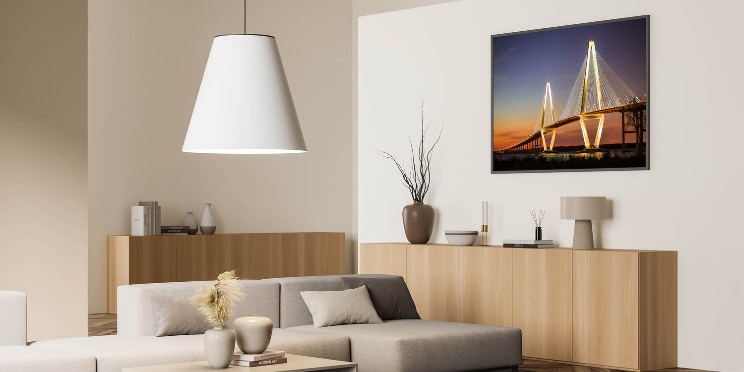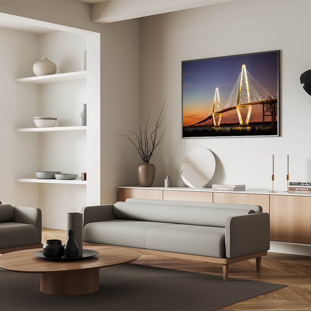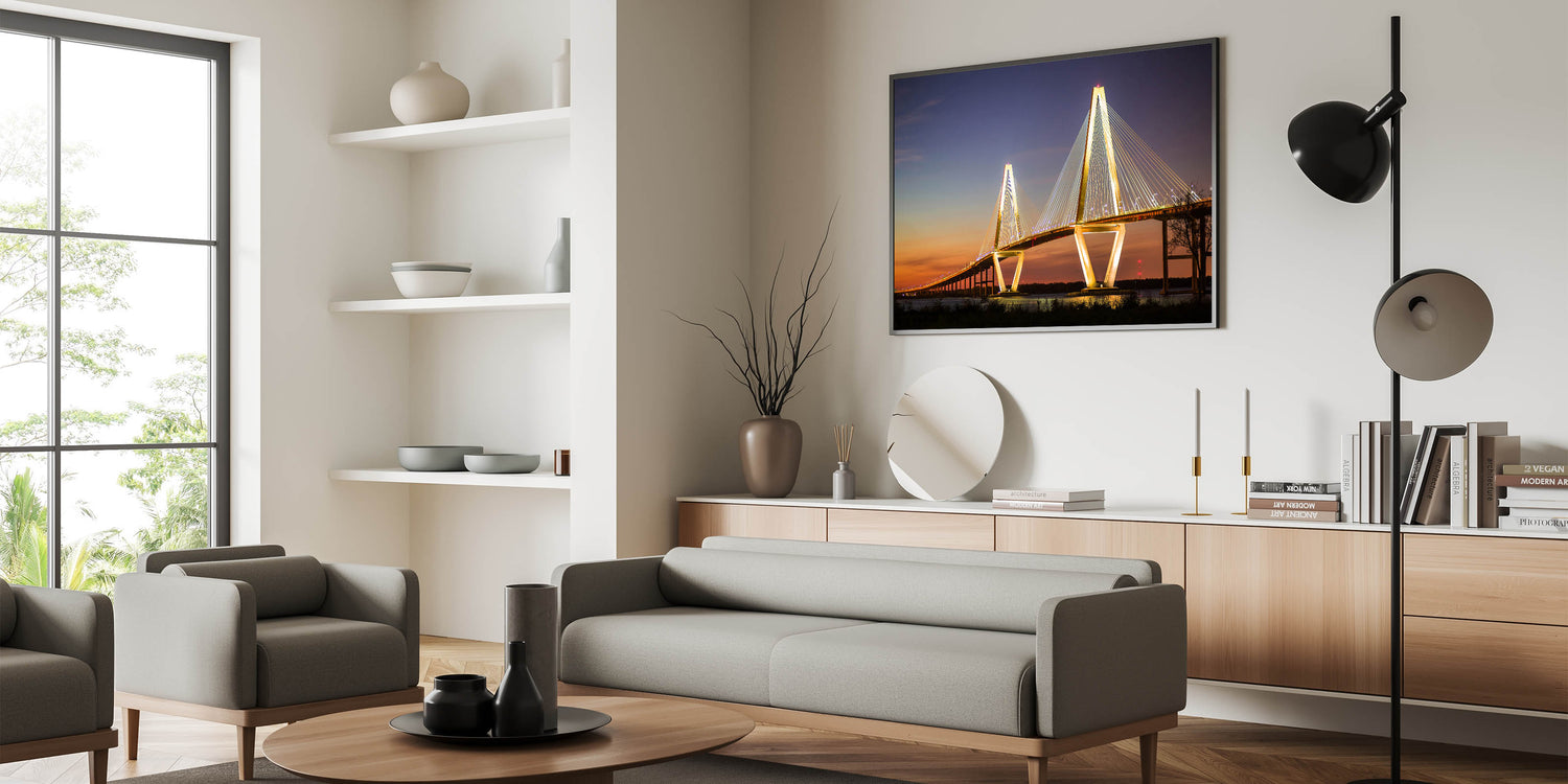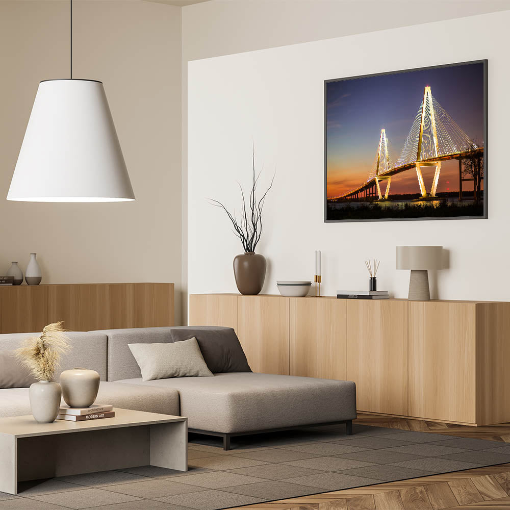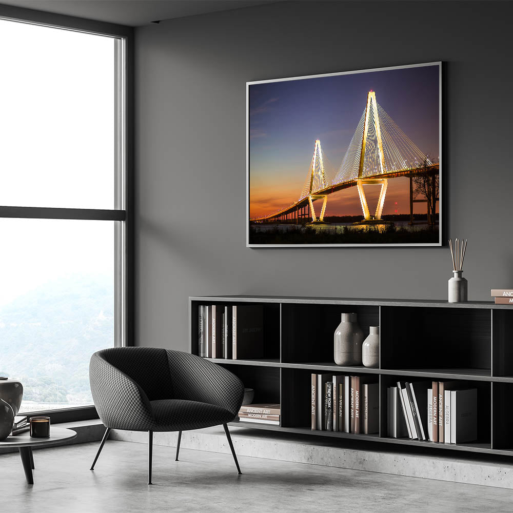 This stunning Charleston SC art print features the iconic Arthur Ravenel Jr. Bridge illuminated at sunset. The bridge stands tall against the fading light of the evening sky, showcasing the beauty and elegance of Charleston's skyline. This Charleston photography piece captures the modern architecture and historic charm of the Lowcountry, making it a perfect addition to your home or office decor.