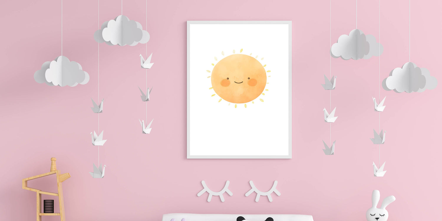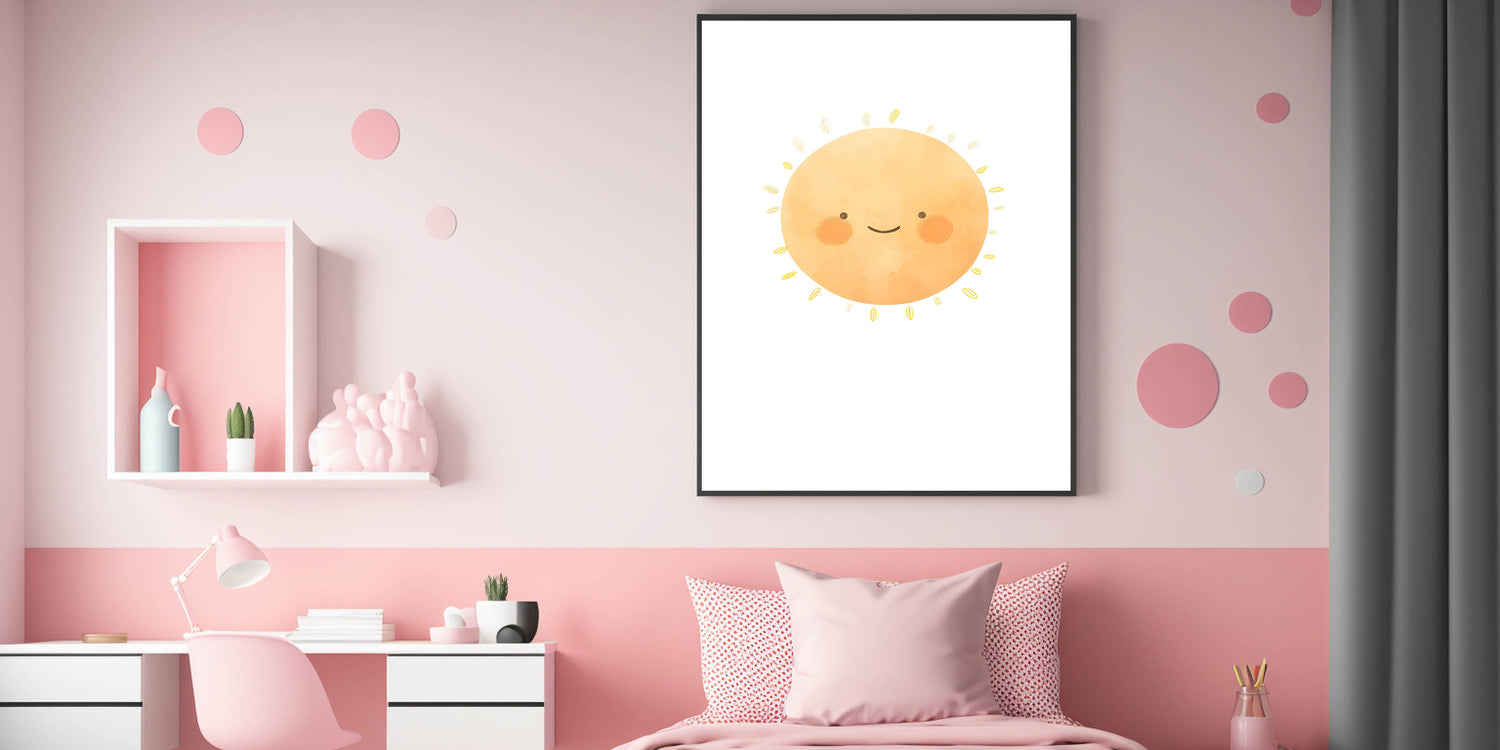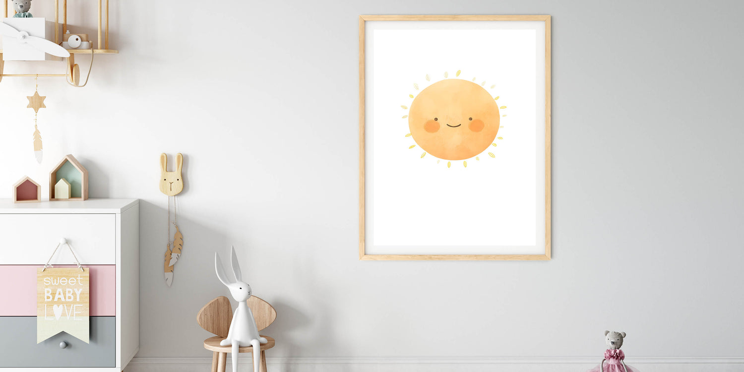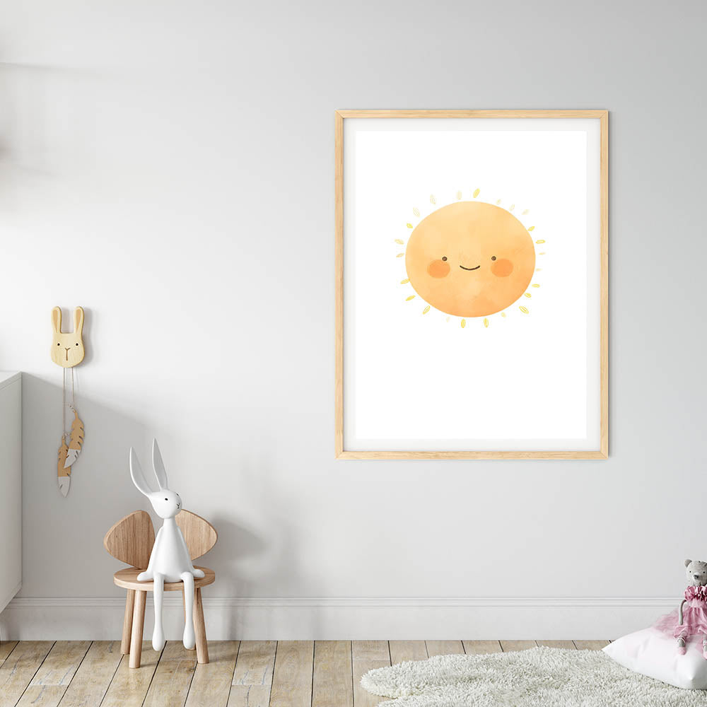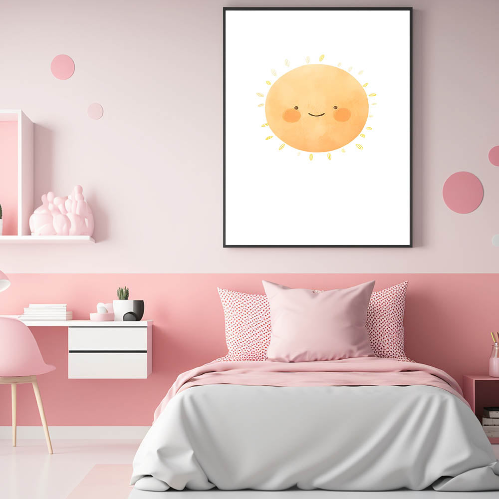 Brighten up your little one’s space with this cheerful smiling sun children's wall decor. Featuring a warm, watercolor-style sun with rosy cheeks, this adorable print radiates positivity and joy—perfect for nurseries, kids’ bedrooms, and playrooms.
