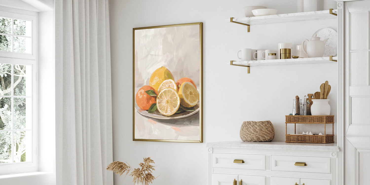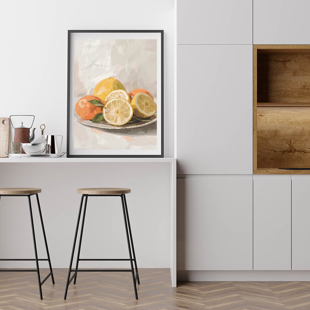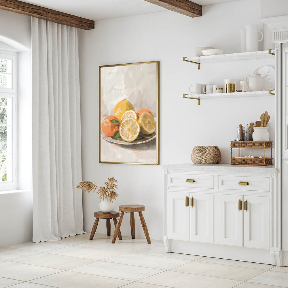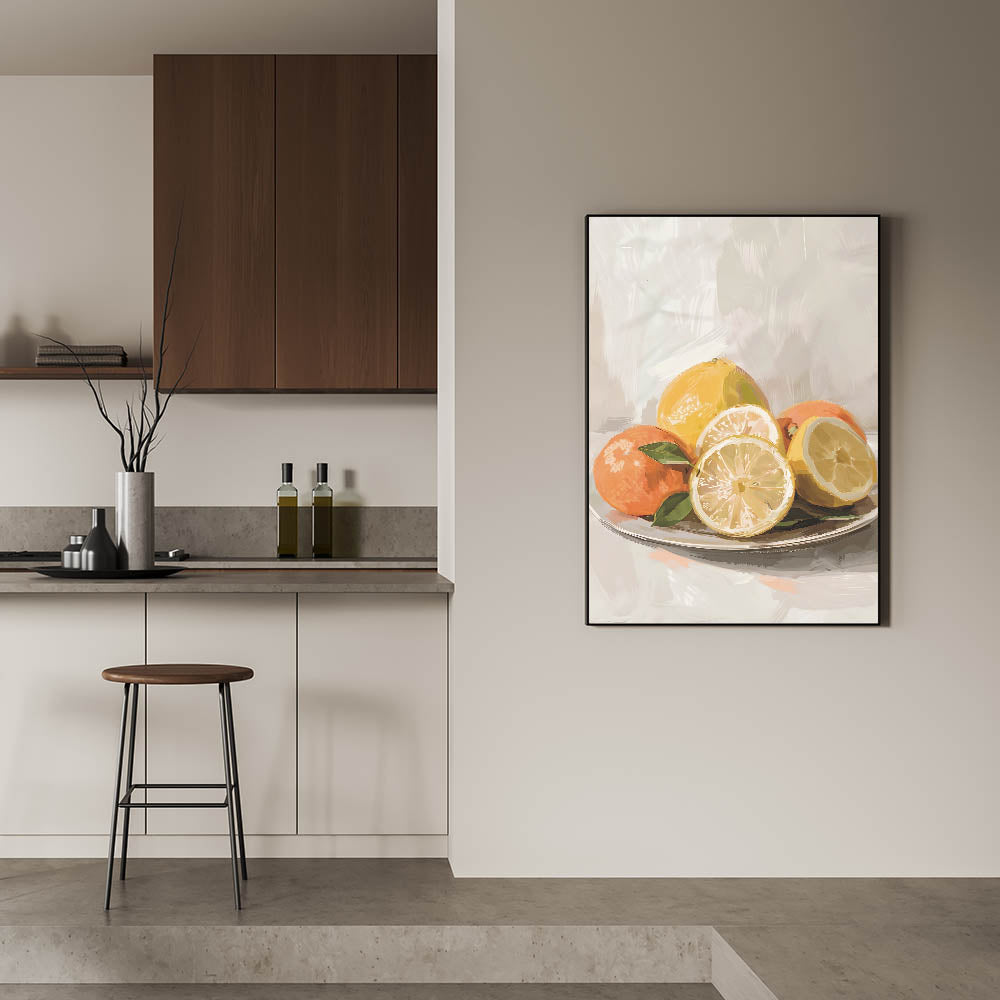 Refresh your space with this fruit canvas art, featuring a soft still-life painting of lemons and oranges elegantly arranged on a plate. The vibrant yellow and orange hues, complemented by fresh green leaves, create a bright and airy aesthetic, perfect for kitchen fruit decor. The light brushstrokes and neutral background add a touch of elegance, making this fruit-themed wall art a versatile choice for modern, farmhouse, or Mediterranean interiors.