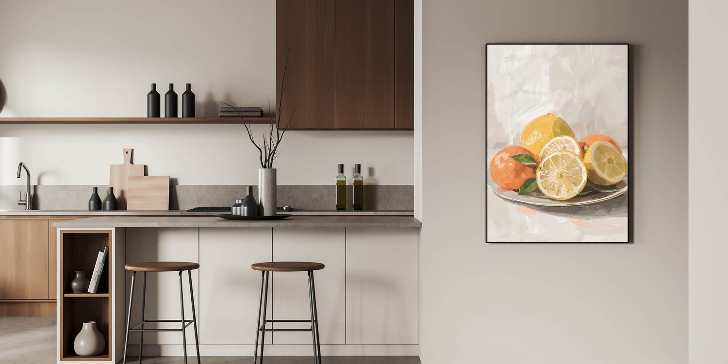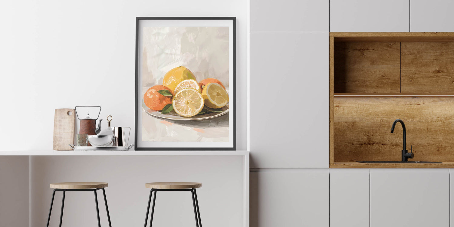 This fruit still life art captures the warmth and freshness of citrus fruits, bringing a lively yet elegant touch to your home. Whether decorating a bright breakfast nook or a cozy farmhouse kitchen, this artwork adds a refreshing splash of nature’s beauty.