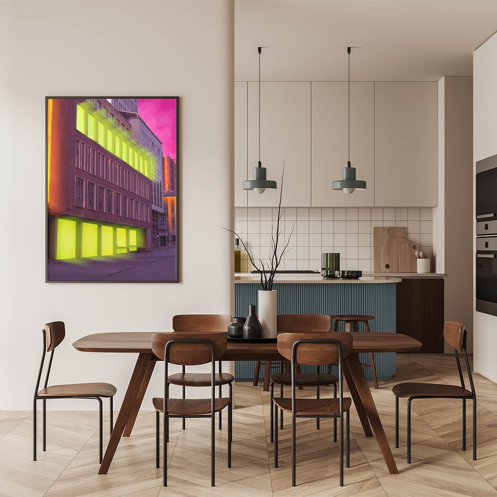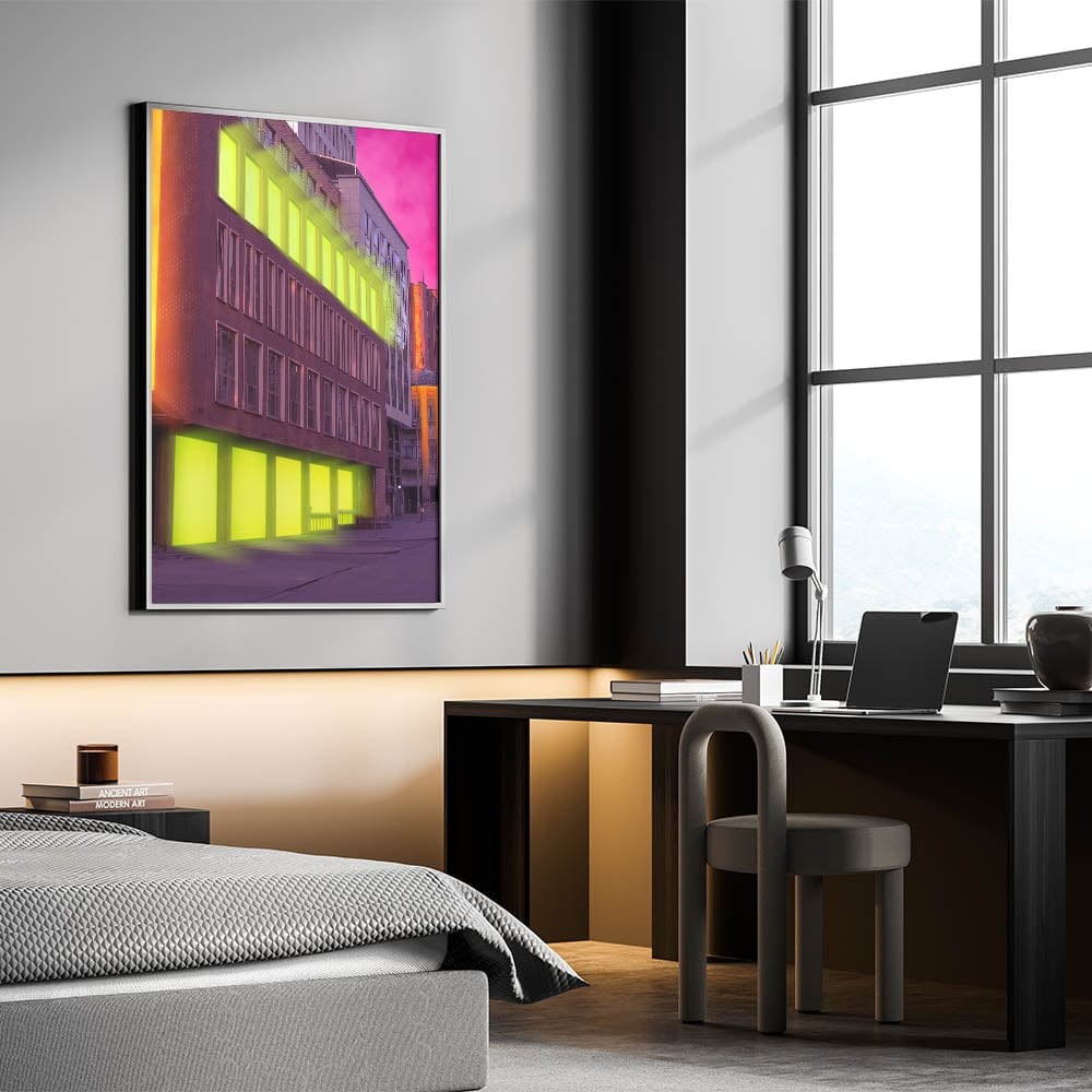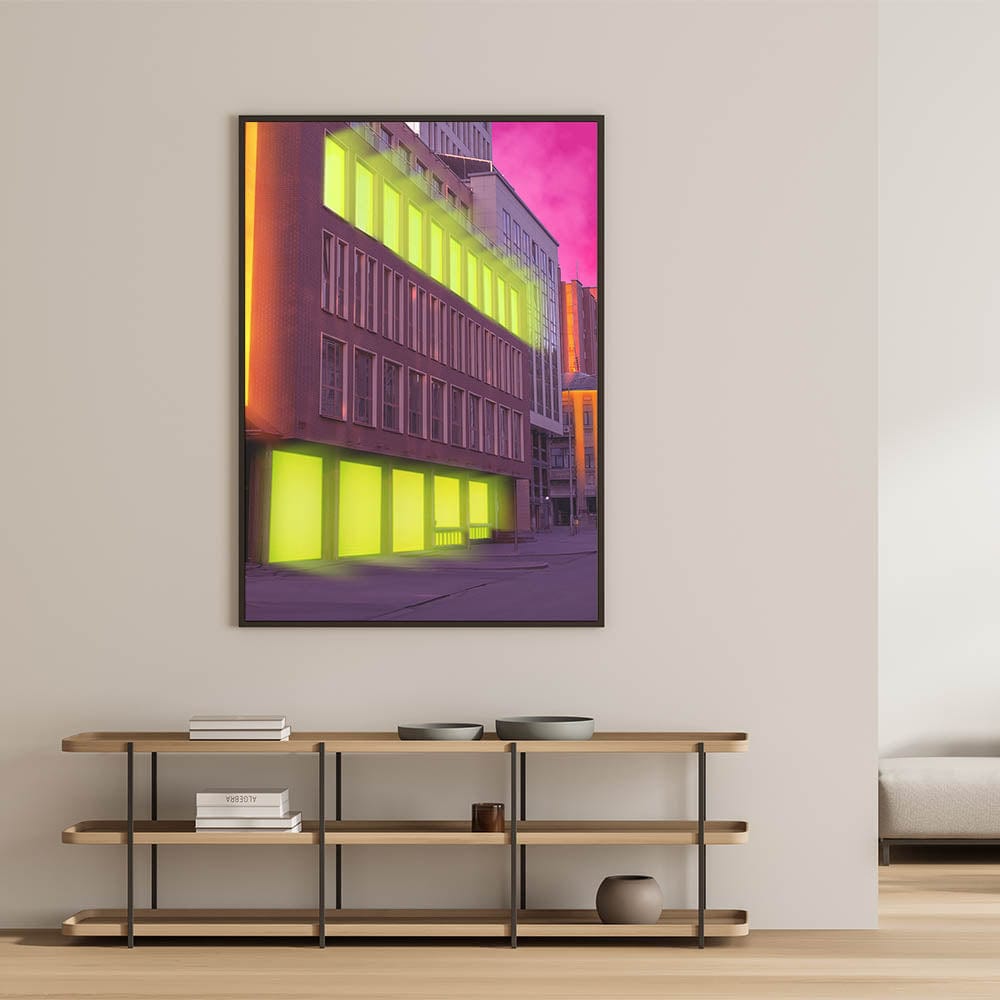 Energize your space with bold color and architectural form through this striking cityscape photography print. Showcasing a glowing fusion of yellow-green windows, orange light accents, and a vivid pink sky, this urban art piece transforms an ordinary city street into a surreal visual experience. A modern expression of urban landscape photography decor, this print captures the vibrance and energy of metropolitan life.