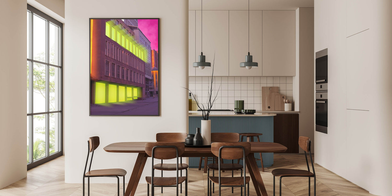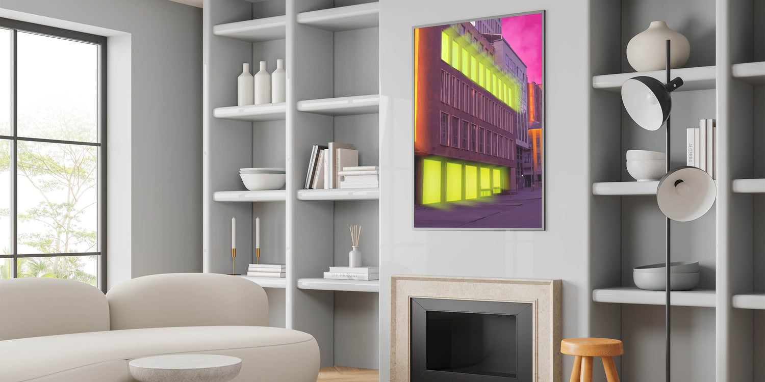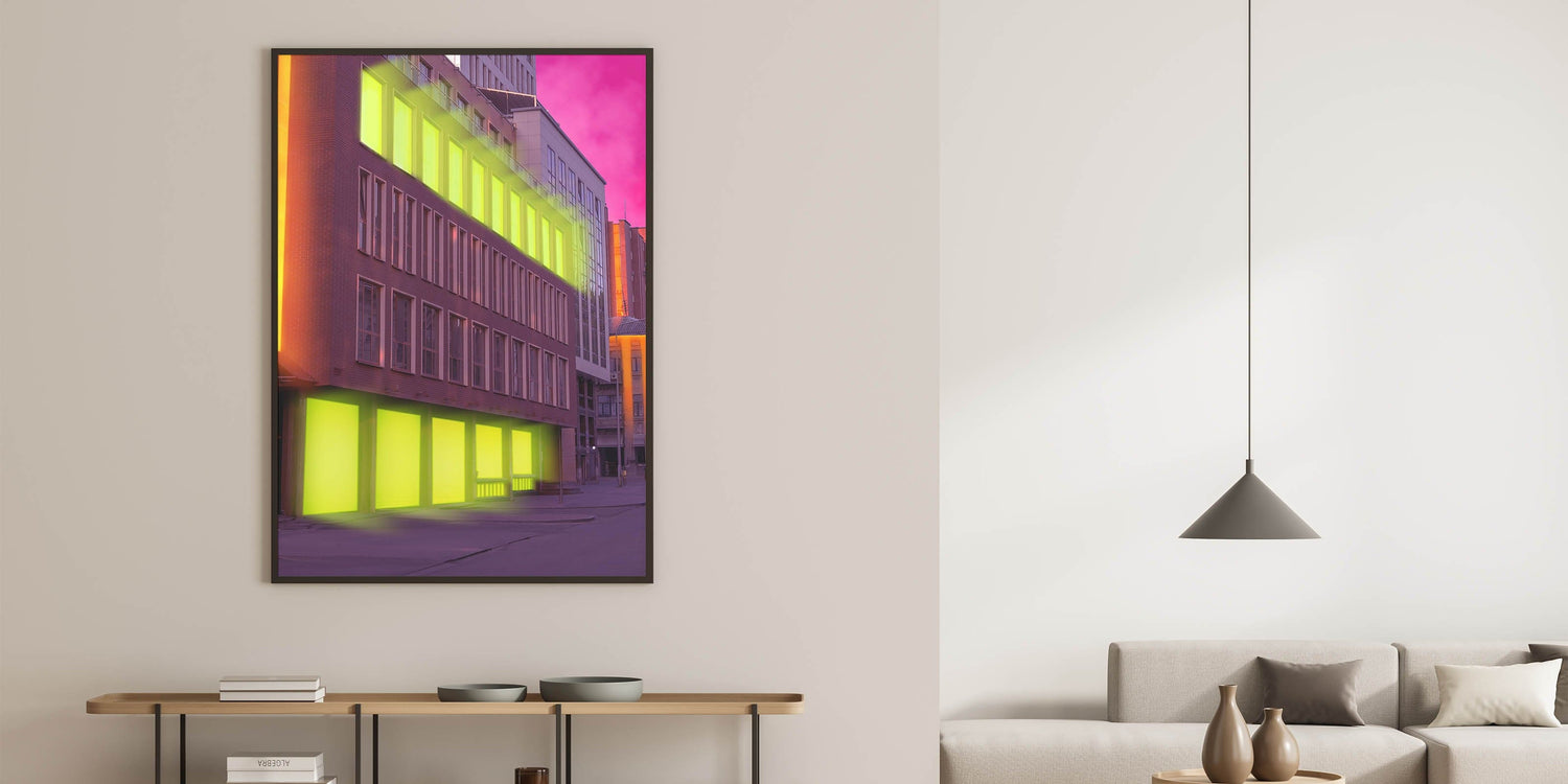 Energize your space with bold color and architectural form through this striking cityscape photography print. Showcasing a glowing fusion of yellow-green windows, orange light accents, and a vivid pink sky, this urban art piece transforms an ordinary city street into a surreal visual experience. A modern expression of urban landscape photography decor, this print captures the vibrance and energy of metropolitan life.