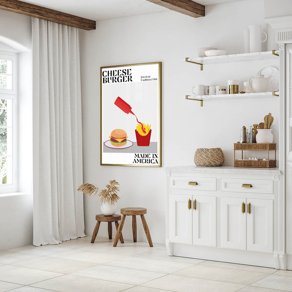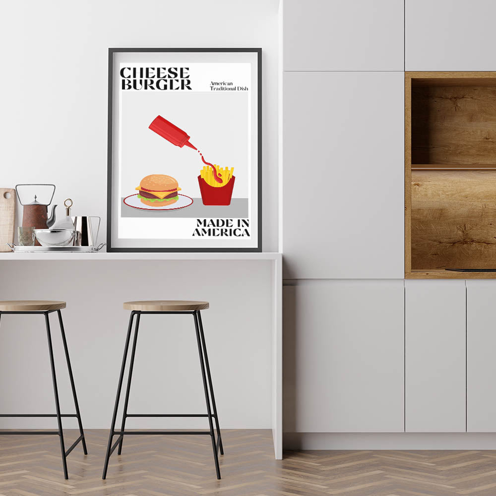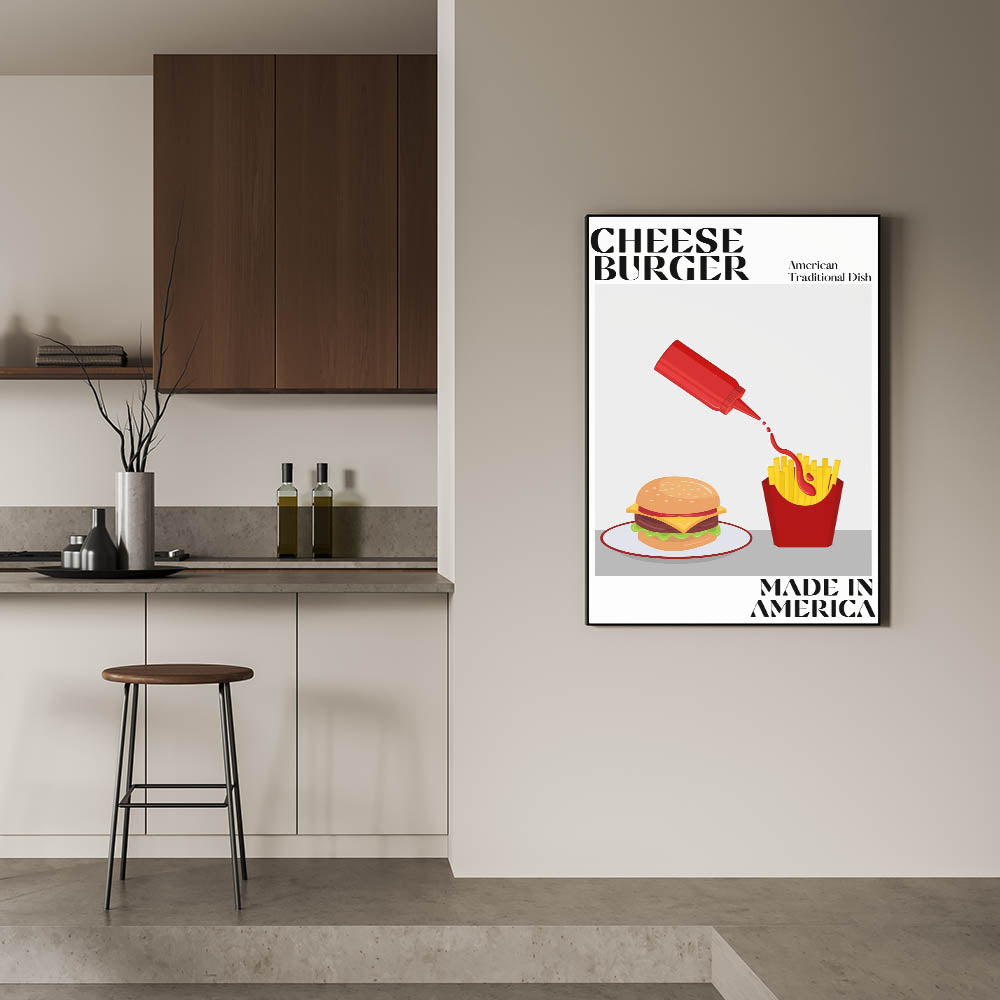 Celebrate American cuisine with this Classic Cheeseburger & Fries Wall Art, a fun and nostalgic addition to kitchen art decor, restaurant walls, or food lovers’ collections. Featuring a delicious cheeseburger, crispy fries, and a ketchup bottle in a playful modern style, this artwork perfectly embodies the essence of American diner culture. Whether you want to add a retro touch to your kitchen or enhance your restaurant’s ambiance, this food-themed art print is a fantastic choice.