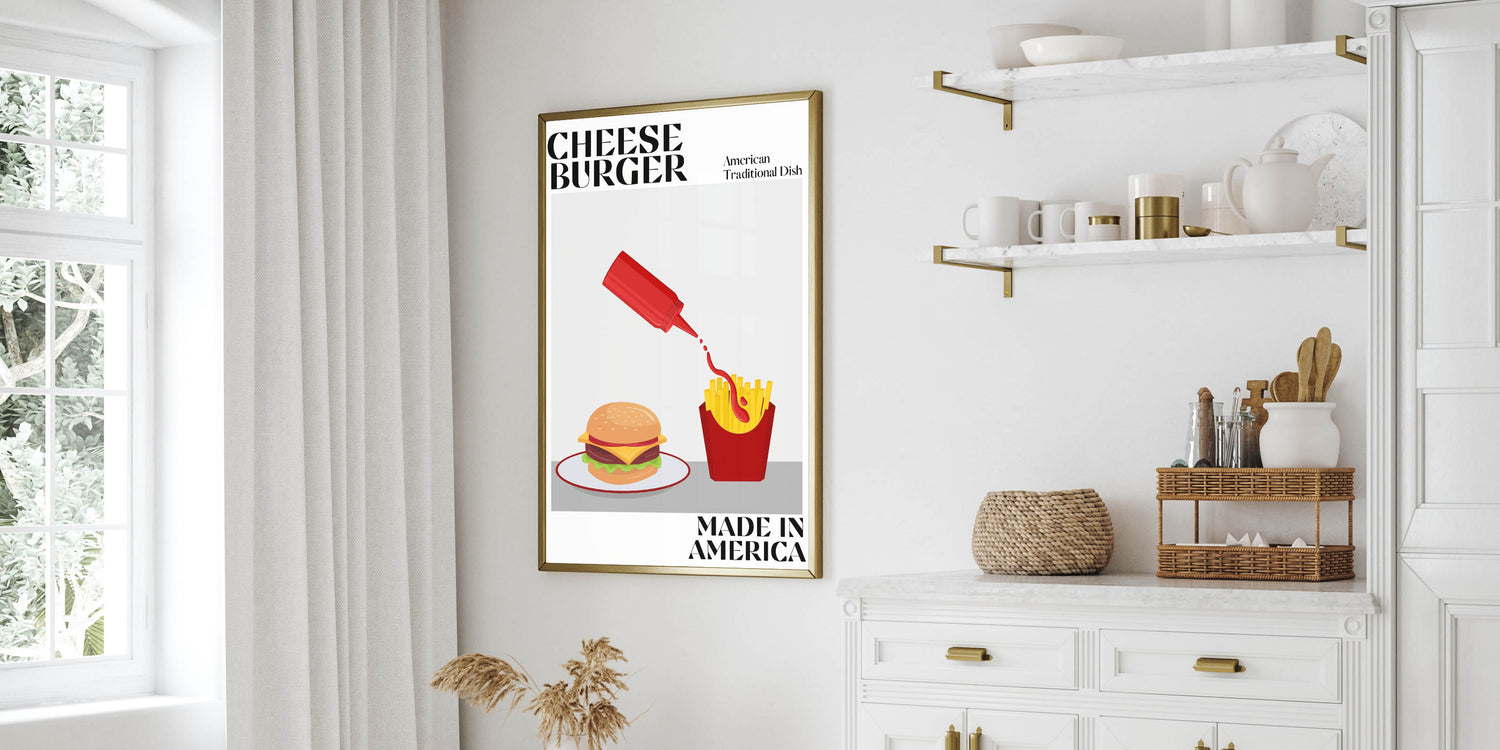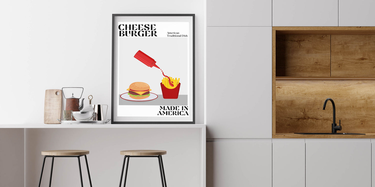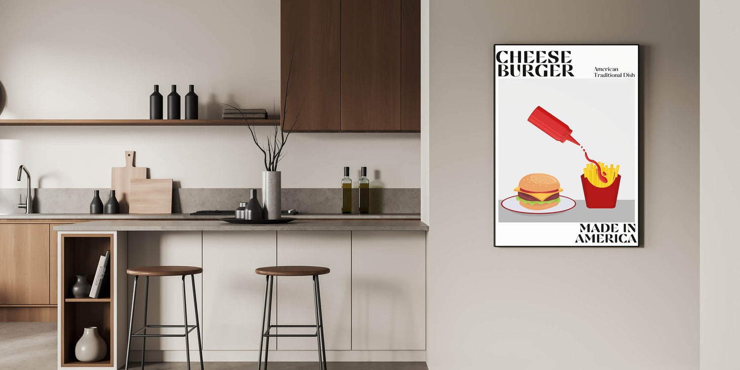 Celebrate American cuisine with this Classic Cheeseburger & Fries Wall Art, a fun and nostalgic addition to kitchen art decor, restaurant walls, or food lovers’ collections. Featuring a delicious cheeseburger, crispy fries, and a ketchup bottle in a playful modern style, this artwork perfectly embodies the essence of American diner culture. Whether you want to add a retro touch to your kitchen or enhance your restaurant’s ambiance, this food-themed art print is a fantastic choice.