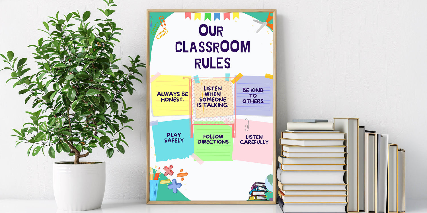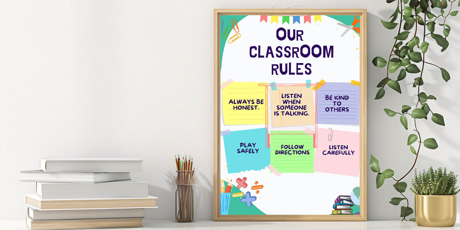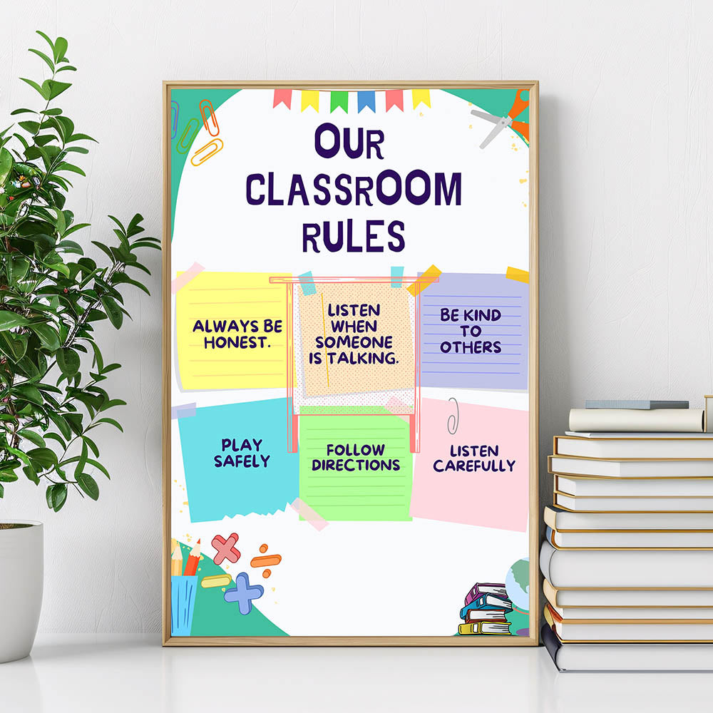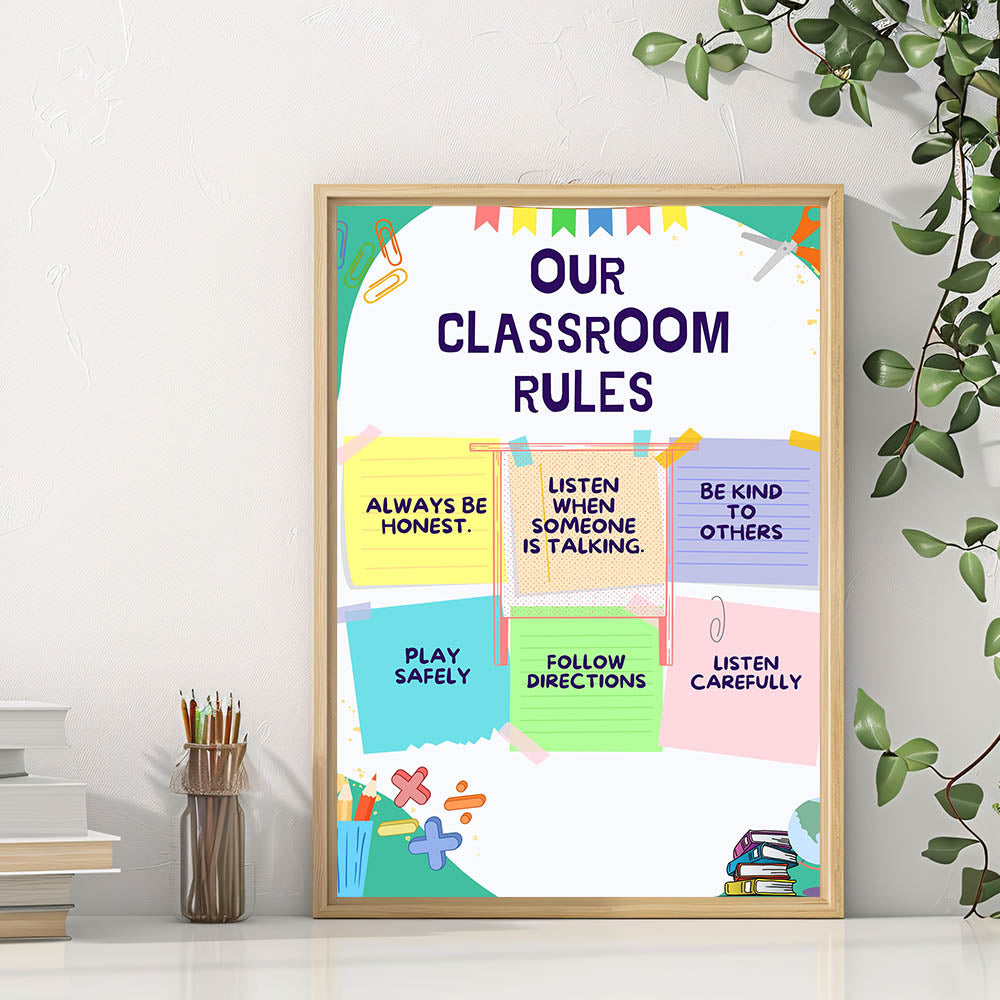 Create a positive and structured learning environment with this Kids Educational Wall Art featuring essential classroom rules. Designed with colorful sticky notes, engaging typography, and fun school-themed elements, this Classroom Educational Poster reinforces values like honesty, kindness, and active listening. Perfect for teachers, parents, and educators looking to encourage a respectful and safe classroom atmosphere.