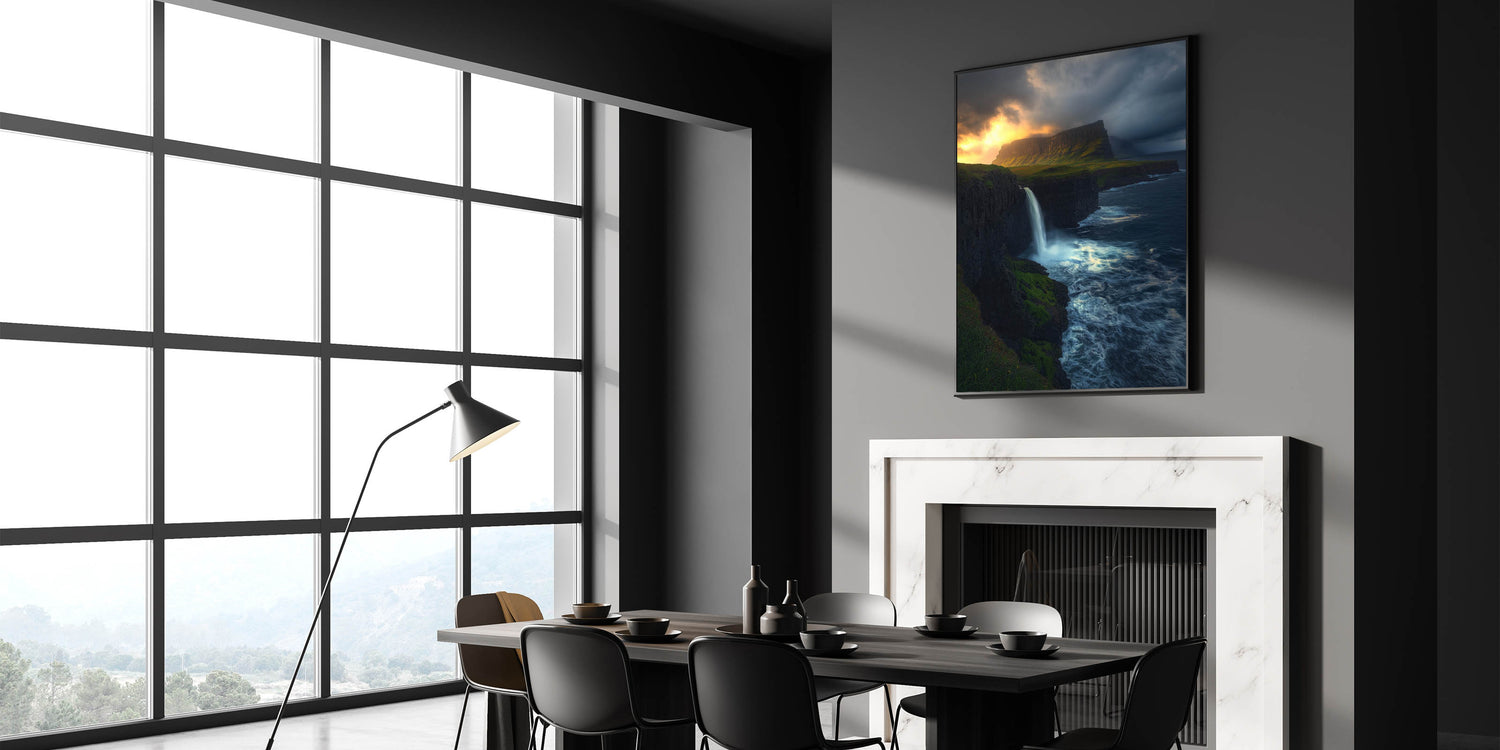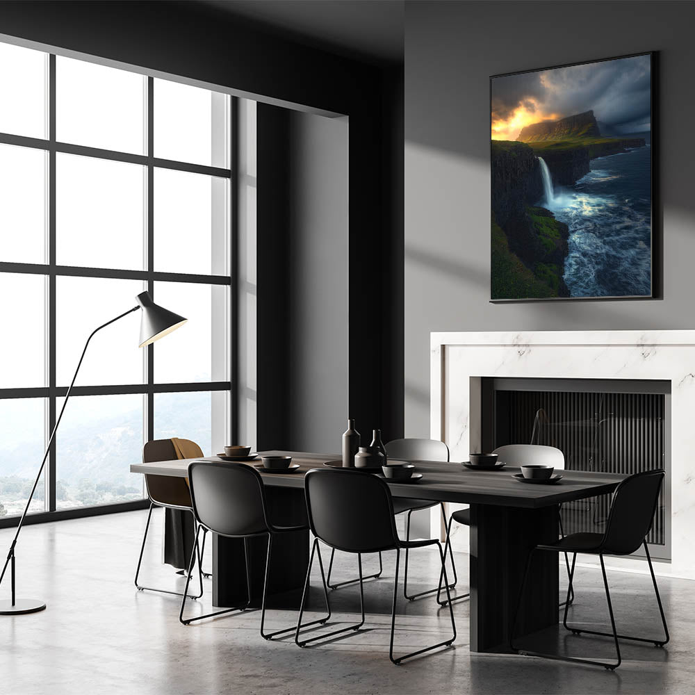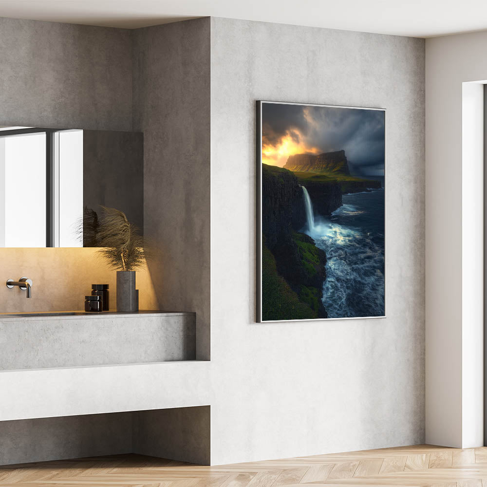 Immerse yourself in the dramatic beauty of nature with this cliffs framed print showcasing a majestic waterfall cascading into the ocean beneath a glowing sunset. The dark cliffs and lush green hills, paired with a moody sky, create a stunning contrast that captures the essence of untamed coastal landscapes.