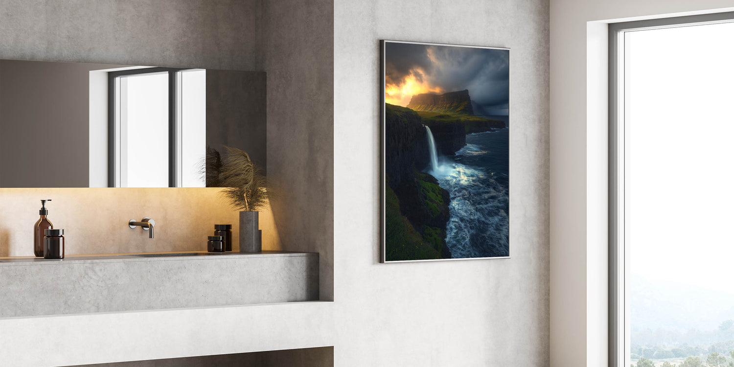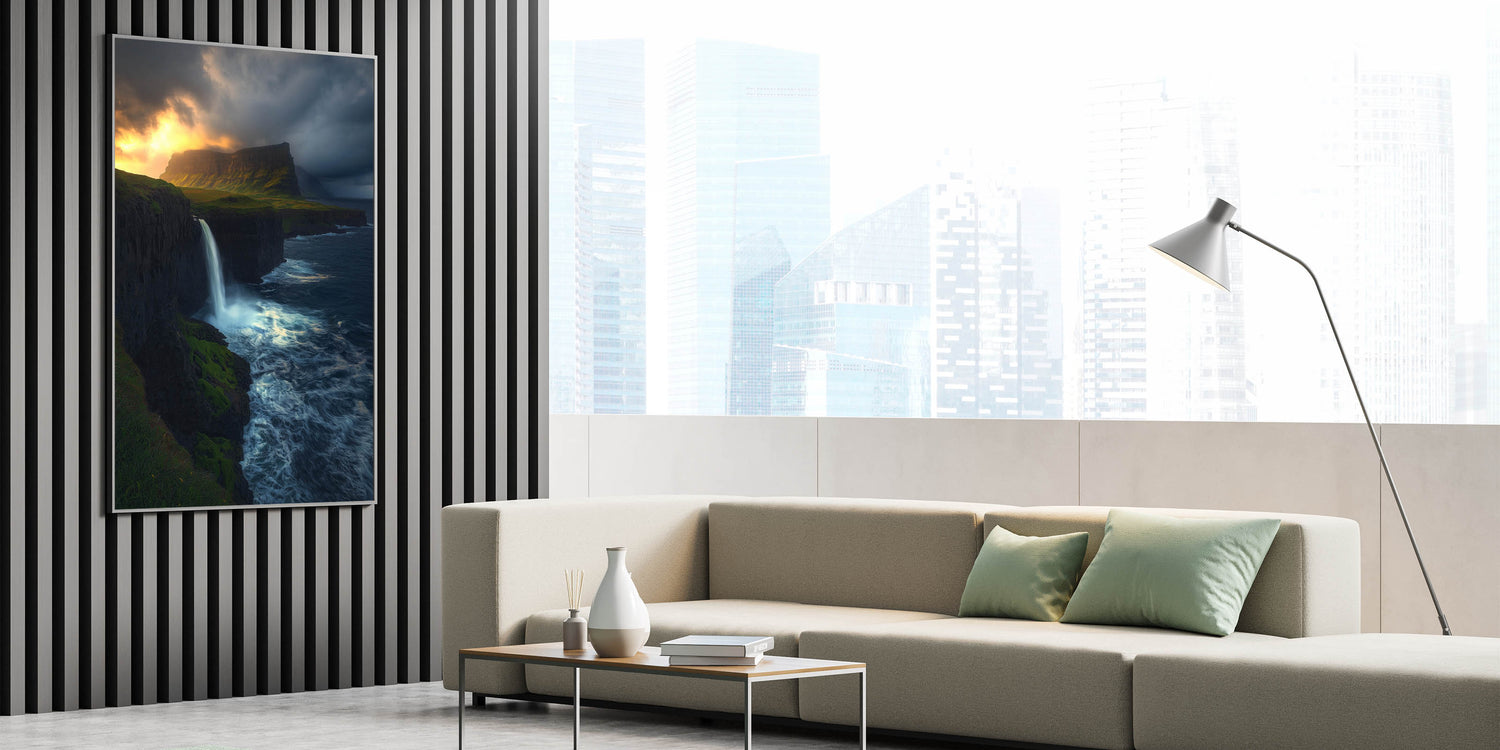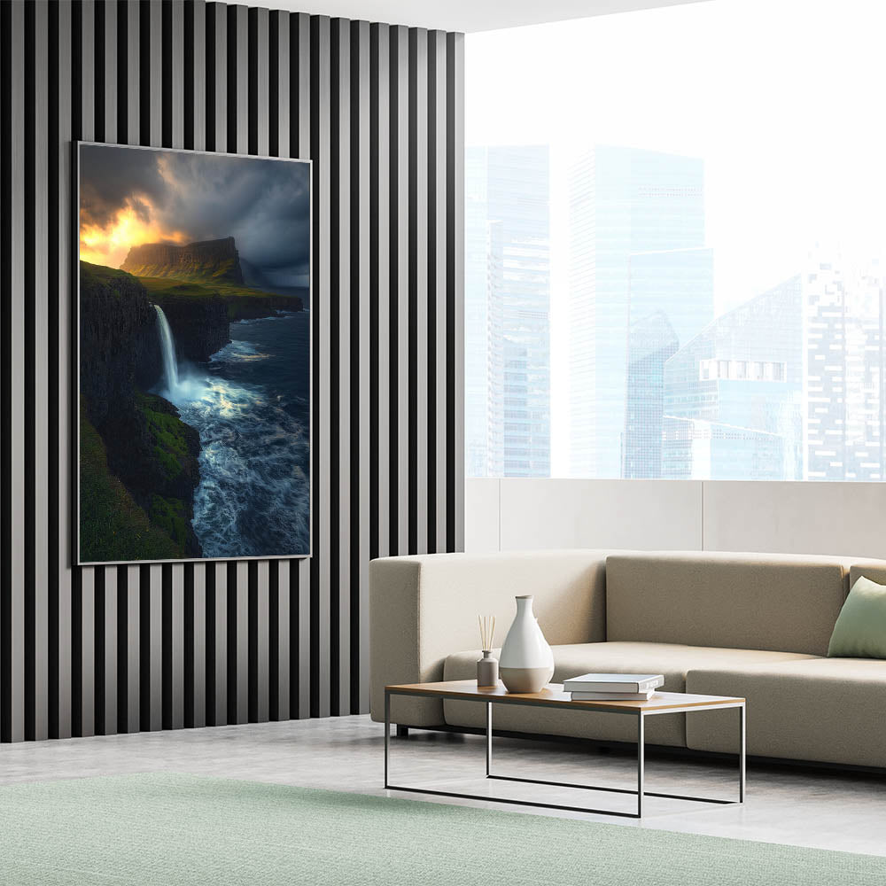 Immerse yourself in the dramatic beauty of nature with this cliffs framed print showcasing a majestic waterfall cascading into the ocean beneath a glowing sunset. The dark cliffs and lush green hills, paired with a moody sky, create a stunning contrast that captures the essence of untamed coastal landscapes.