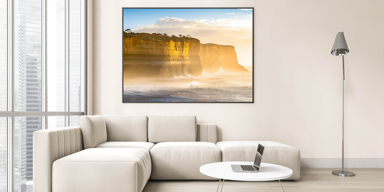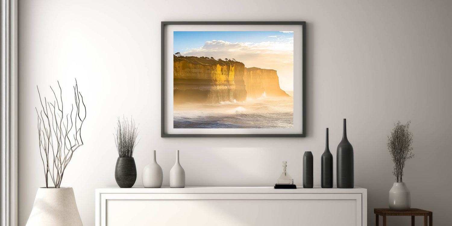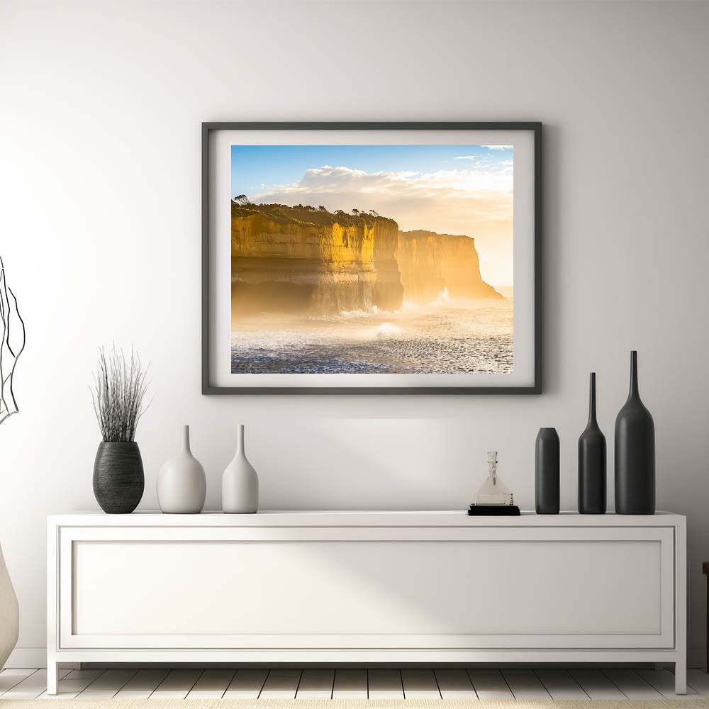 Capture the serene beauty of nature with this cliffs rolled print featuring golden cliffs glowing in soft sunlight, surrounded by ocean mist. The interplay of light, cliffs, and waves creates a tranquil yet dramatic coastal landscape that brings warmth and elegance to any space.
