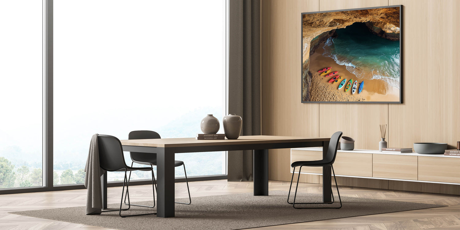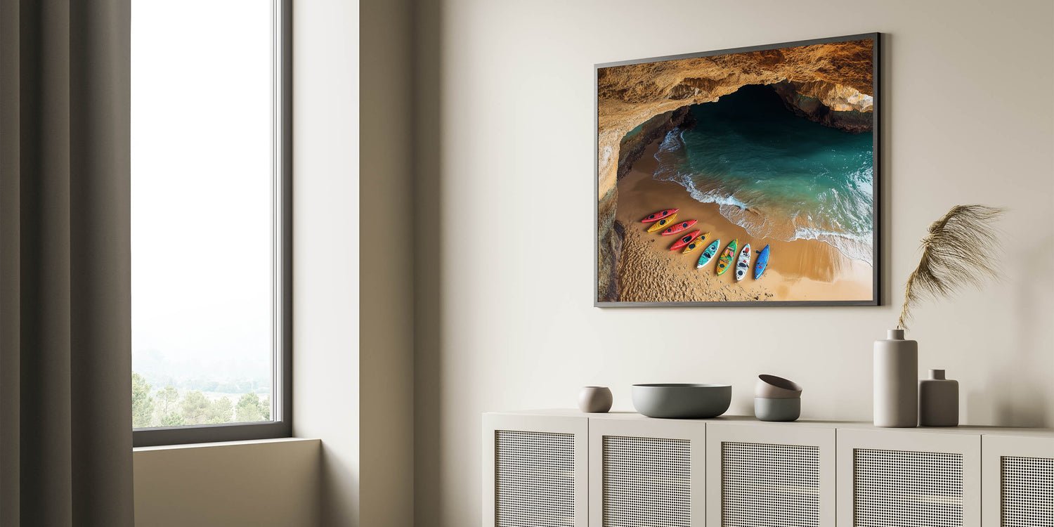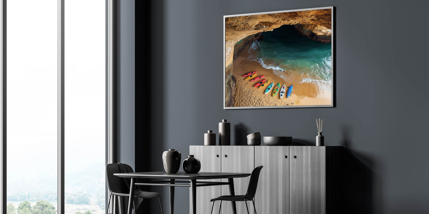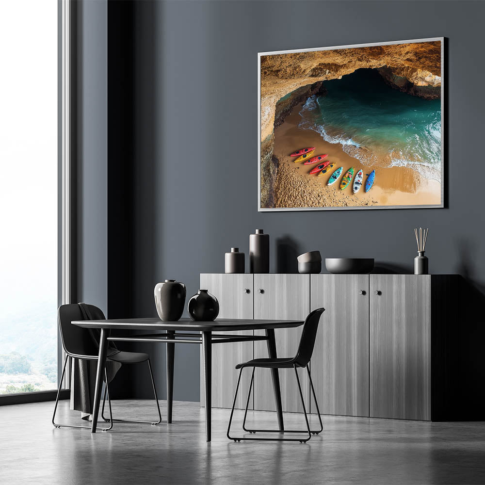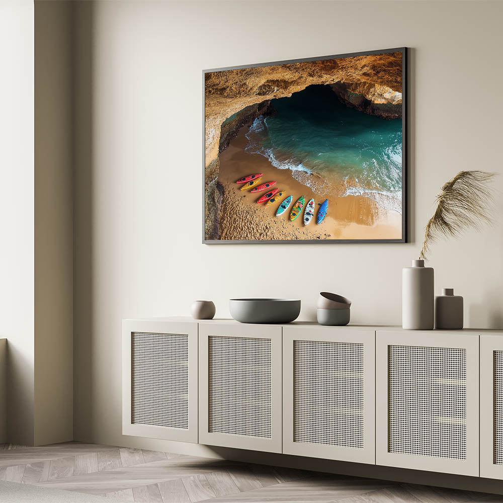 Bring a sense of adventure to your decor with this Cliffs Rolled Print, capturing a stunning coastal cave opening to a peaceful beach. Vibrant kayaks rest on the golden sand, set against emerald waters and illuminated by the warm glow of the cave walls. This artwork is perfect for anyone who loves unique, nature-inspired scenes.
