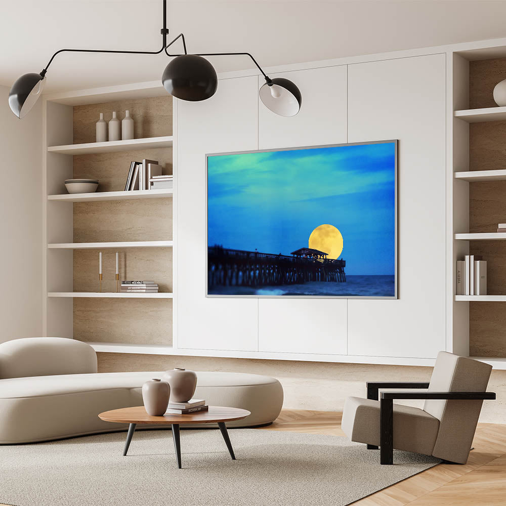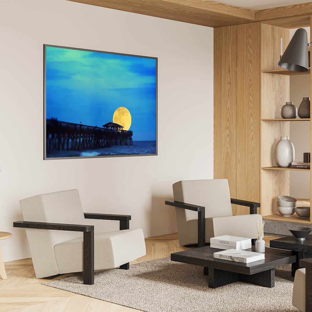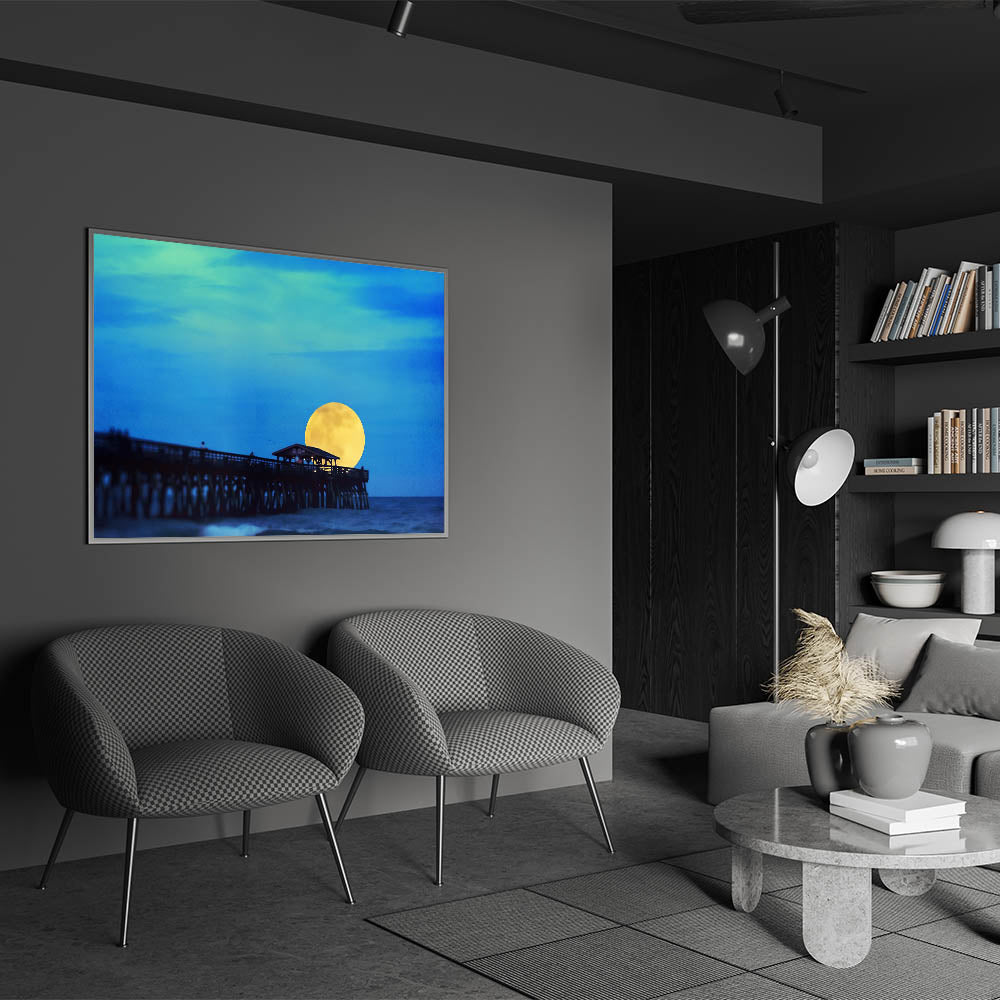 Illuminate your home with this mesmerizing Hilton Head art print, showcasing the enchanting moonrise over the famous Folly Beach Pier. This unique South Carolina wall art captures the serene beauty of the Lowcountry, with a glowing yellow moon rising against the rich blue night sky. Whether you’re a fan of coastal landscapes of South Carolina or looking for stunning Lowcountry art pieces, this high-quality canvas print will bring the tranquil essence of the Palmetto State right into your space.